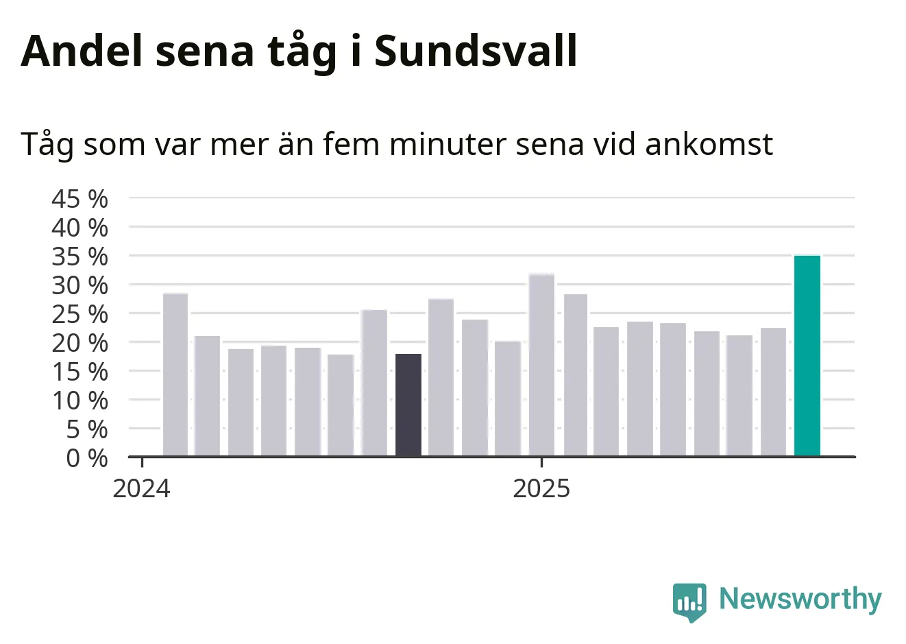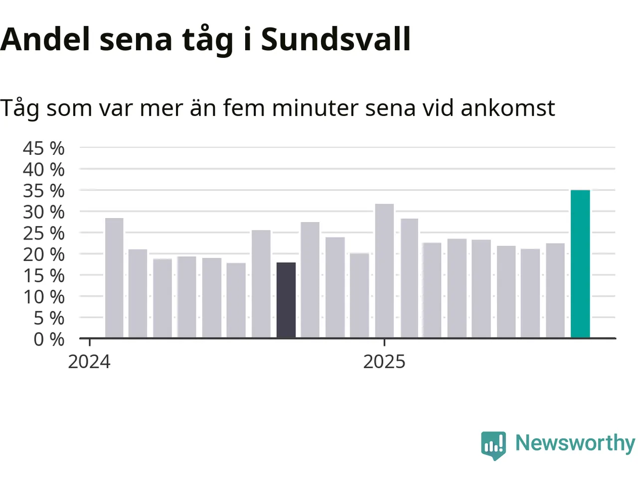 Av omkring 1 400 tåg som passerade någon av stationerna i Sundsvalls kommun i september var 483 mer än fem minuter sena. Det motsvarar 35 procent, en bra bit över den nationella målsättningen som säger att inte mer än fem procent av tågen ska vara sena.