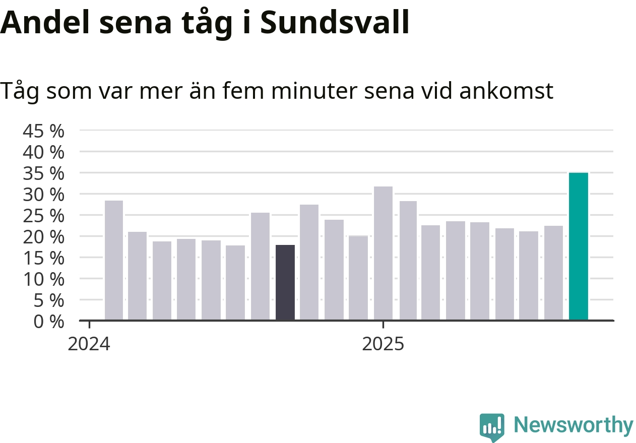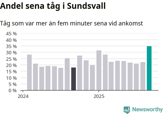 Andelen sena tåg vid stationerna i Sundsvalls kommun steg förra månaden, till den högsta noteringen sedan åtminstone förra årsskiftet.