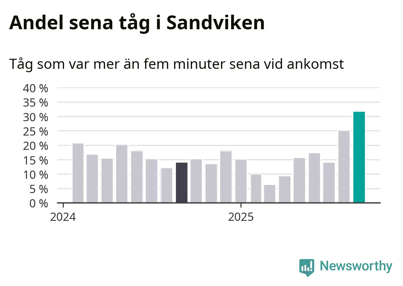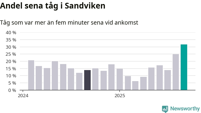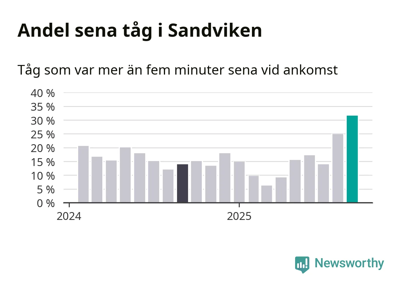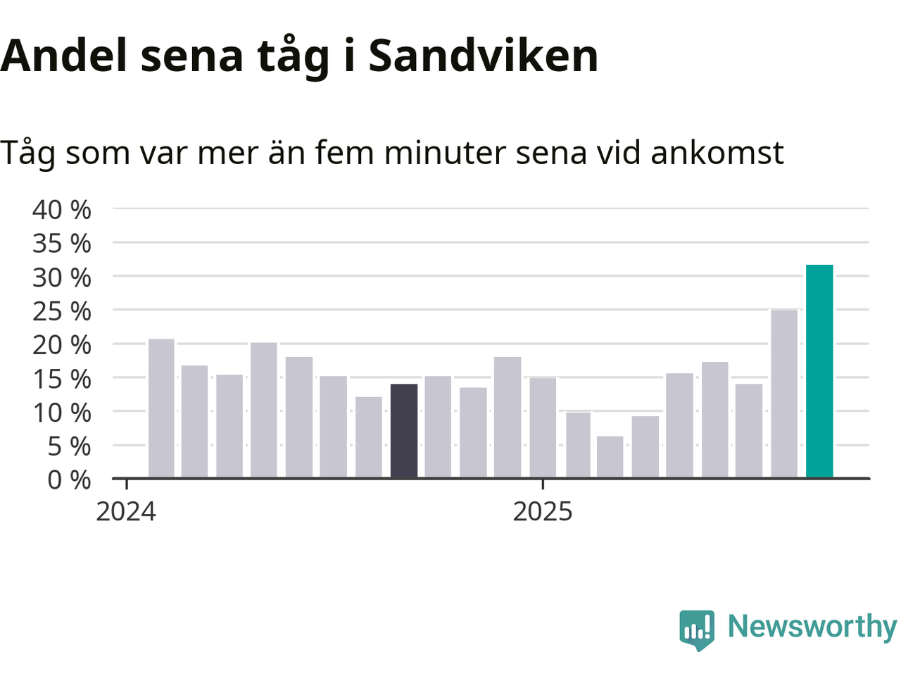 32 procent är den högsta andelen sena tåg sedan åtminstone den hårt förseningsdrabbade vintern 2023/24. Siffrorna bygger på realtidsinformation om tågavgångar och ankomster från Trafikverket, som Newsworthy löpande samlar in.