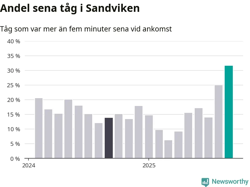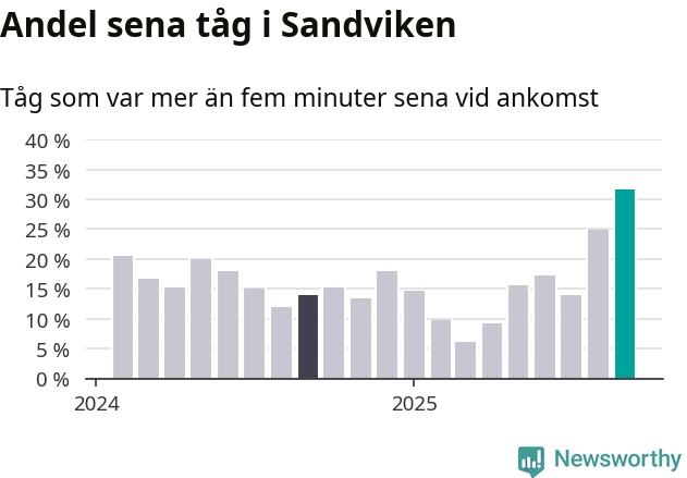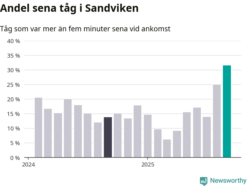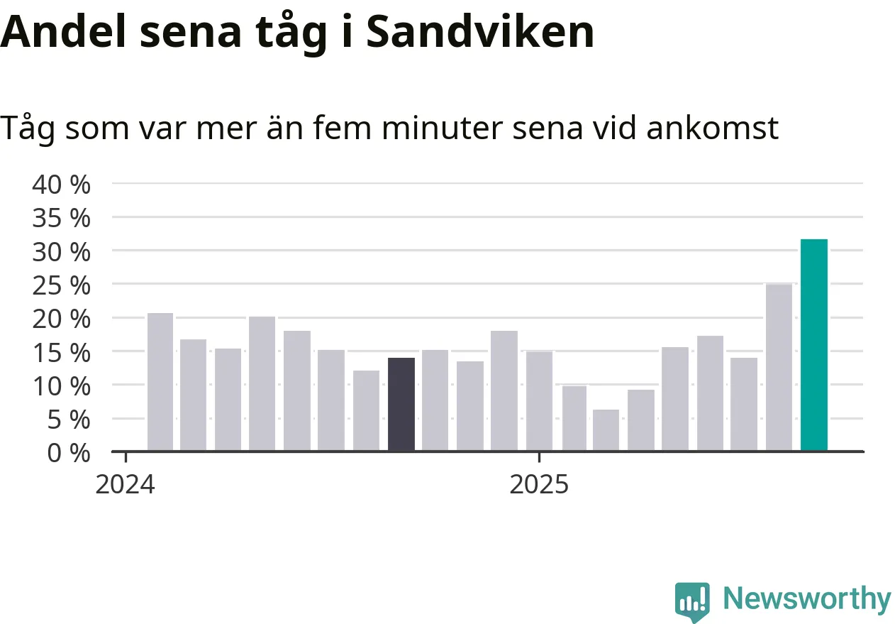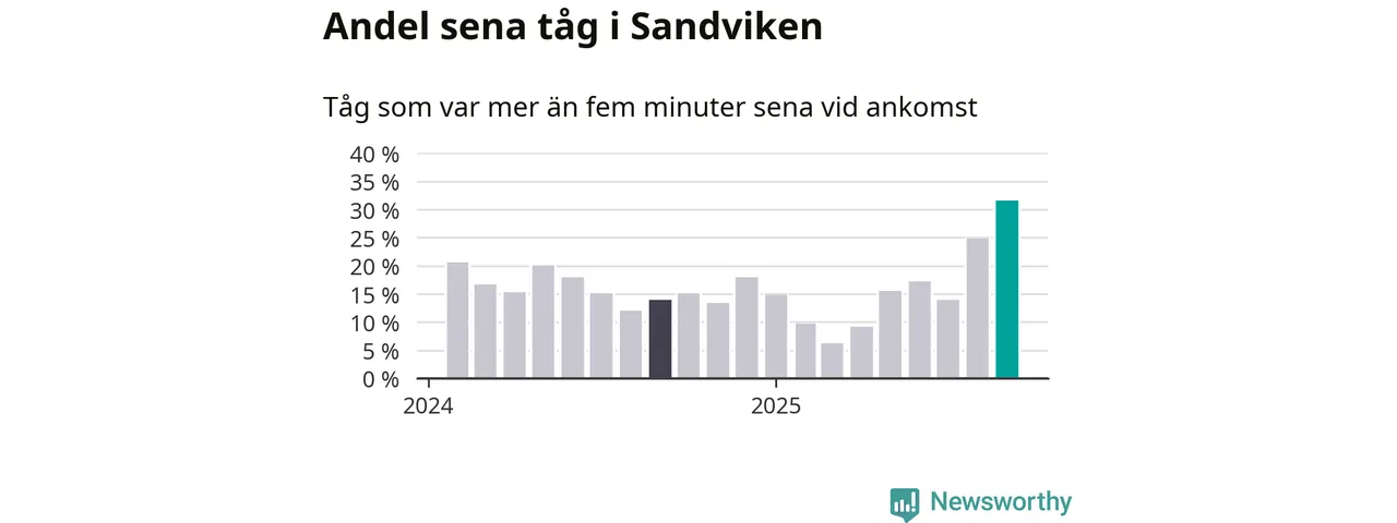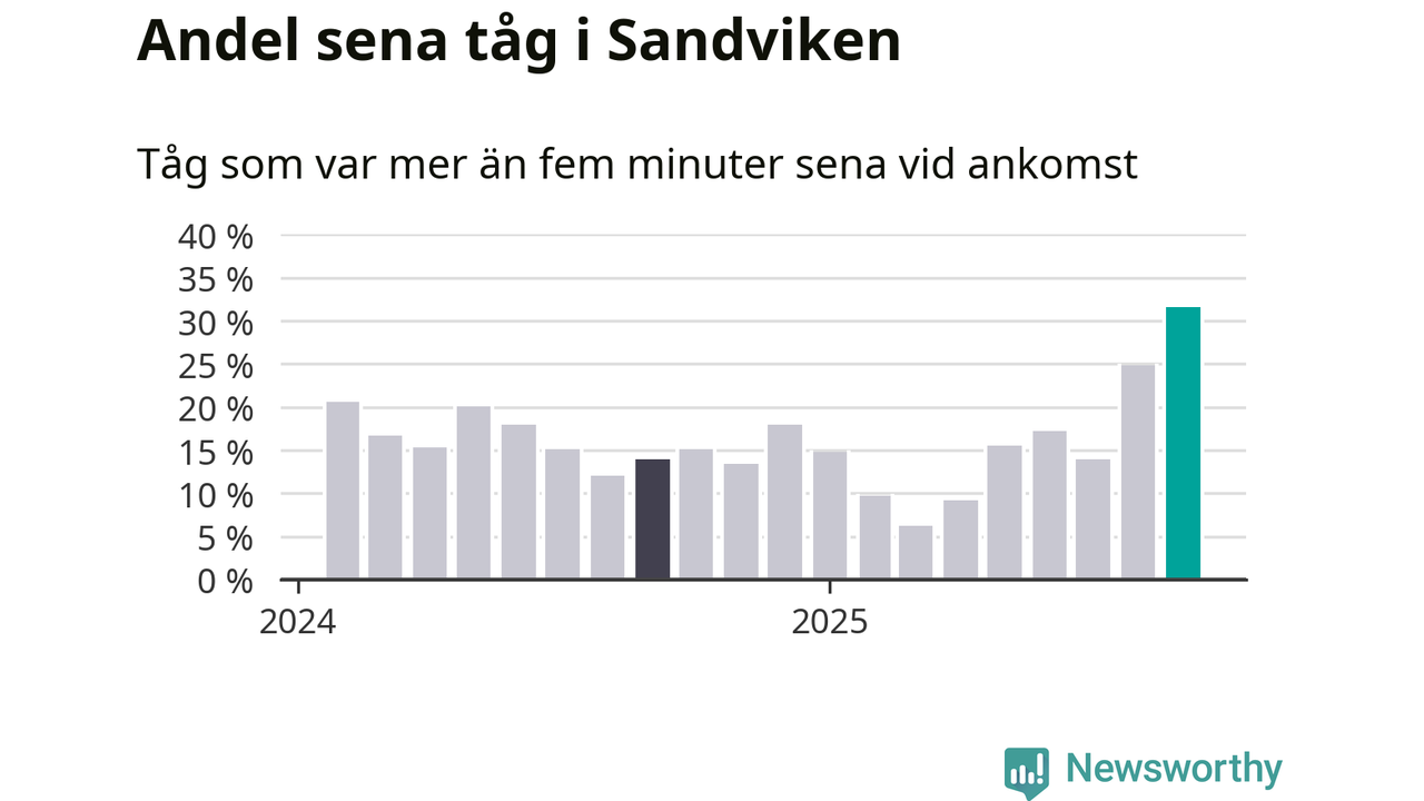 32 procent är den högsta andelen sena tåg sedan åtminstone den hårt förseningsdrabbade vintern 2023/24. Siffrorna bygger på realtidsinformation om tågavgångar och ankomster från Trafikverket, som Newsworthy löpande samlar in.