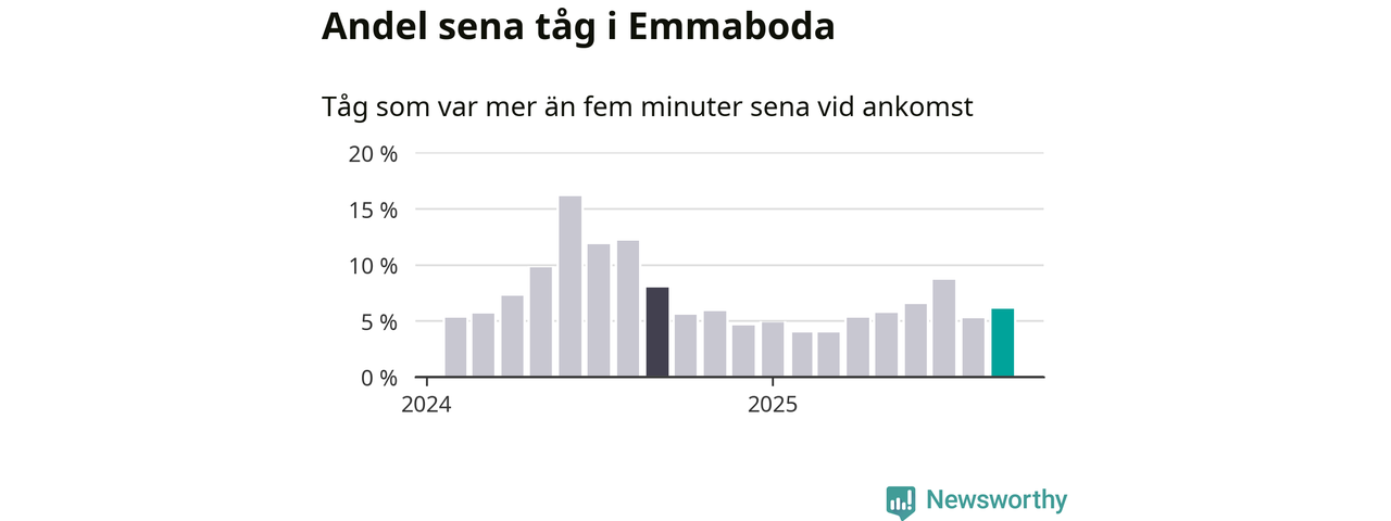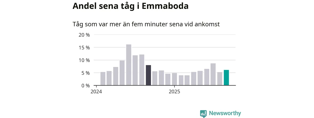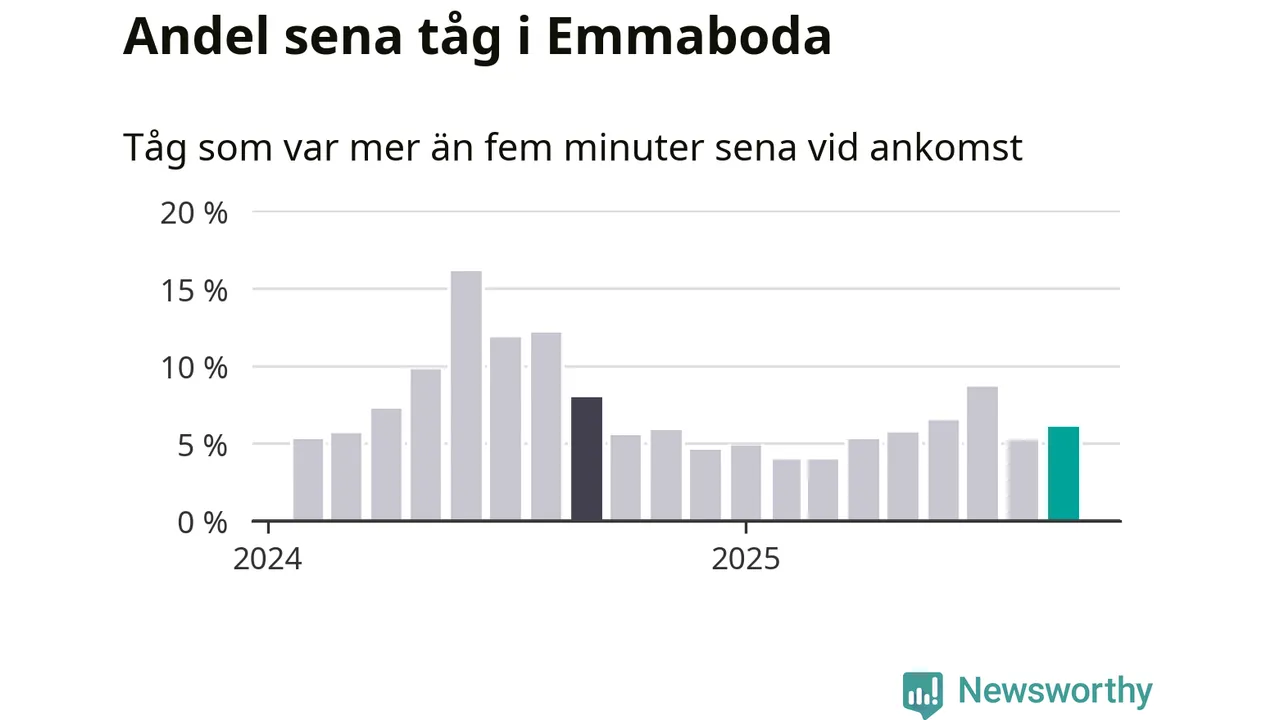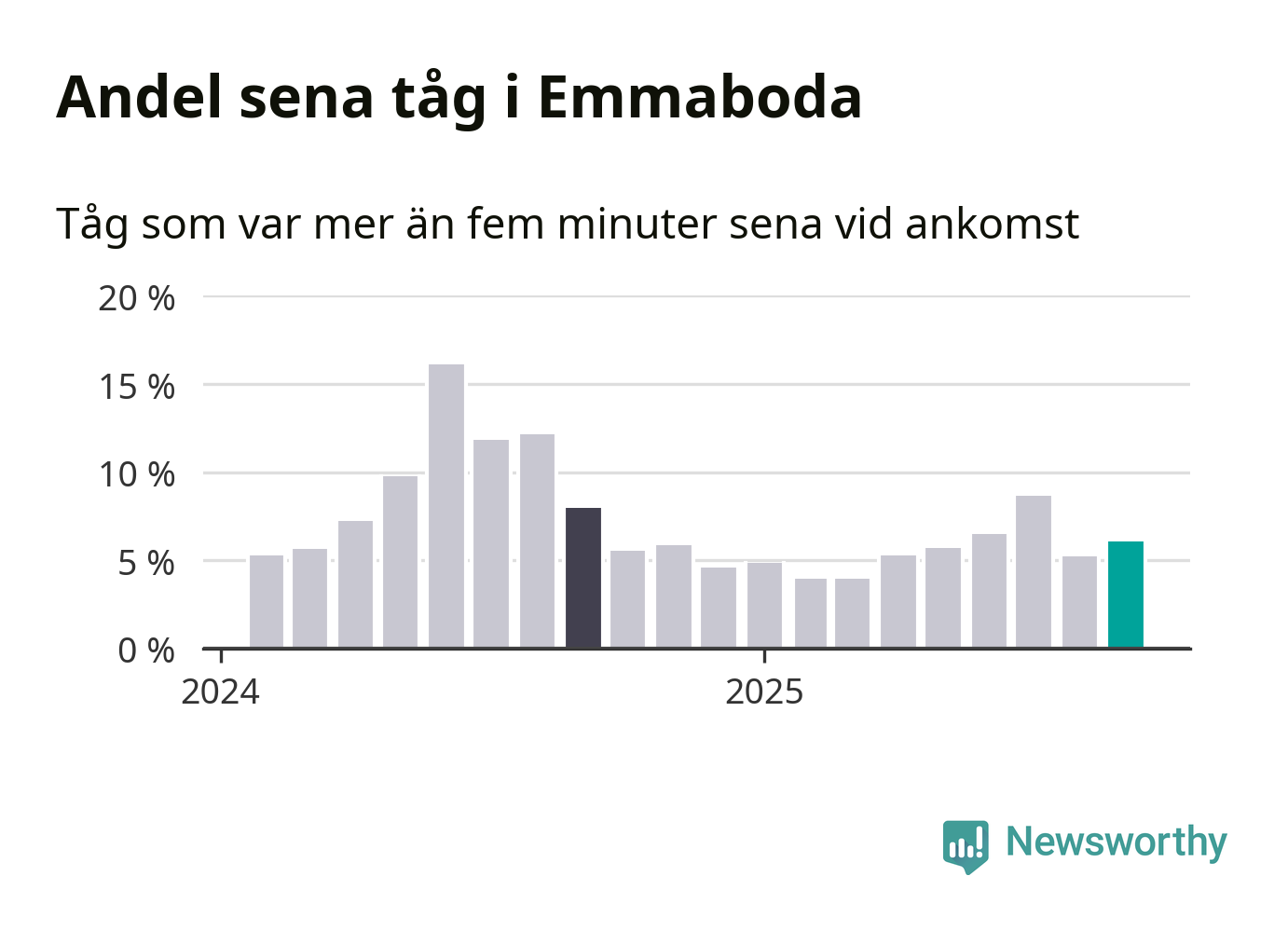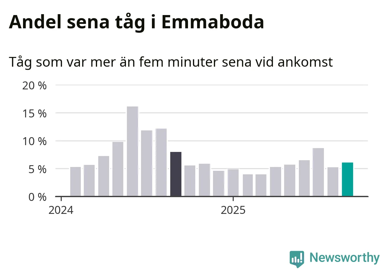 Sex procent kan jämföras med fem procent månaden innan, och åtta procent i september 2024. Siffrorna bygger på realtidsinformation om tågavgångar och ankomster från Trafikverket, som Newsworthy löpande samlar in.
