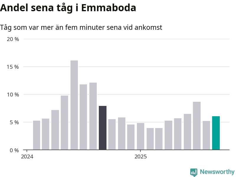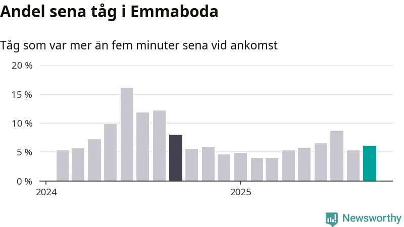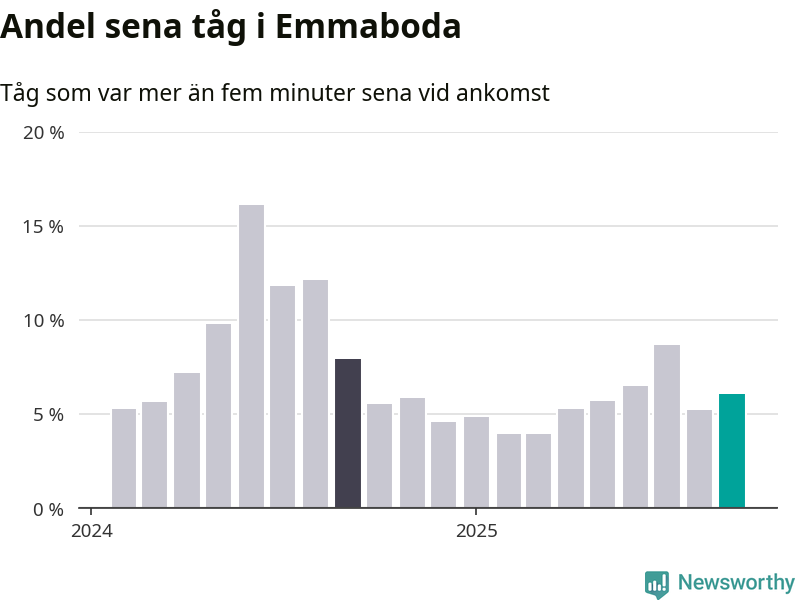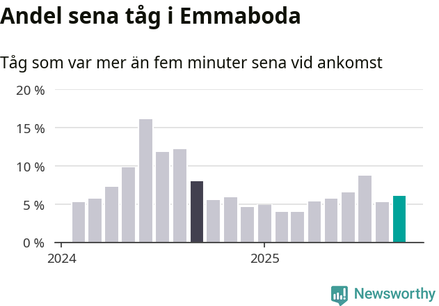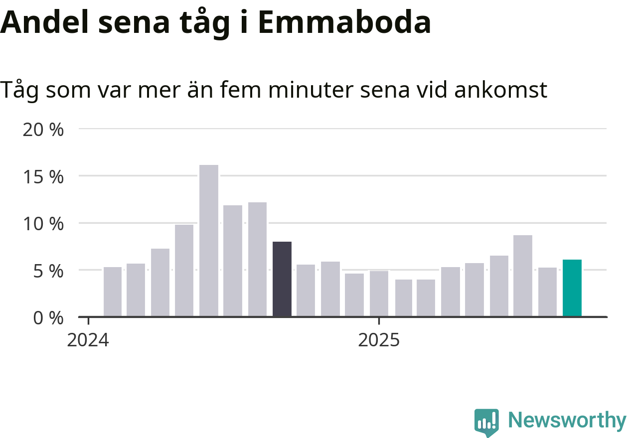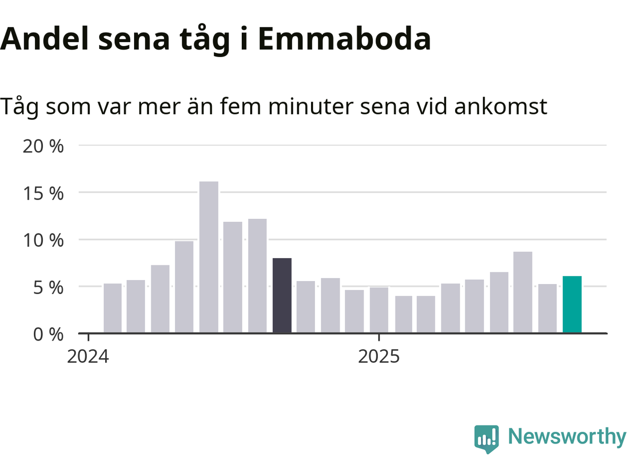 Sex procent kan jämföras med fem procent månaden innan, och åtta procent i september 2024. Siffrorna bygger på realtidsinformation om tågavgångar och ankomster från Trafikverket, som Newsworthy löpande samlar in.