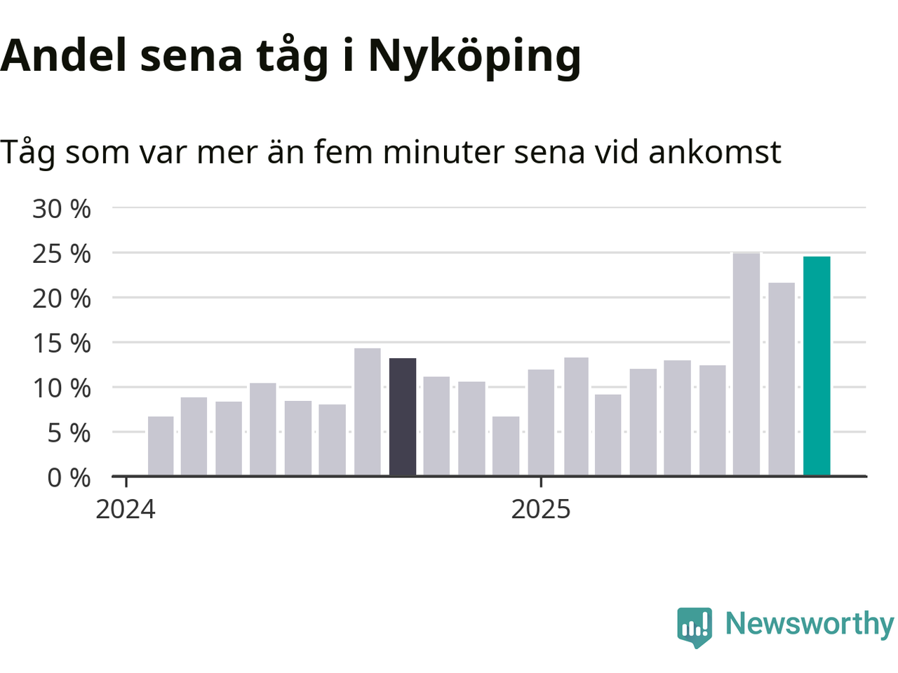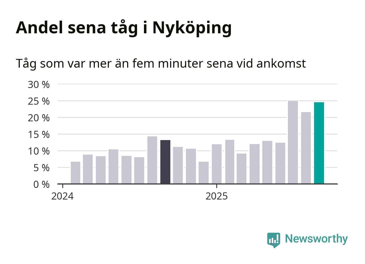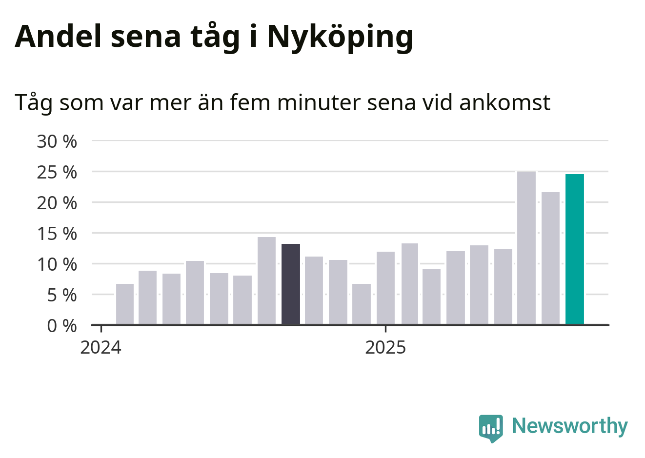 24 procent kan jämföras med 22 procent månaden innan, och 13 procent i september 2024. Siffrorna bygger på realtidsinformation om tågavgångar och ankomster från Trafikverket, som Newsworthy löpande samlar in.