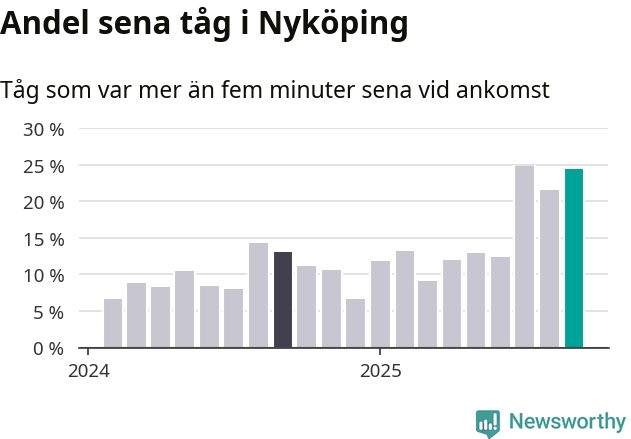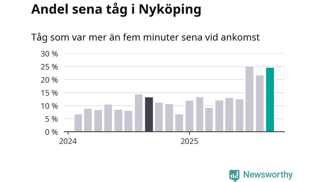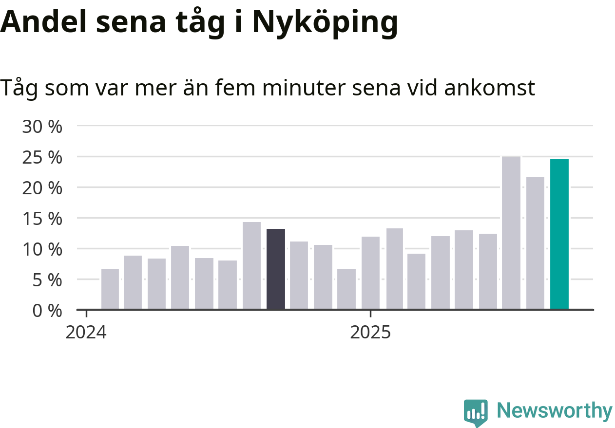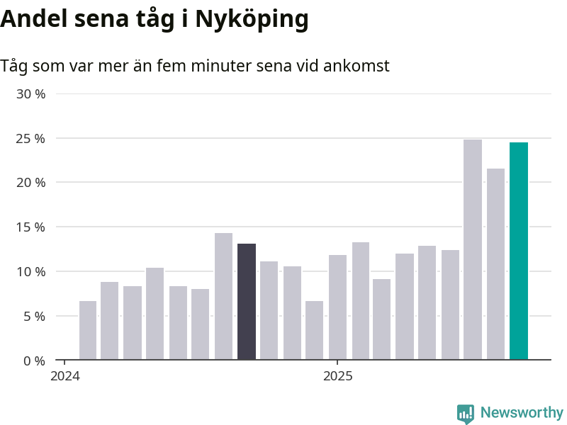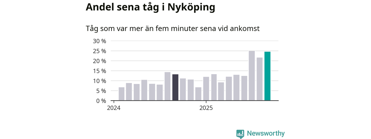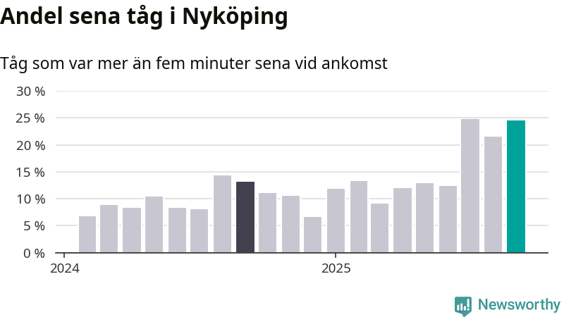 24 procent kan jämföras med 22 procent månaden innan, och 13 procent i september 2024. Siffrorna bygger på realtidsinformation om tågavgångar och ankomster från Trafikverket, som Newsworthy löpande samlar in.
