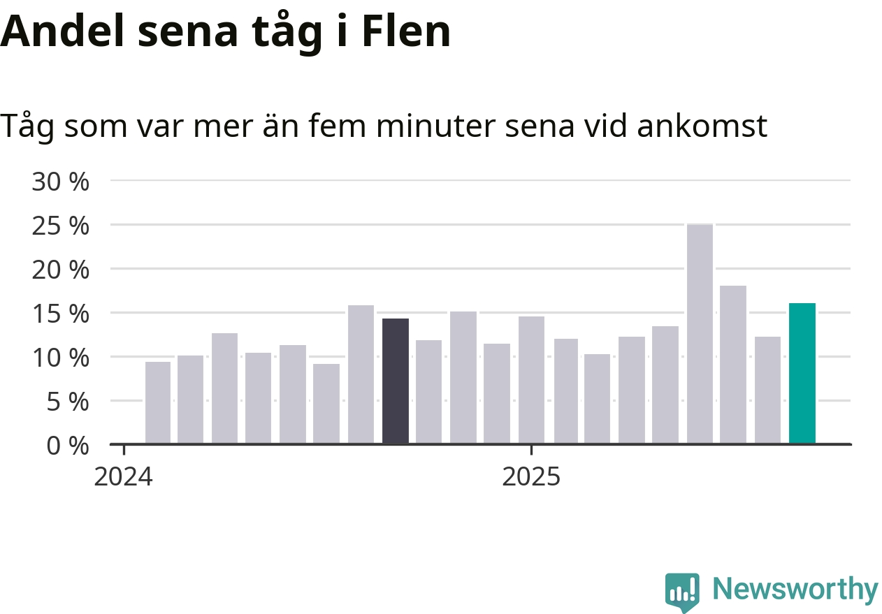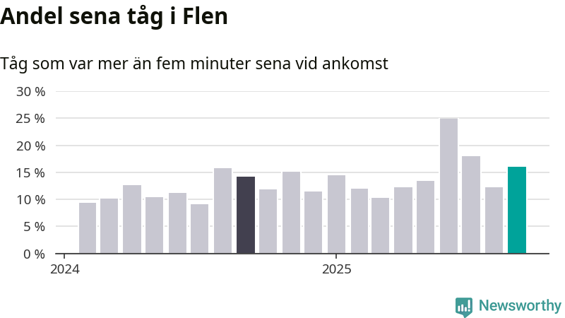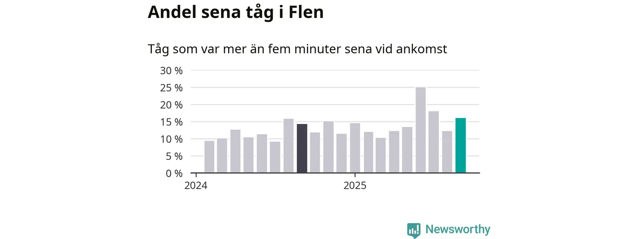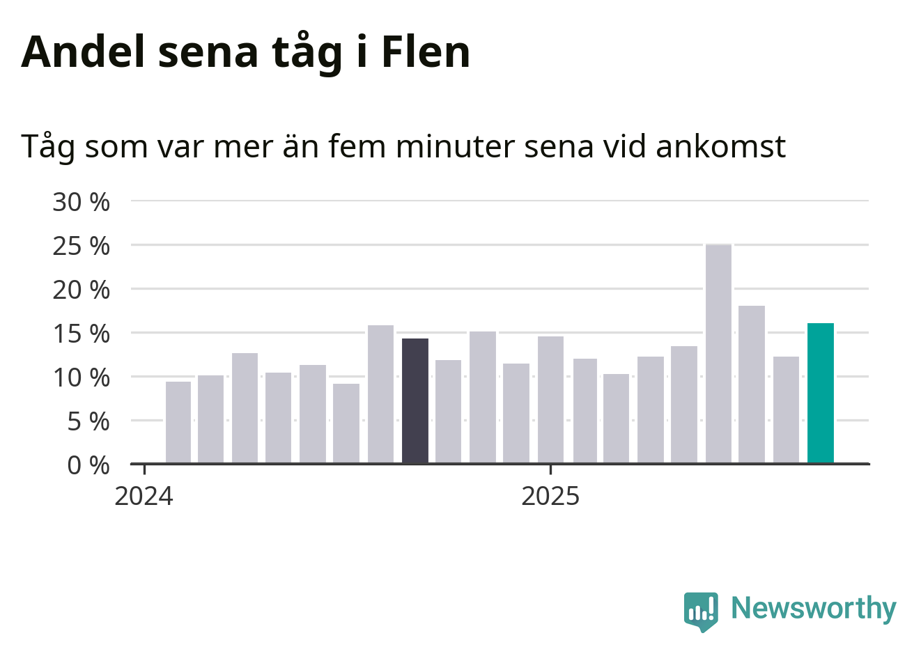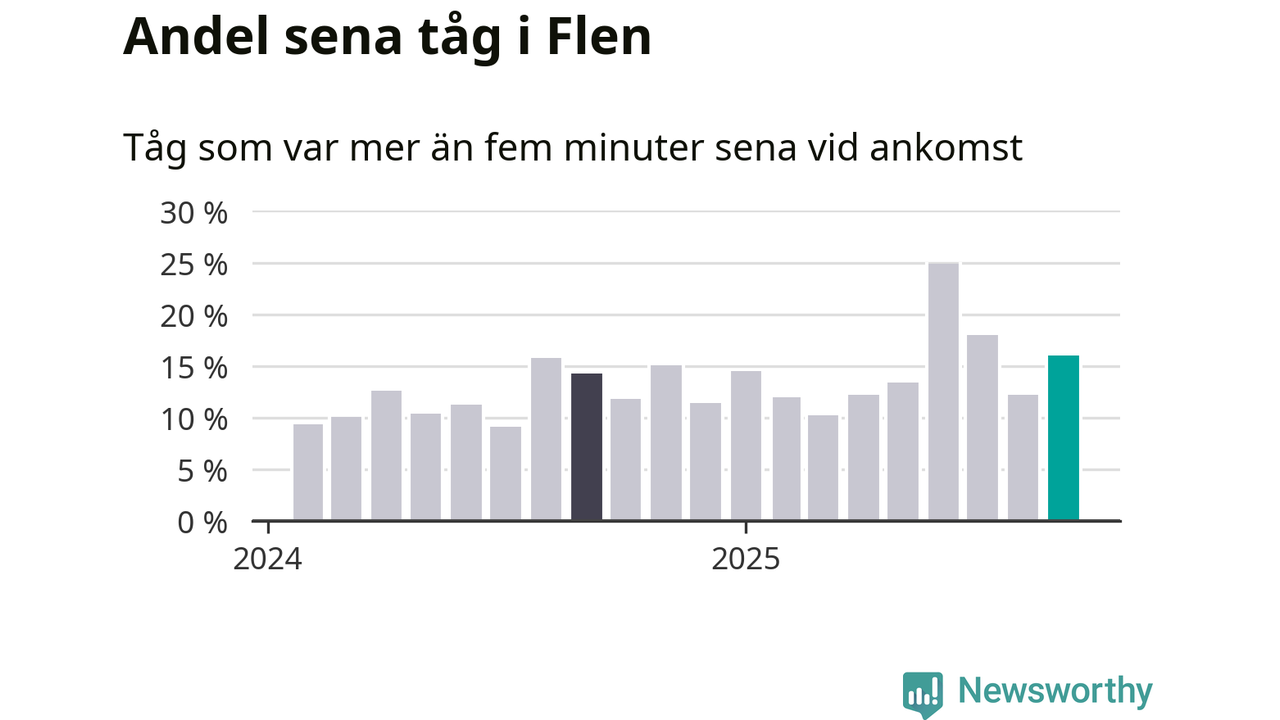 16 procent kan jämföras med tolv procent månaden innan, och 14 procent i september 2024. Siffrorna bygger på realtidsinformation om tågavgångar och ankomster från Trafikverket, som Newsworthy löpande samlar in.
