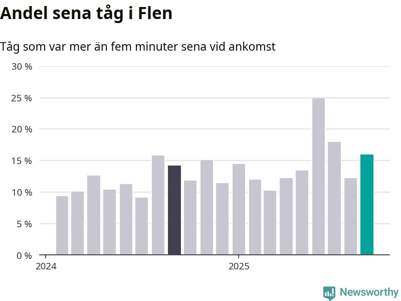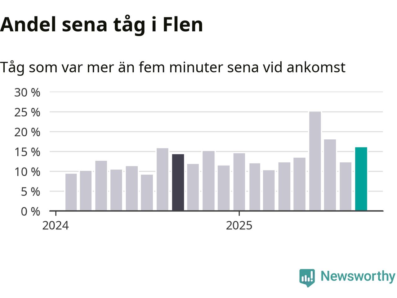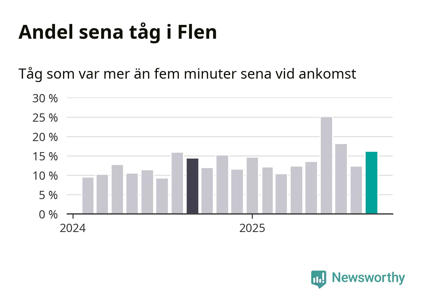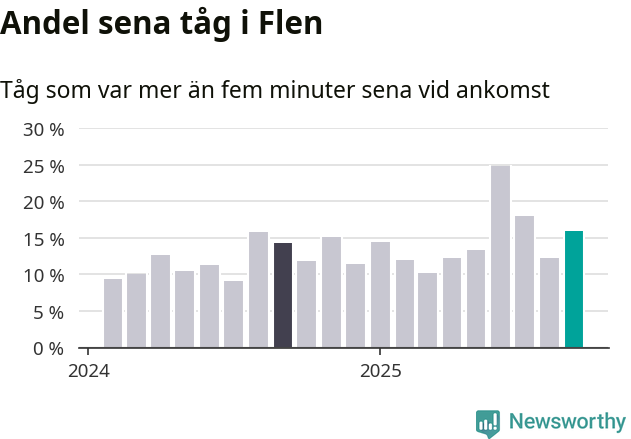 16 procent kan jämföras med tolv procent månaden innan, och 14 procent i september 2024. Siffrorna bygger på realtidsinformation om tågavgångar och ankomster från Trafikverket, som Newsworthy löpande samlar in.