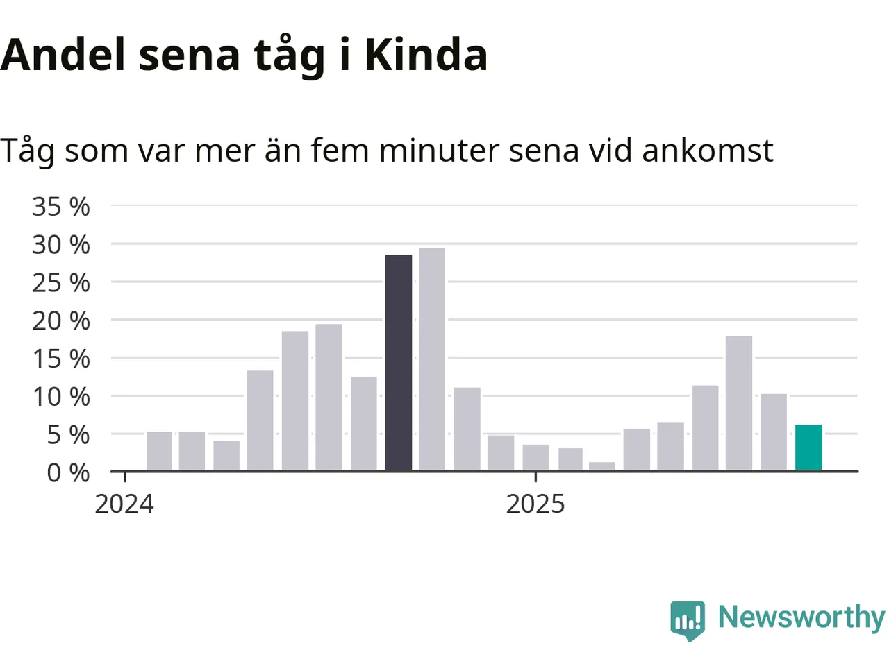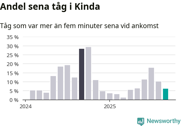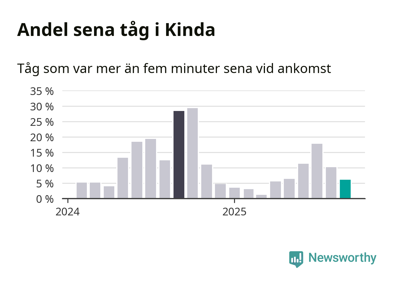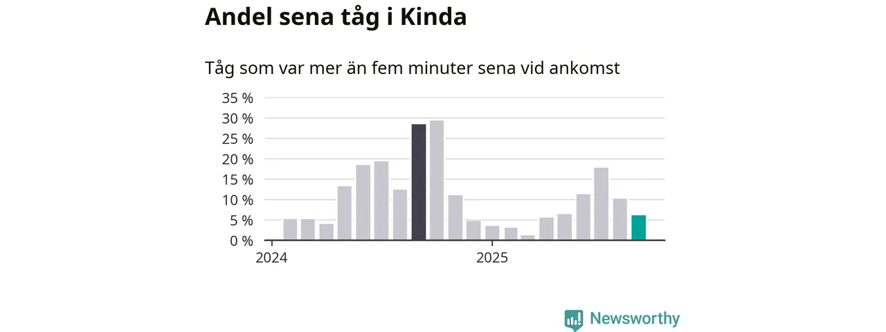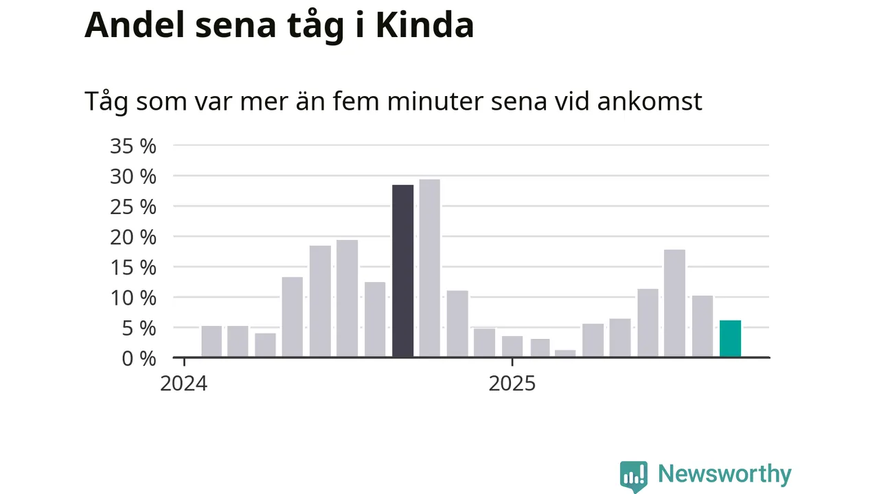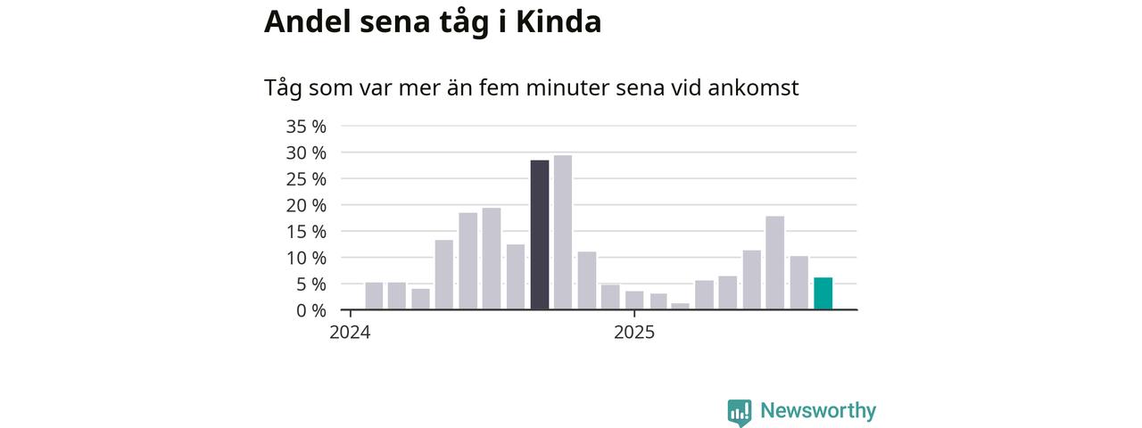 Sex procent kan jämföras med tio procent månaden innan, och 28 procent i september 2024. Siffrorna bygger på realtidsinformation om tågavgångar och ankomster från Trafikverket, som Newsworthy löpande samlar in.