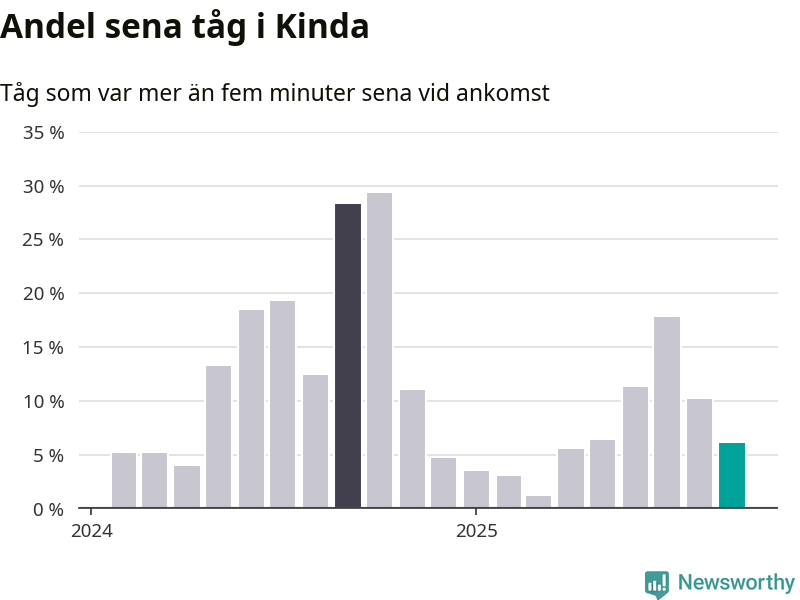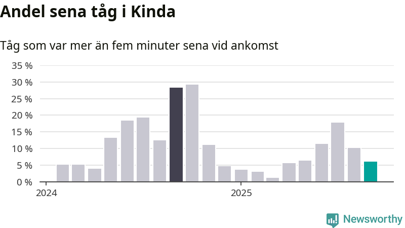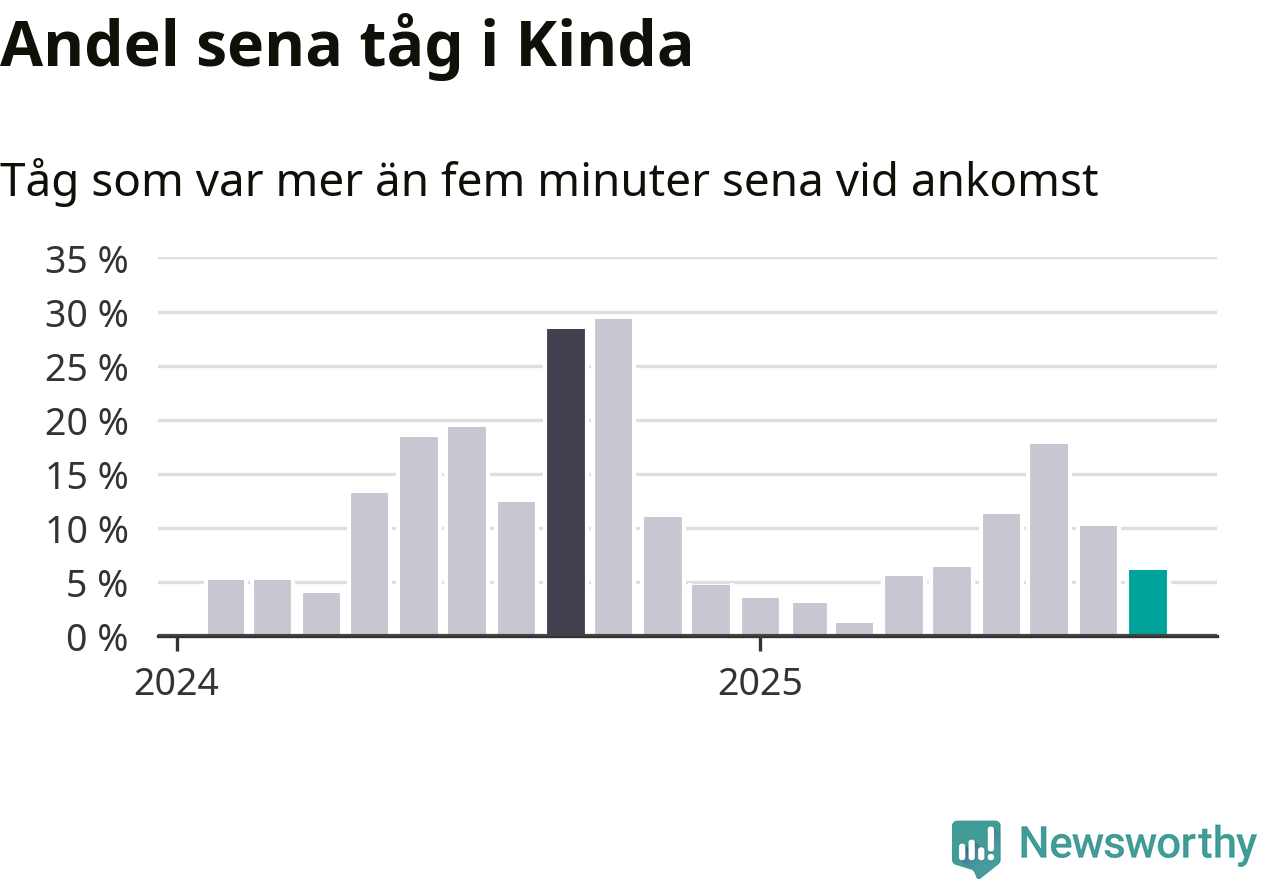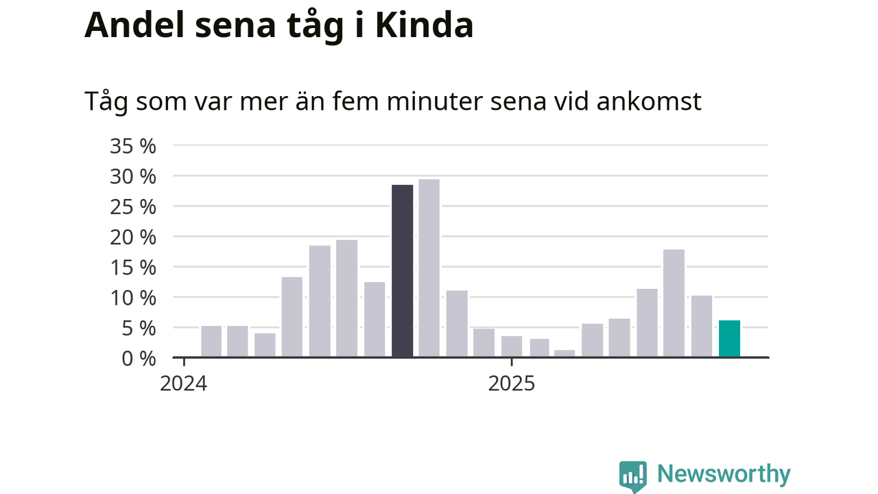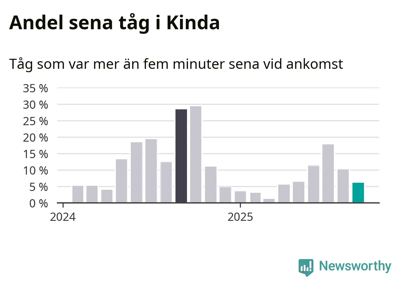 Sex procent kan jämföras med tio procent månaden innan, och 28 procent i september 2024. Siffrorna bygger på realtidsinformation om tågavgångar och ankomster från Trafikverket, som Newsworthy löpande samlar in.