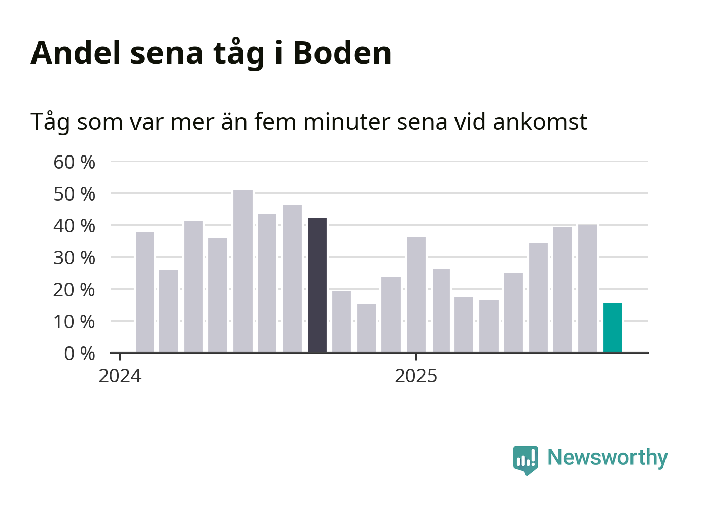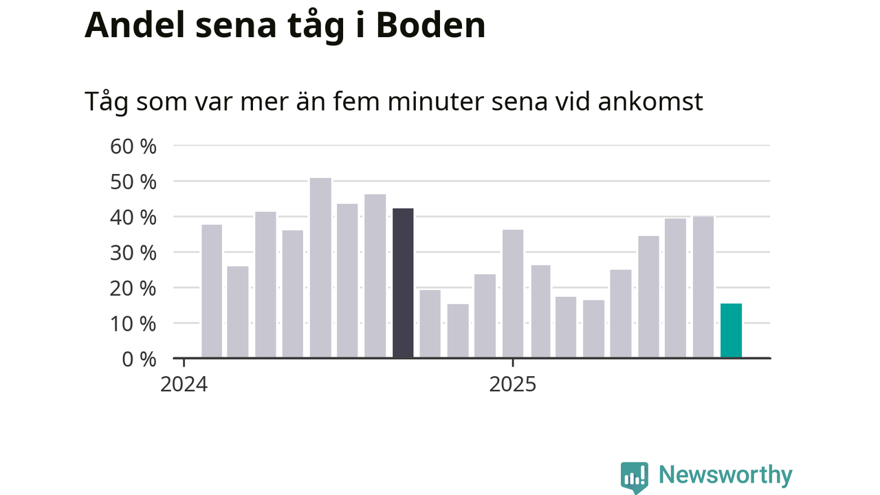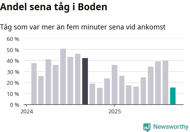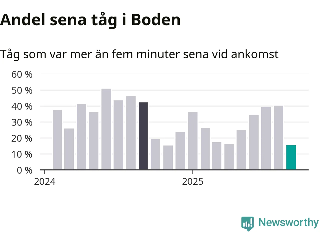 15 procent kan jämföras med 40 procent månaden innan, och 42 procent i september 2024. Siffrorna bygger på realtidsinformation om tågavgångar och ankomster från Trafikverket, som Newsworthy löpande samlar in.
