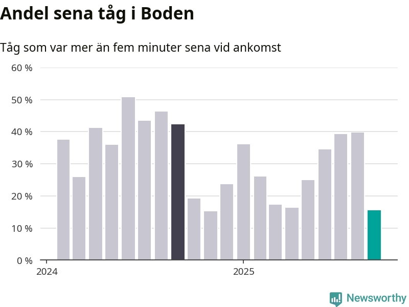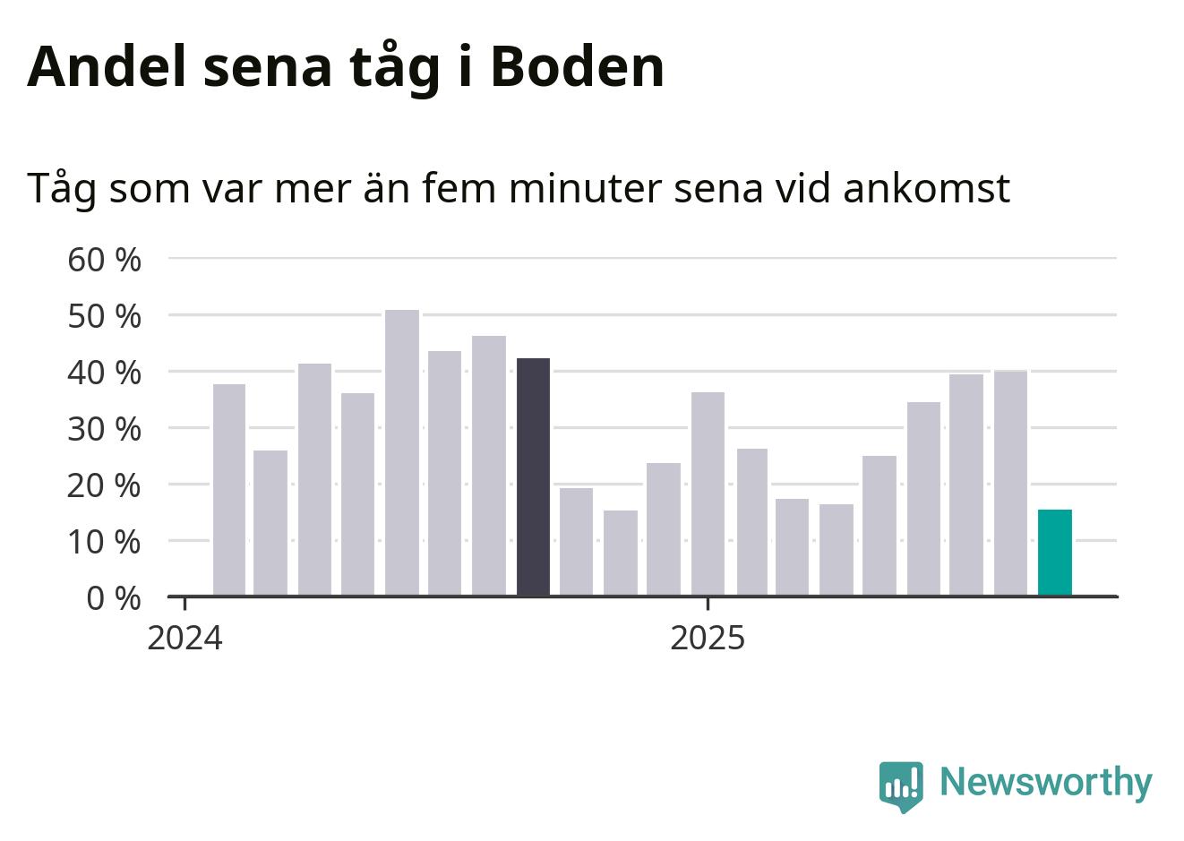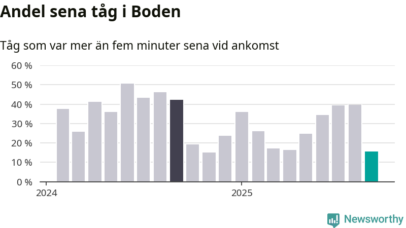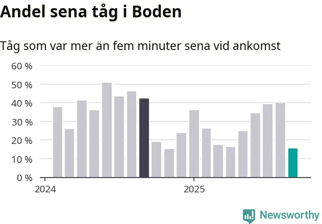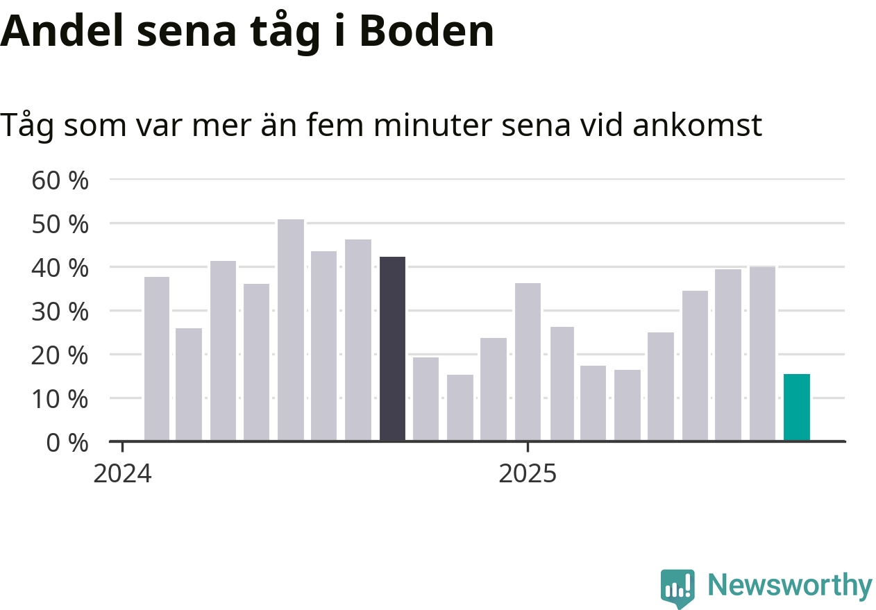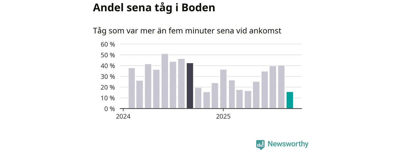 15 procent kan jämföras med 40 procent månaden innan, och 42 procent i september 2024. Siffrorna bygger på realtidsinformation om tågavgångar och ankomster från Trafikverket, som Newsworthy löpande samlar in.