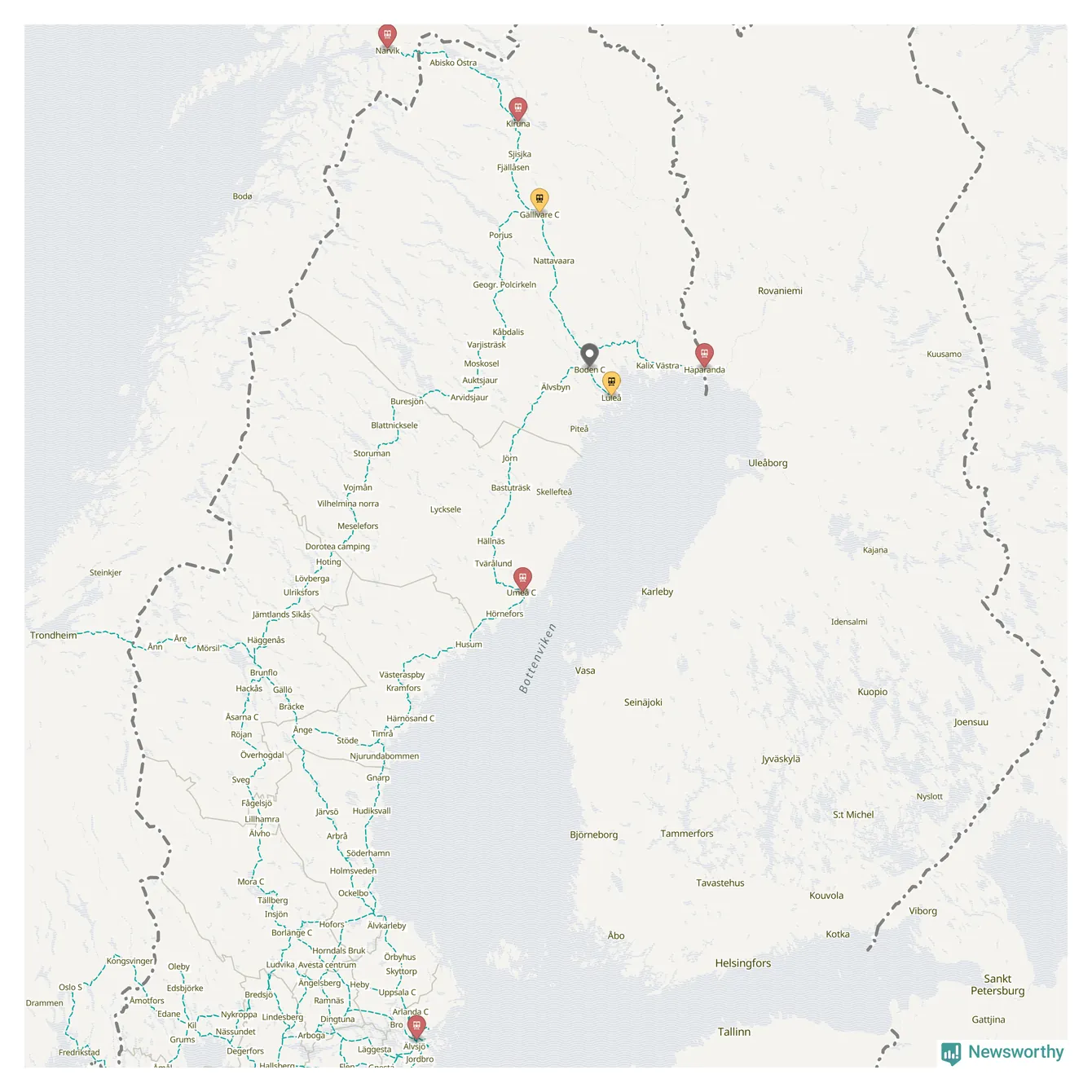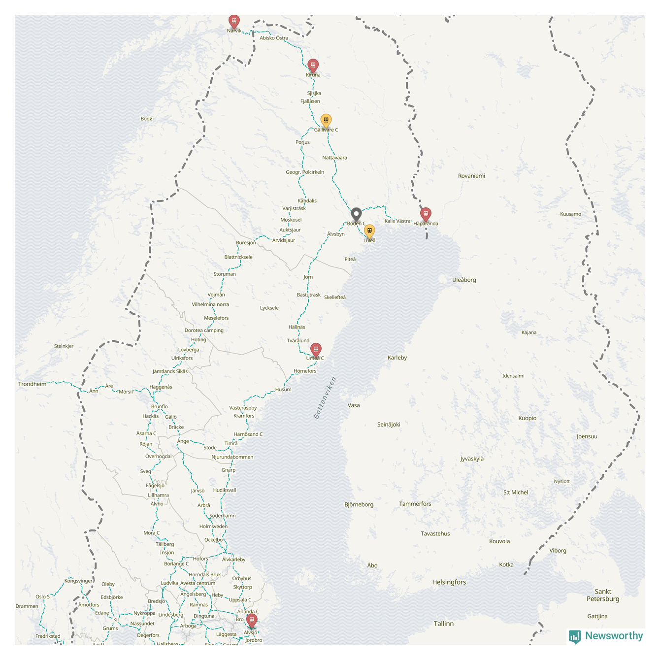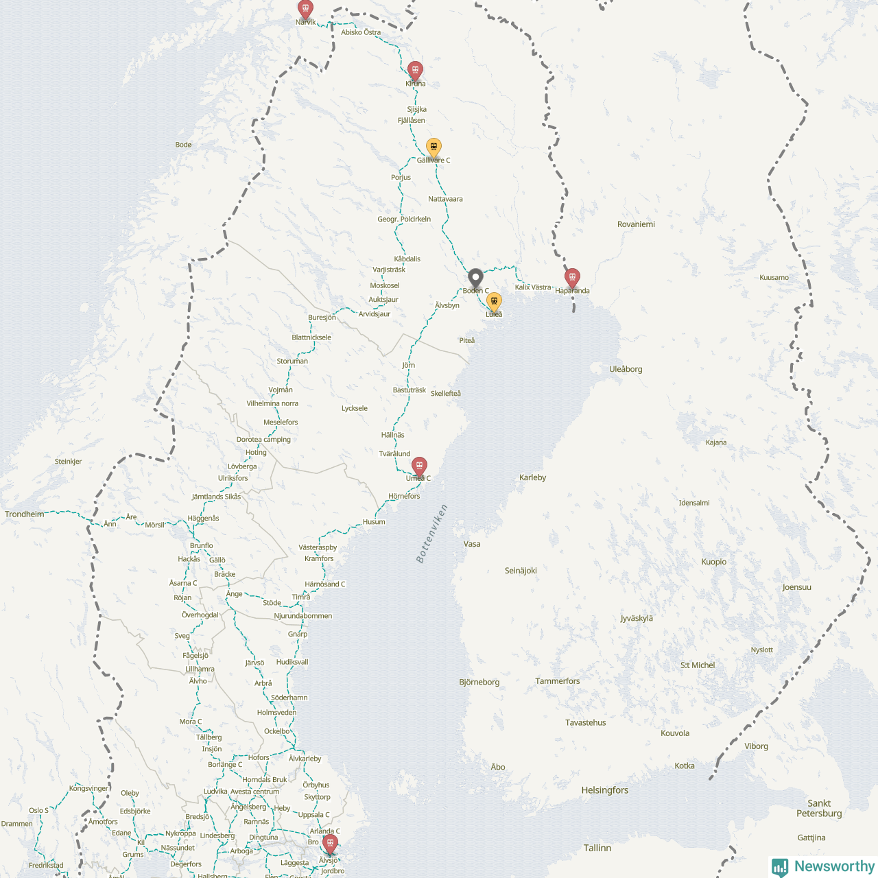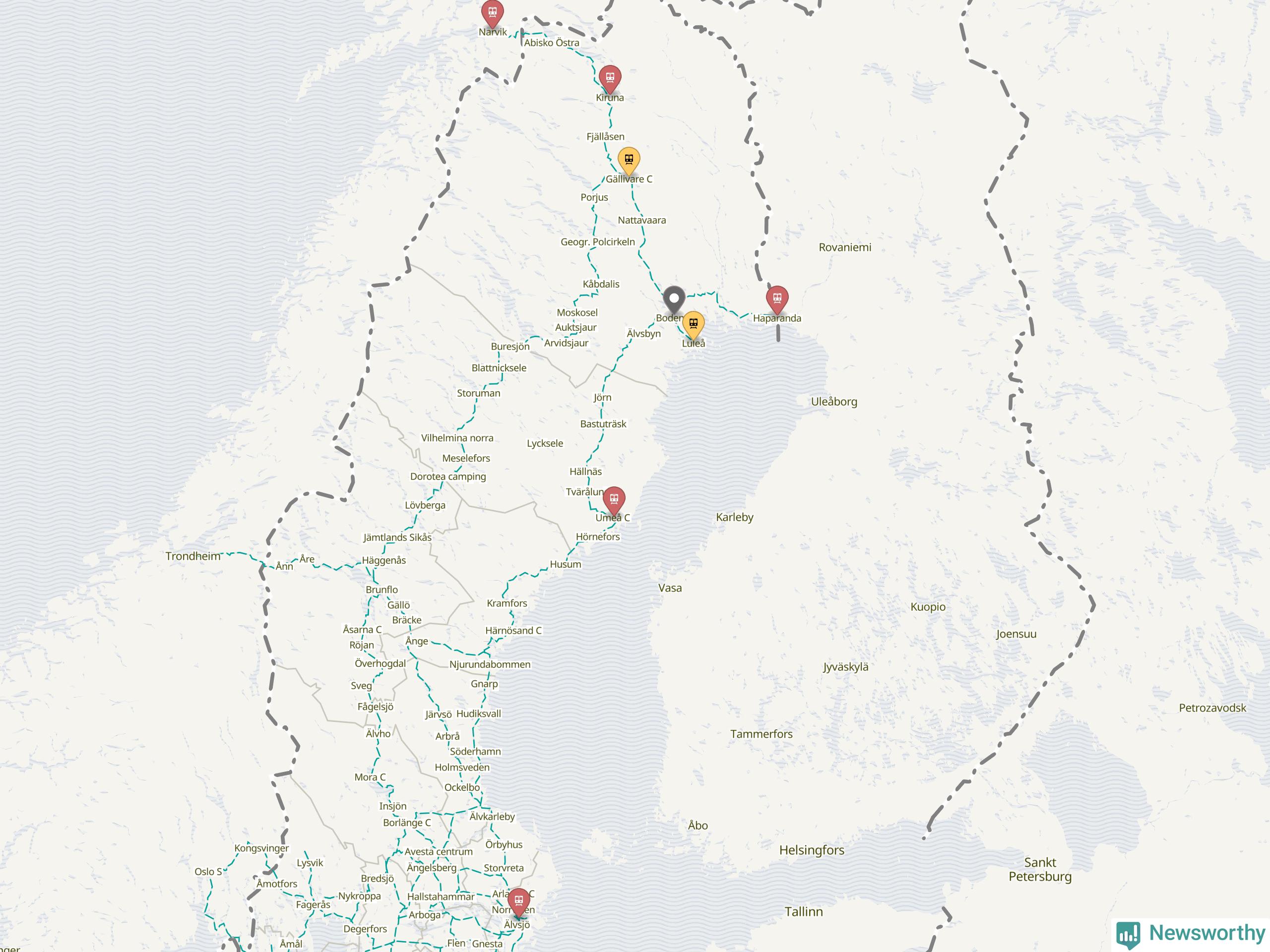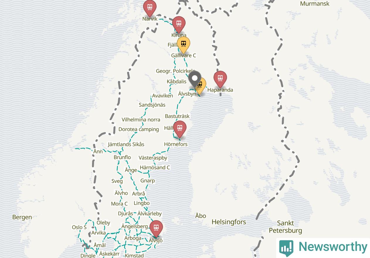 Kartdata från Mapbox, Newsworthy, OpenStreetMap och Trafikverket. Uppgifter om sträckor med passagerartrafik från jarnvag.net.