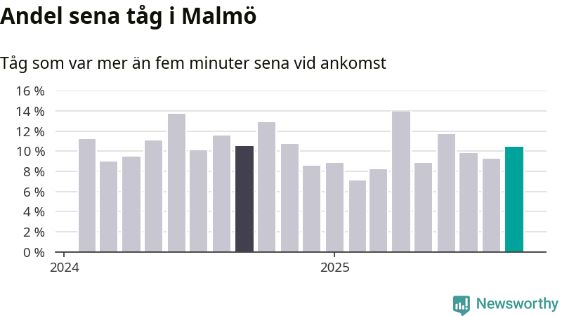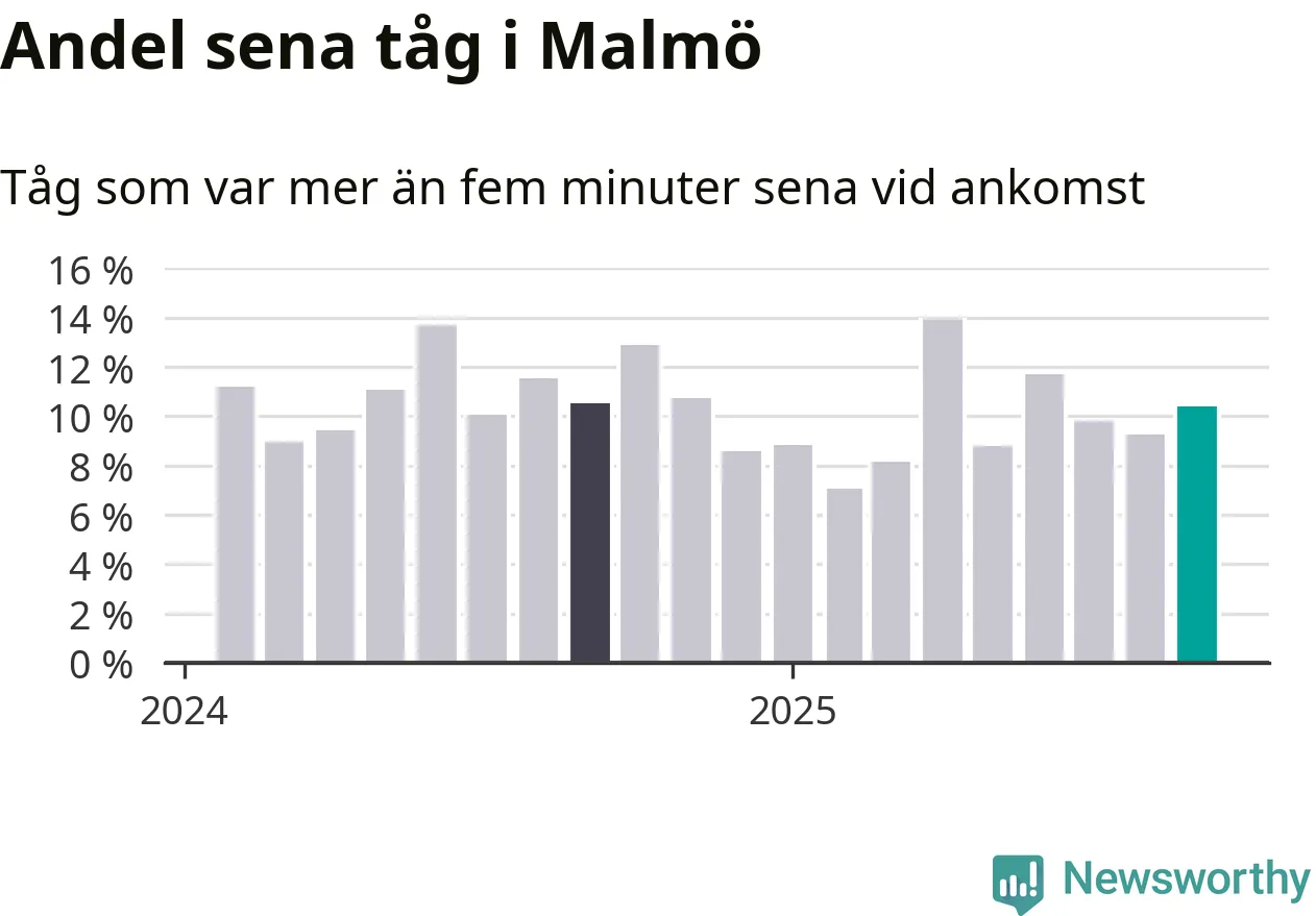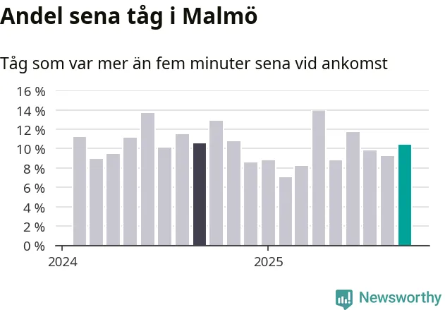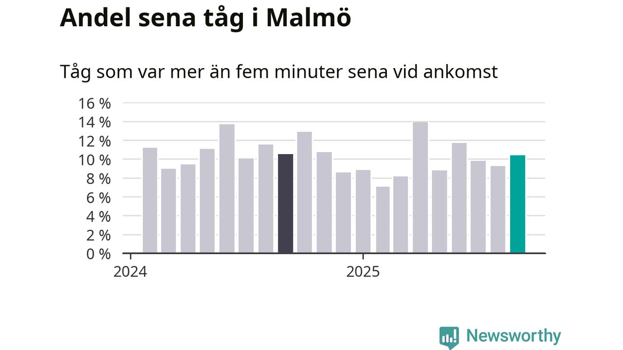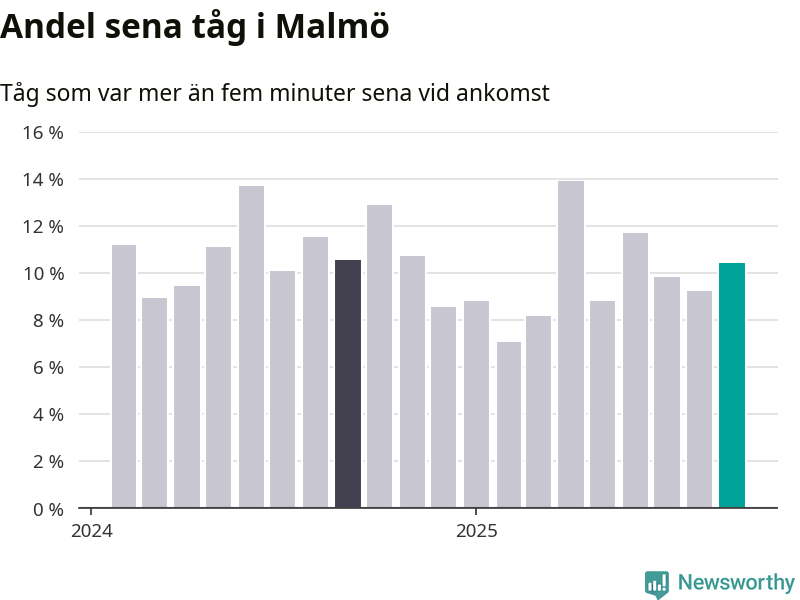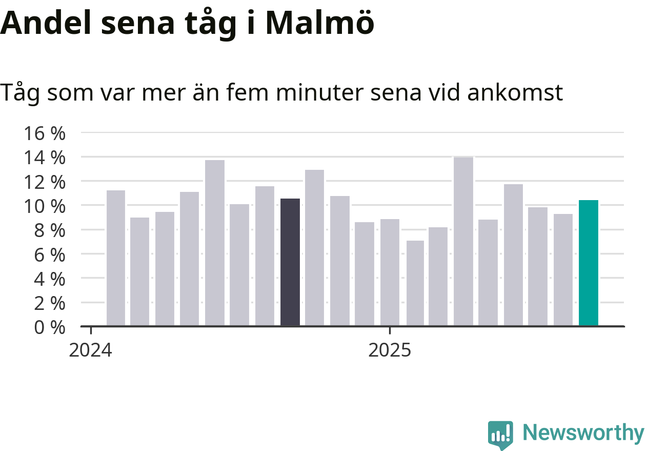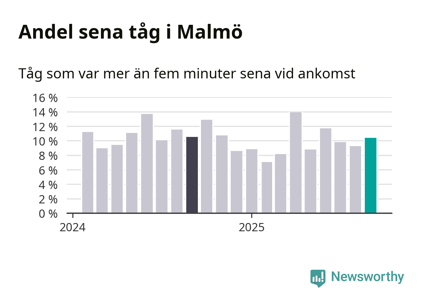 Tio procent kan jämföras med nio procent månaden innan, och elva procent i september 2024. Siffrorna bygger på realtidsinformation om tågavgångar och ankomster från Trafikverket, som Newsworthy löpande samlar in.