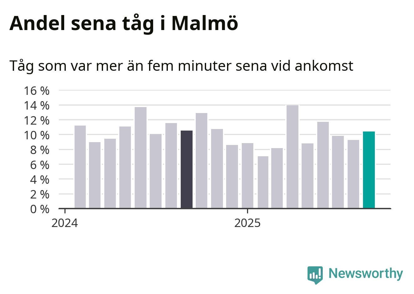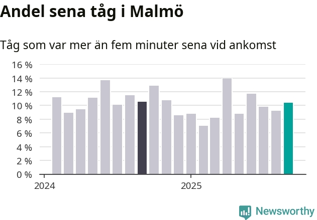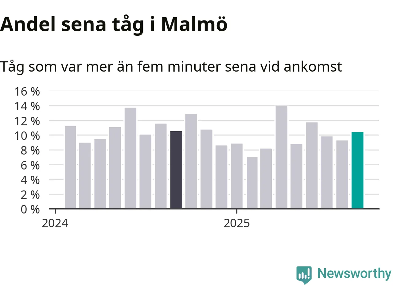 Av omkring 15 000 tåg som passerade någon av stationerna i Malmö kommun i september var 1 564 mer än fem minuter sena. Det motsvarar 10 procent, en bit över den nationella målsättningen som säger att inte mer än fem procent av tågen ska vara sena.