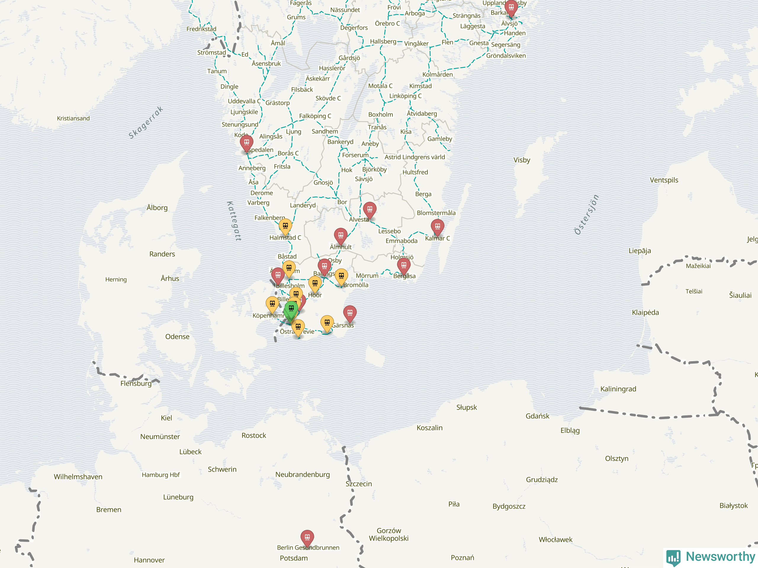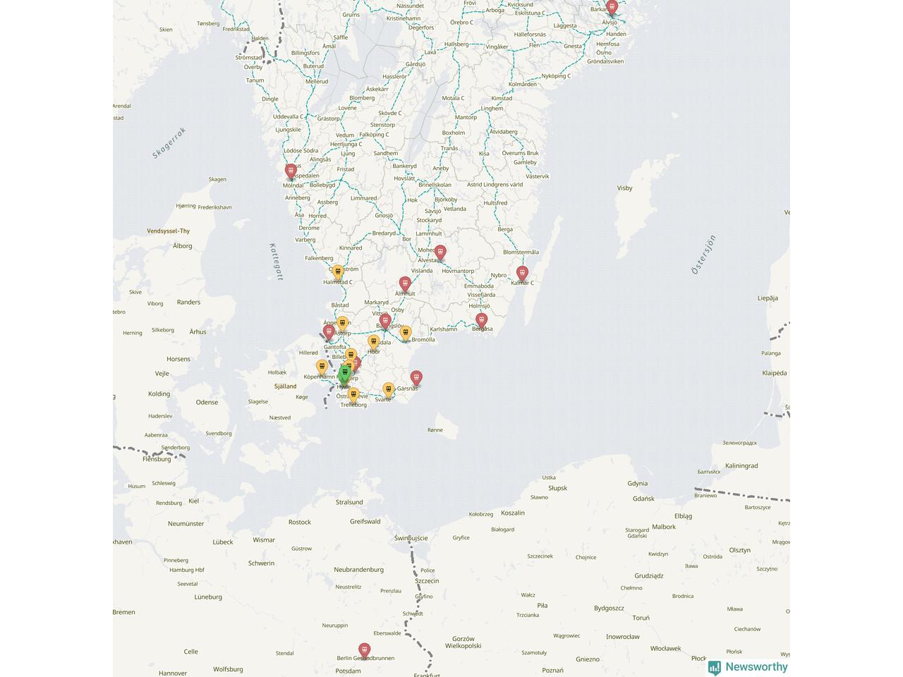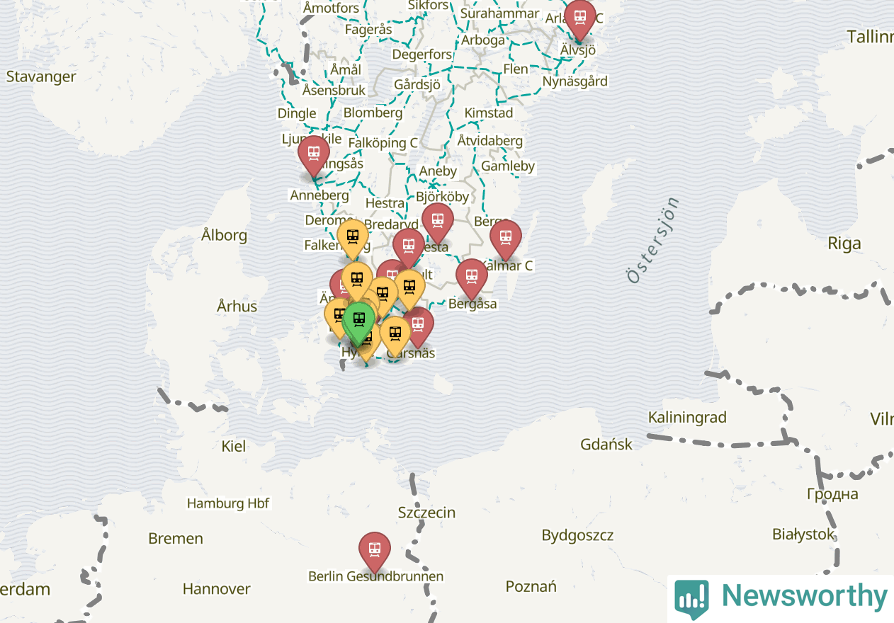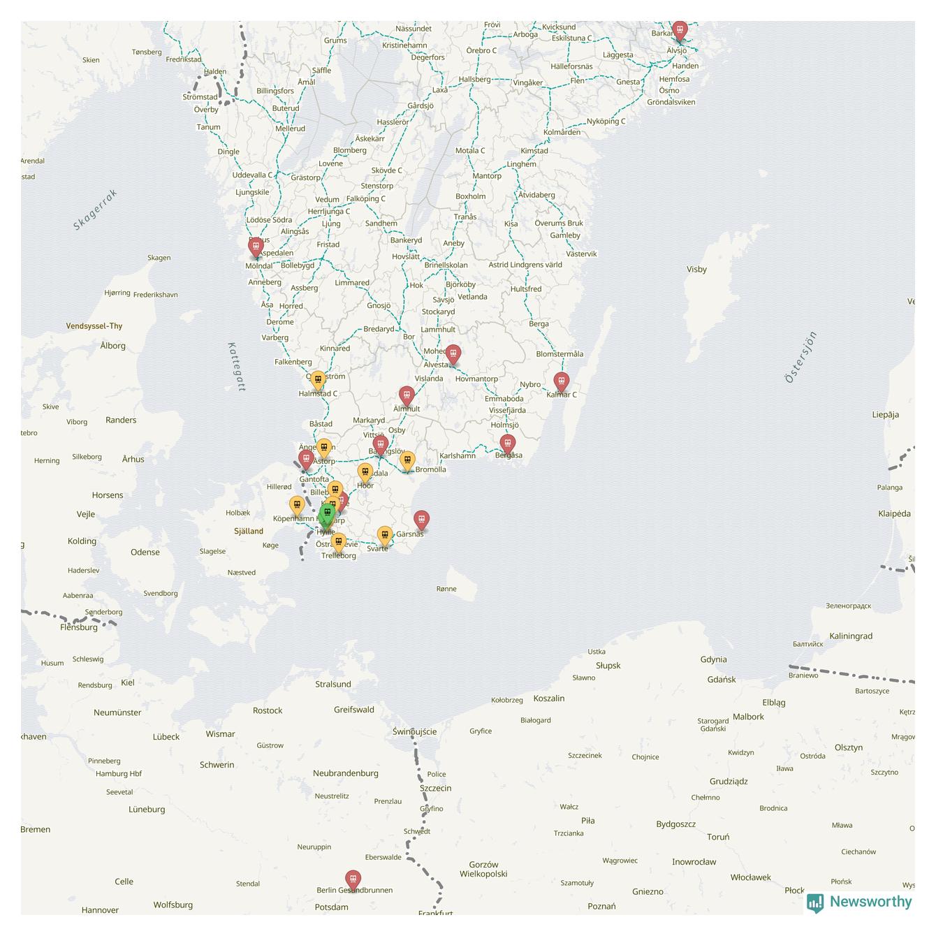 Kartdata från Mapbox, Newsworthy, OpenStreetMap och Trafikverket. Uppgifter om sträckor med passagerartrafik från jarnvag.net.