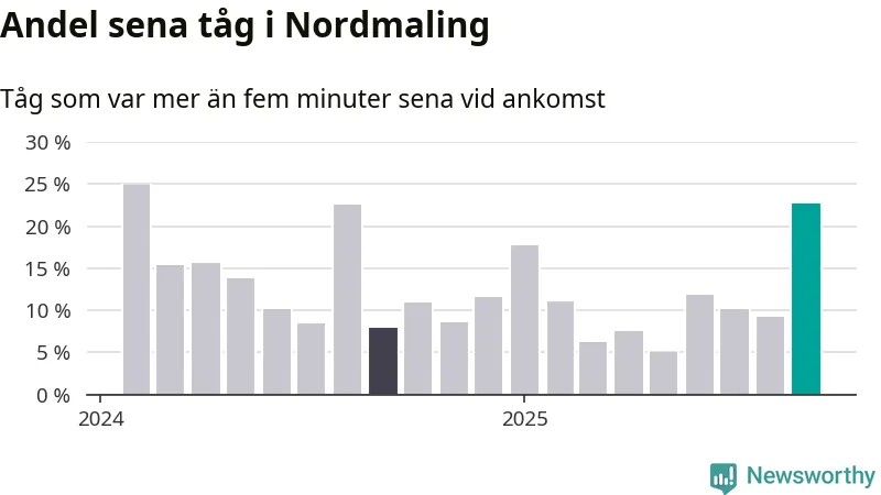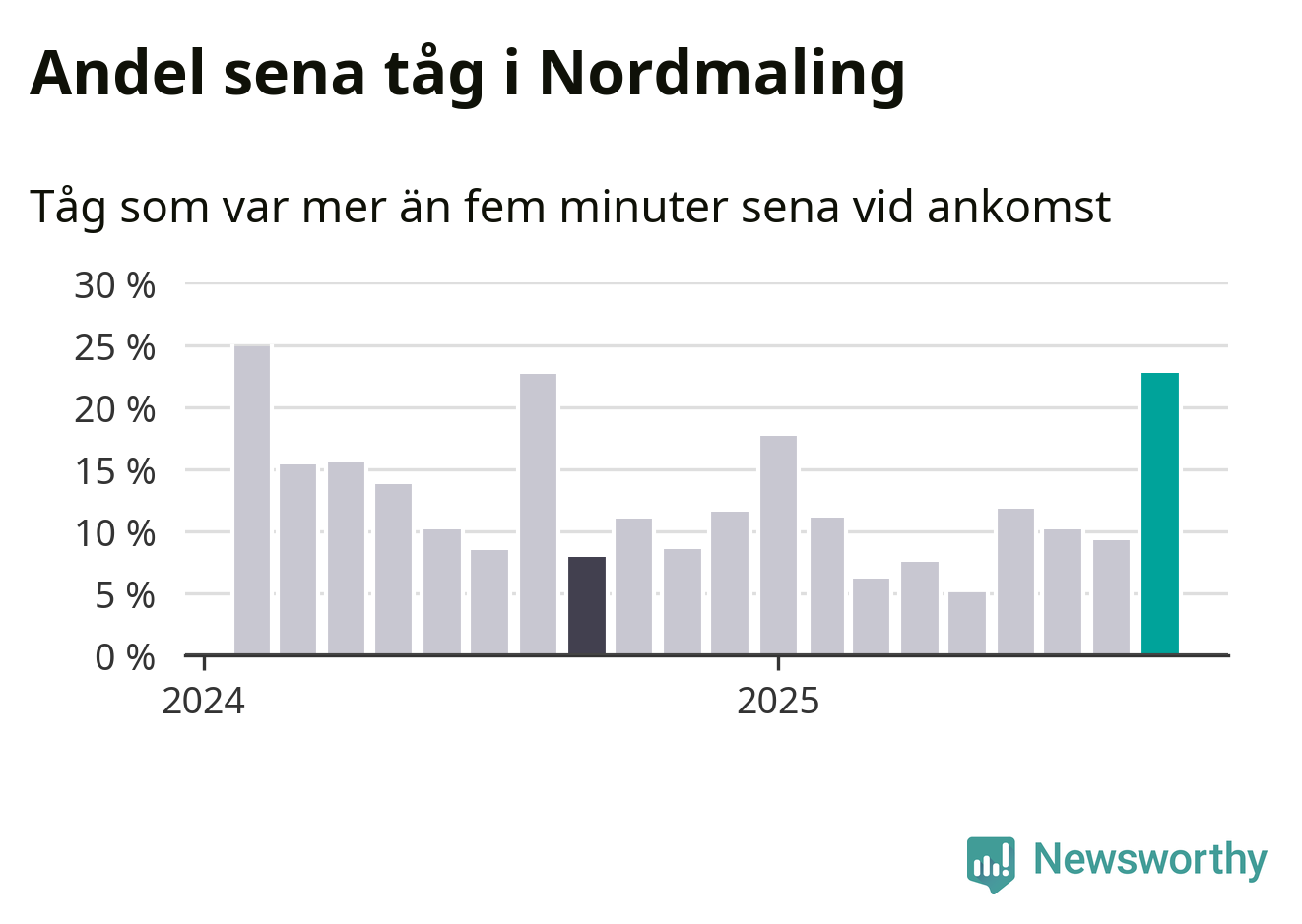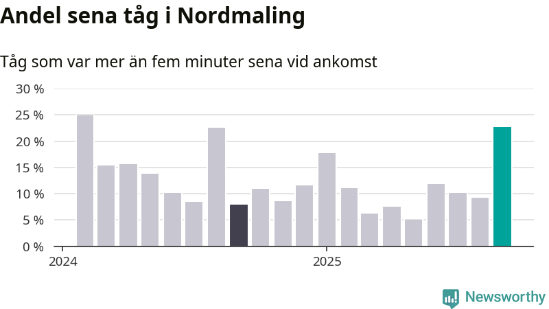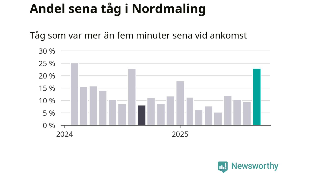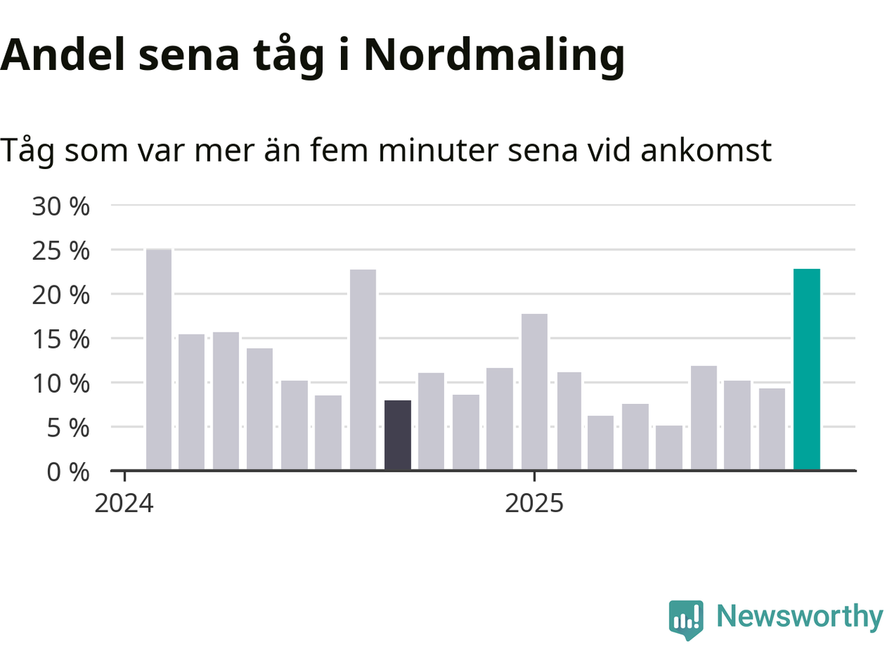Så hög har andelen förseningar inte varit sedan februari 2024. Siffrorna bygger på realtidsinformation om tågavgångar och ankomster från Trafikverket, som Newsworthy löpande samlar in.