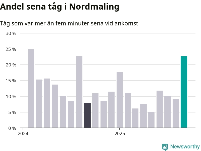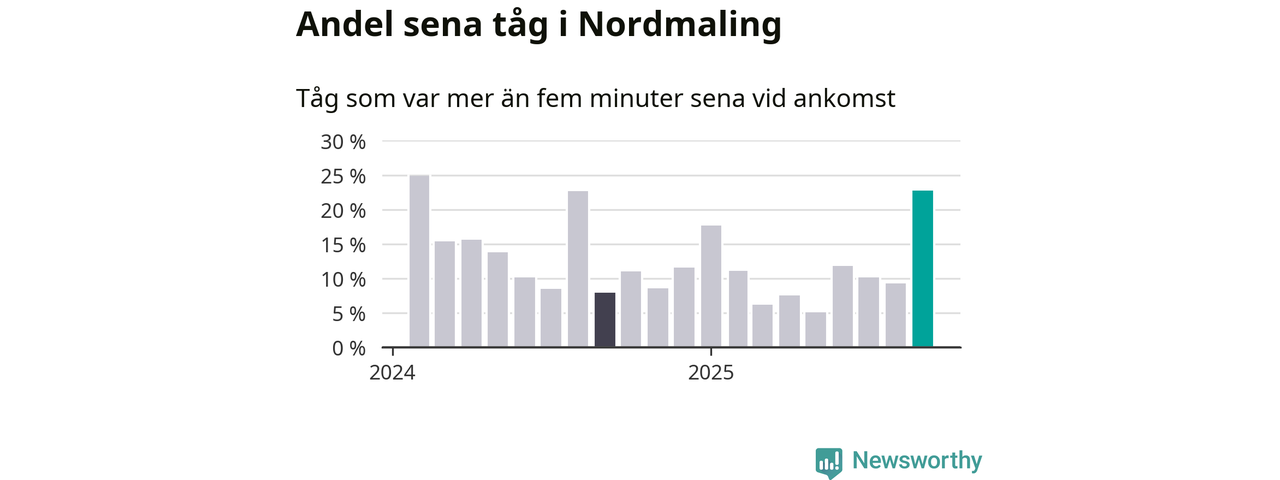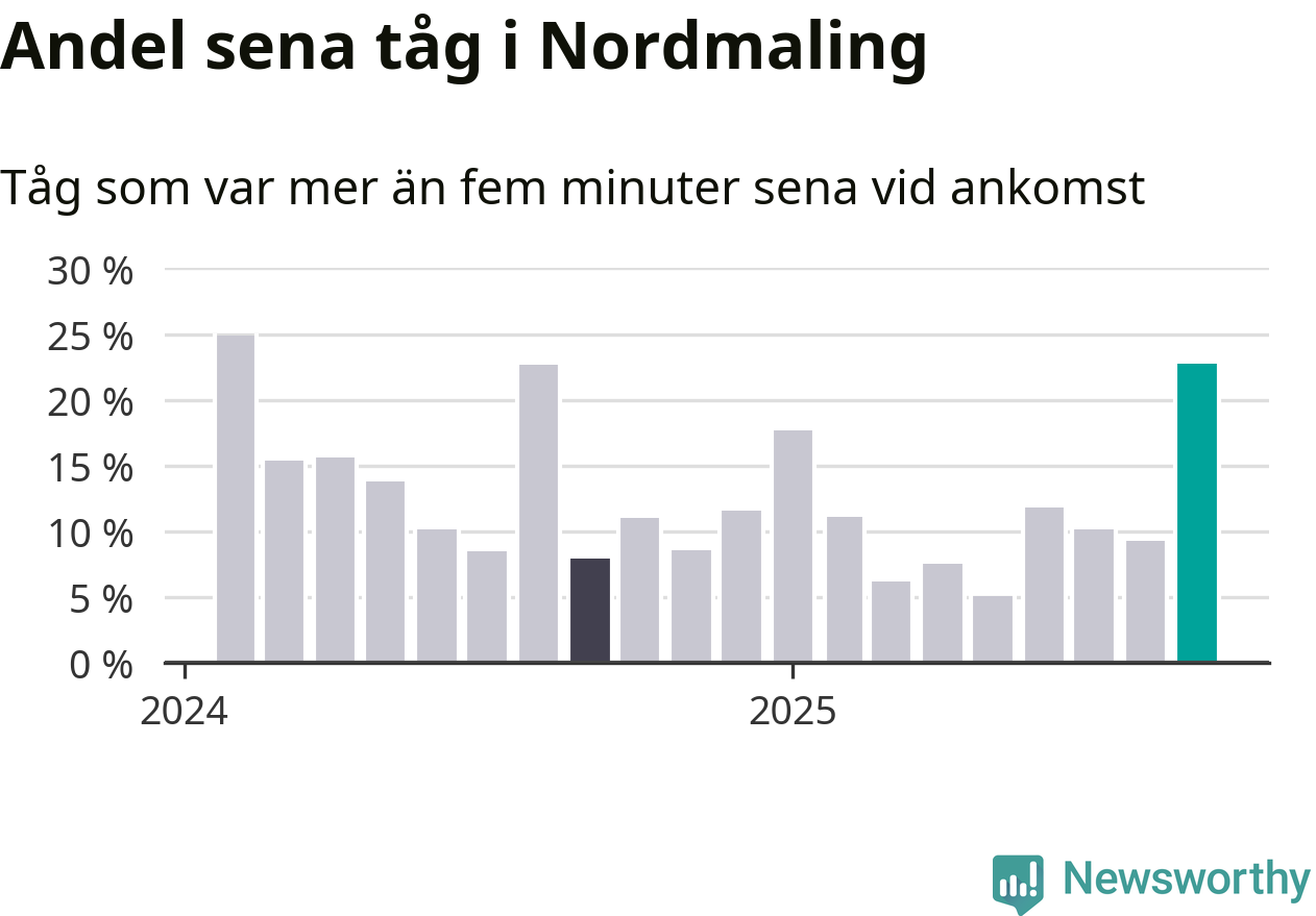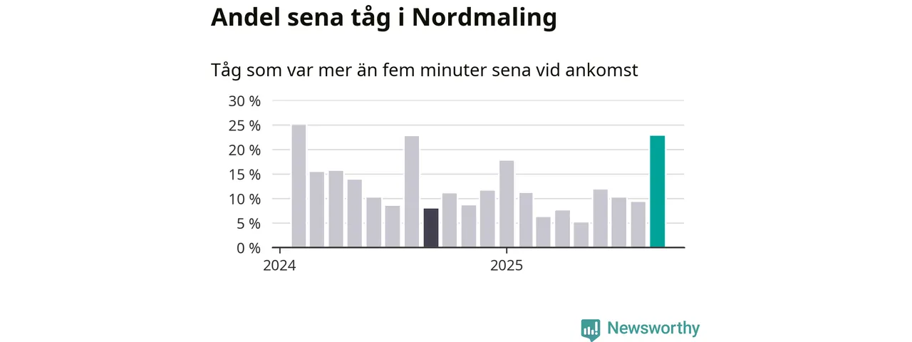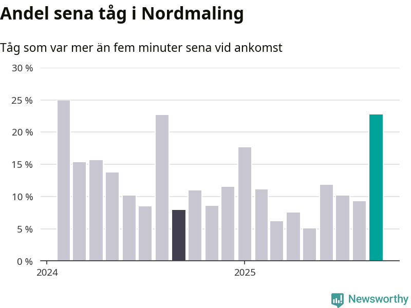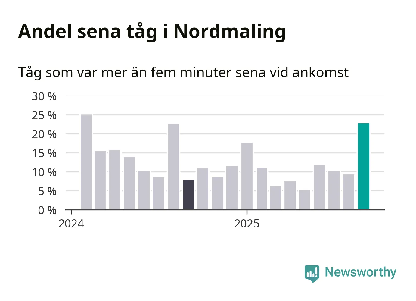 Så hög har andelen förseningar inte varit sedan februari 2024. Siffrorna bygger på realtidsinformation om tågavgångar och ankomster från Trafikverket, som Newsworthy löpande samlar in.
