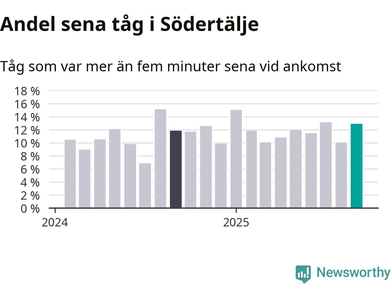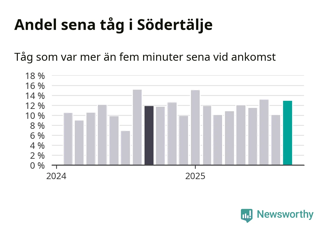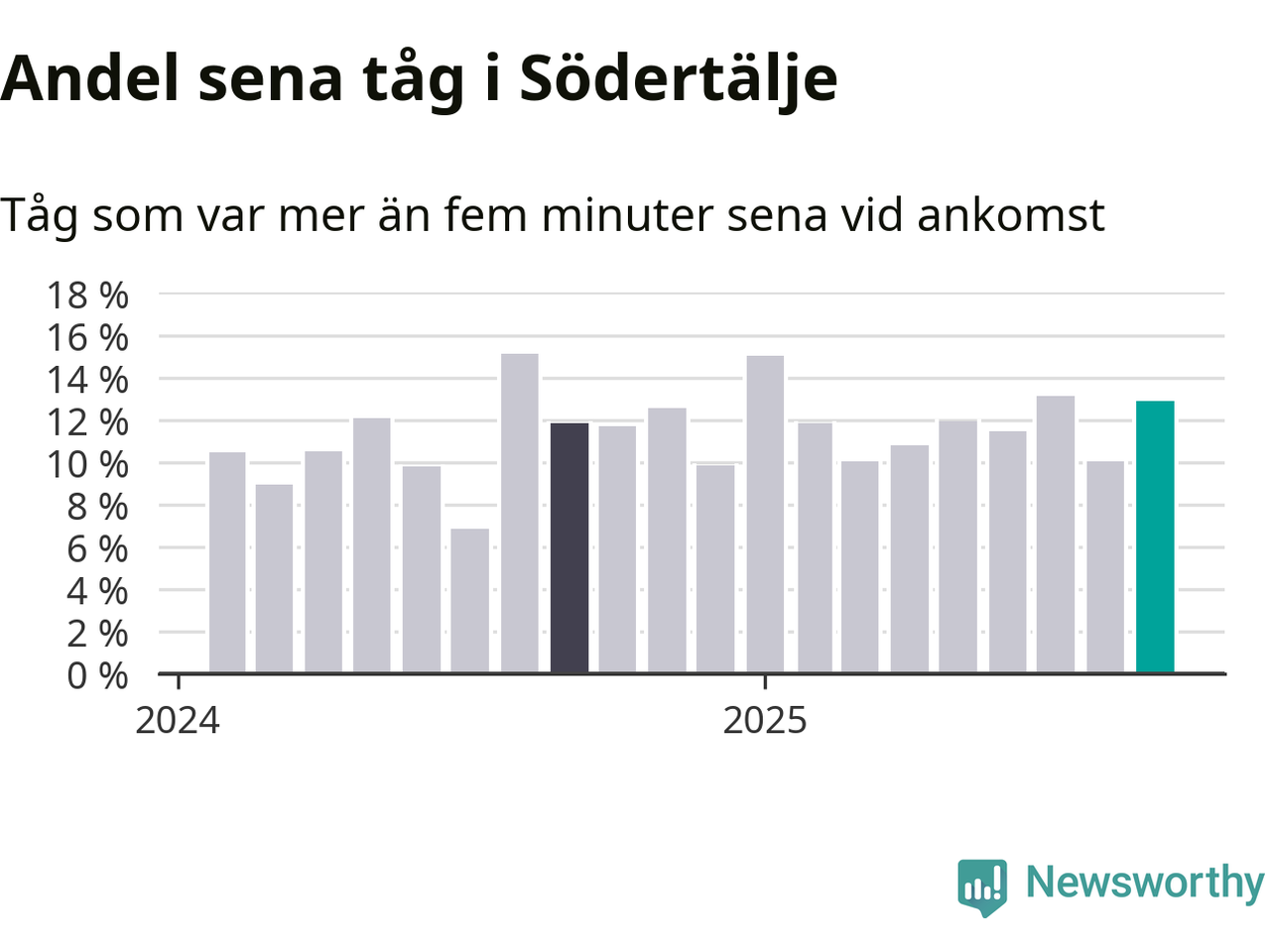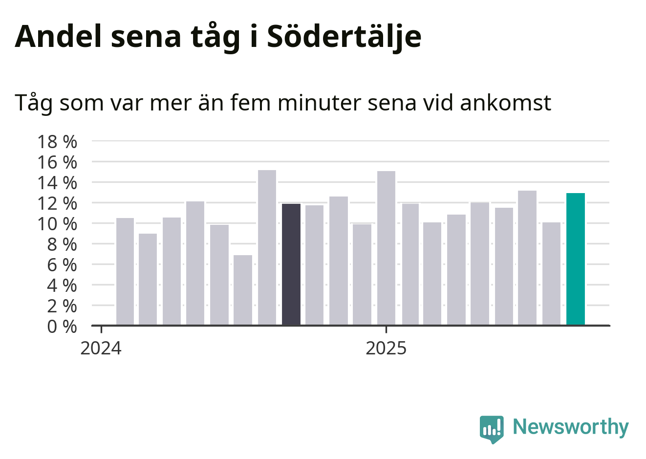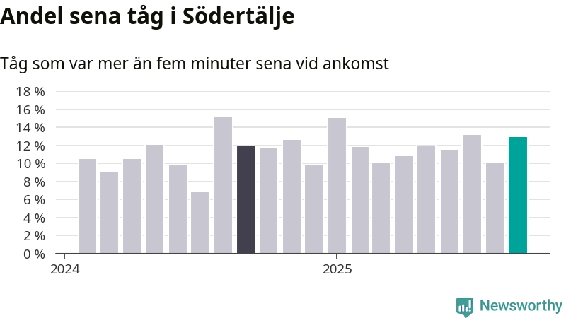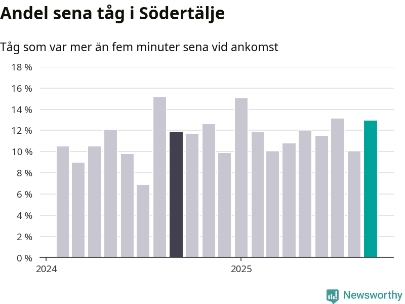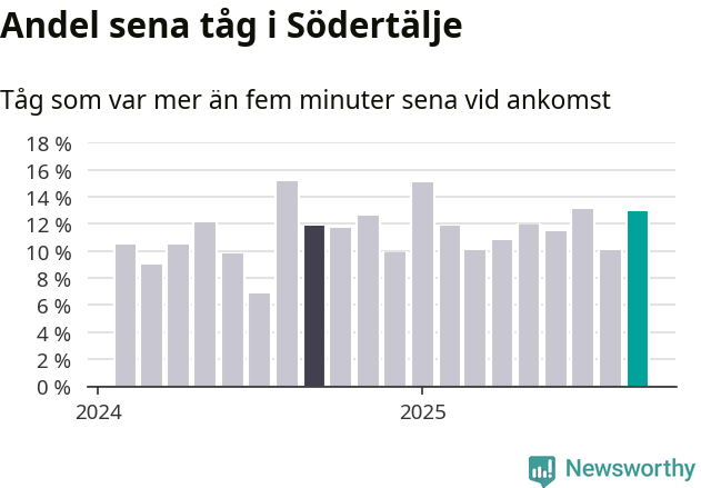 13 procent kan jämföras med tio procent månaden innan, och tolv procent i september 2024. Siffrorna bygger på realtidsinformation om tågavgångar och ankomster från Trafikverket, som Newsworthy löpande samlar in.