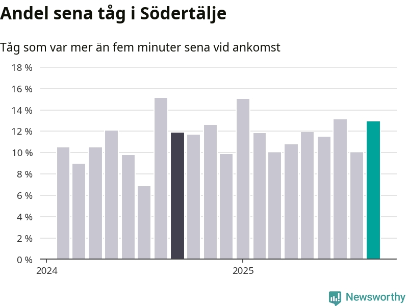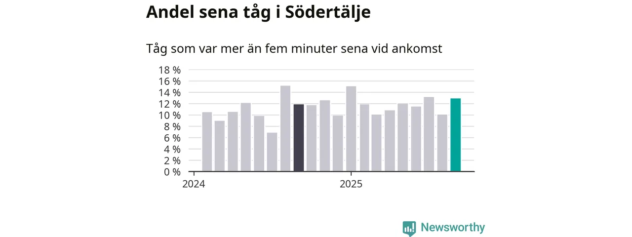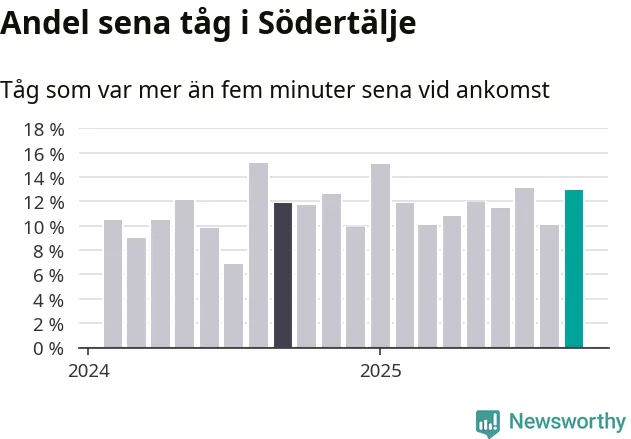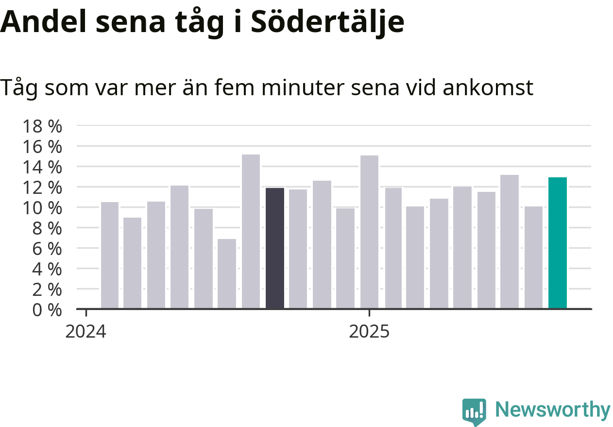 Av omkring 10 500 tåg som passerade någon av stationerna i Södertälje kommun i september var 1 360 mer än fem minuter sena. Det motsvarar 13 procent, en bit över den nationella målsättningen som säger att inte mer än fem procent av tågen ska vara sena.