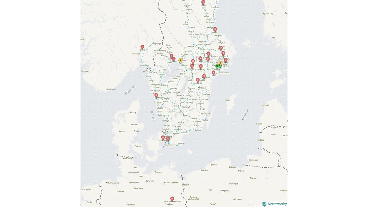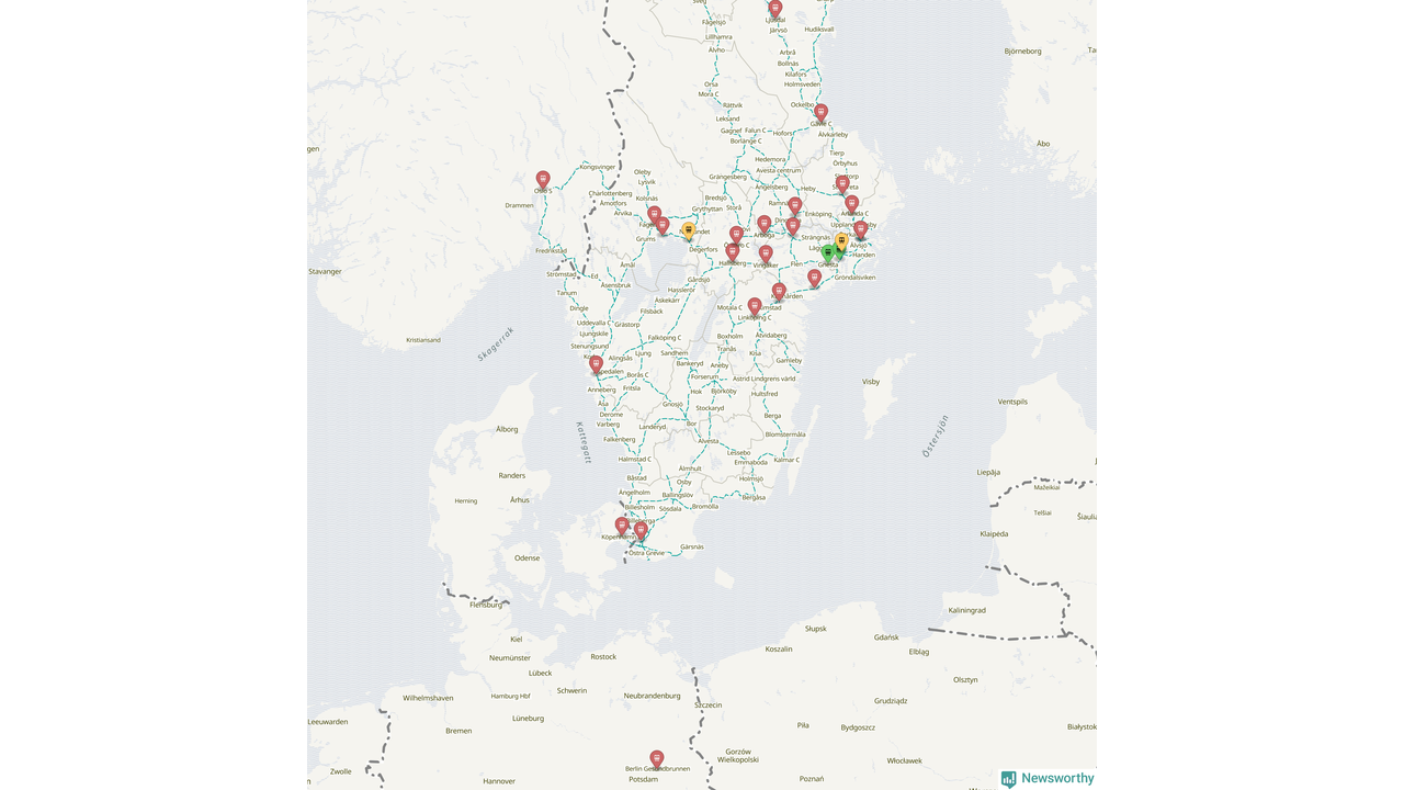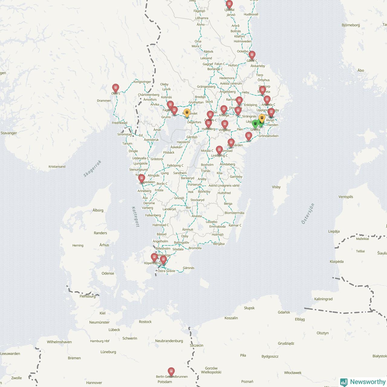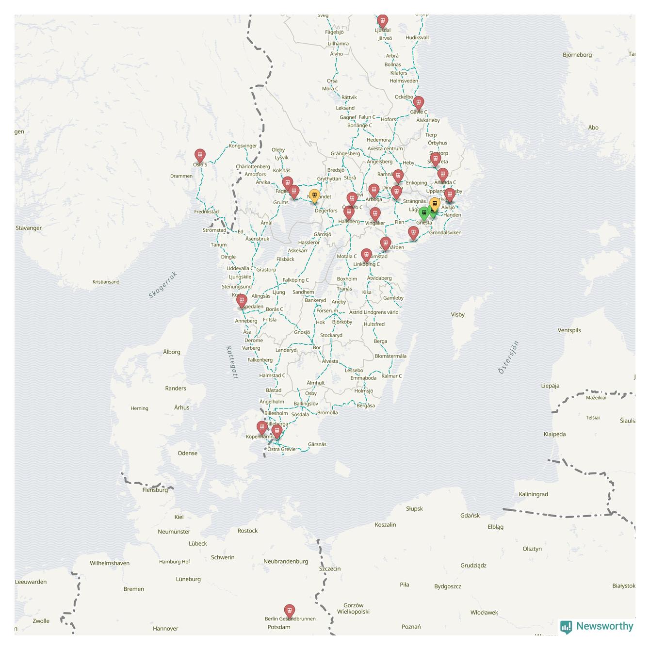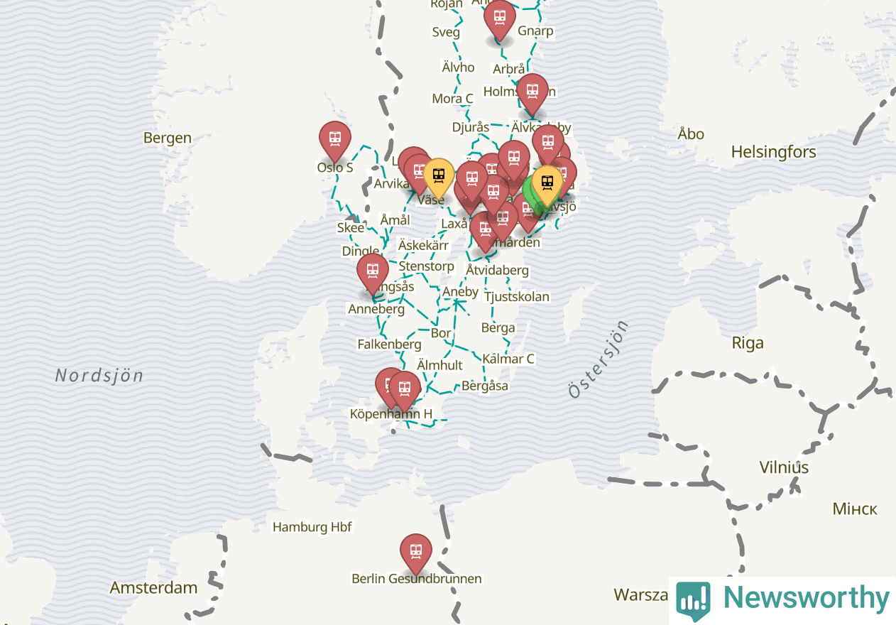 Kartdata från Mapbox, Newsworthy, OpenStreetMap och Trafikverket. Uppgifter om sträckor med passagerartrafik från jarnvag.net.