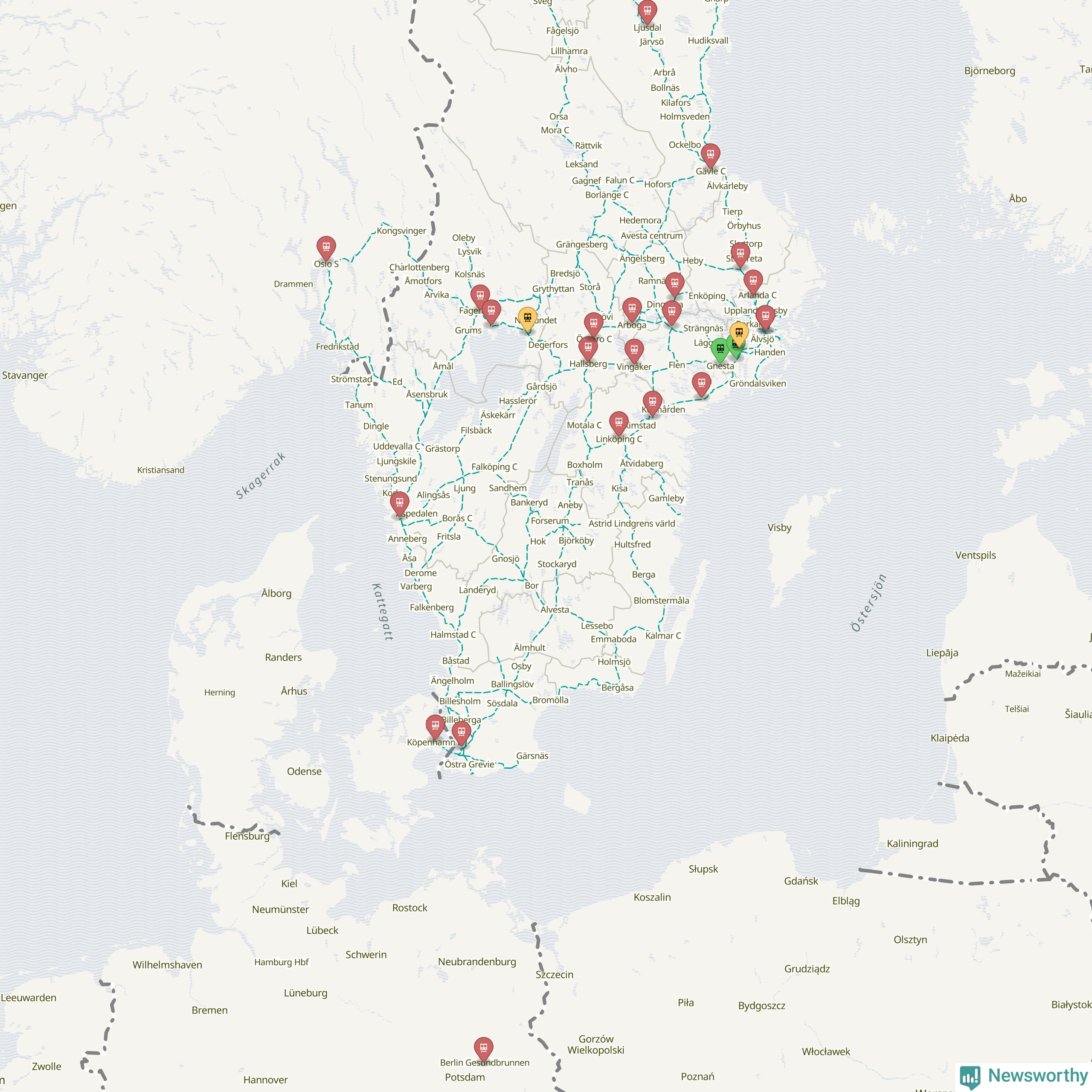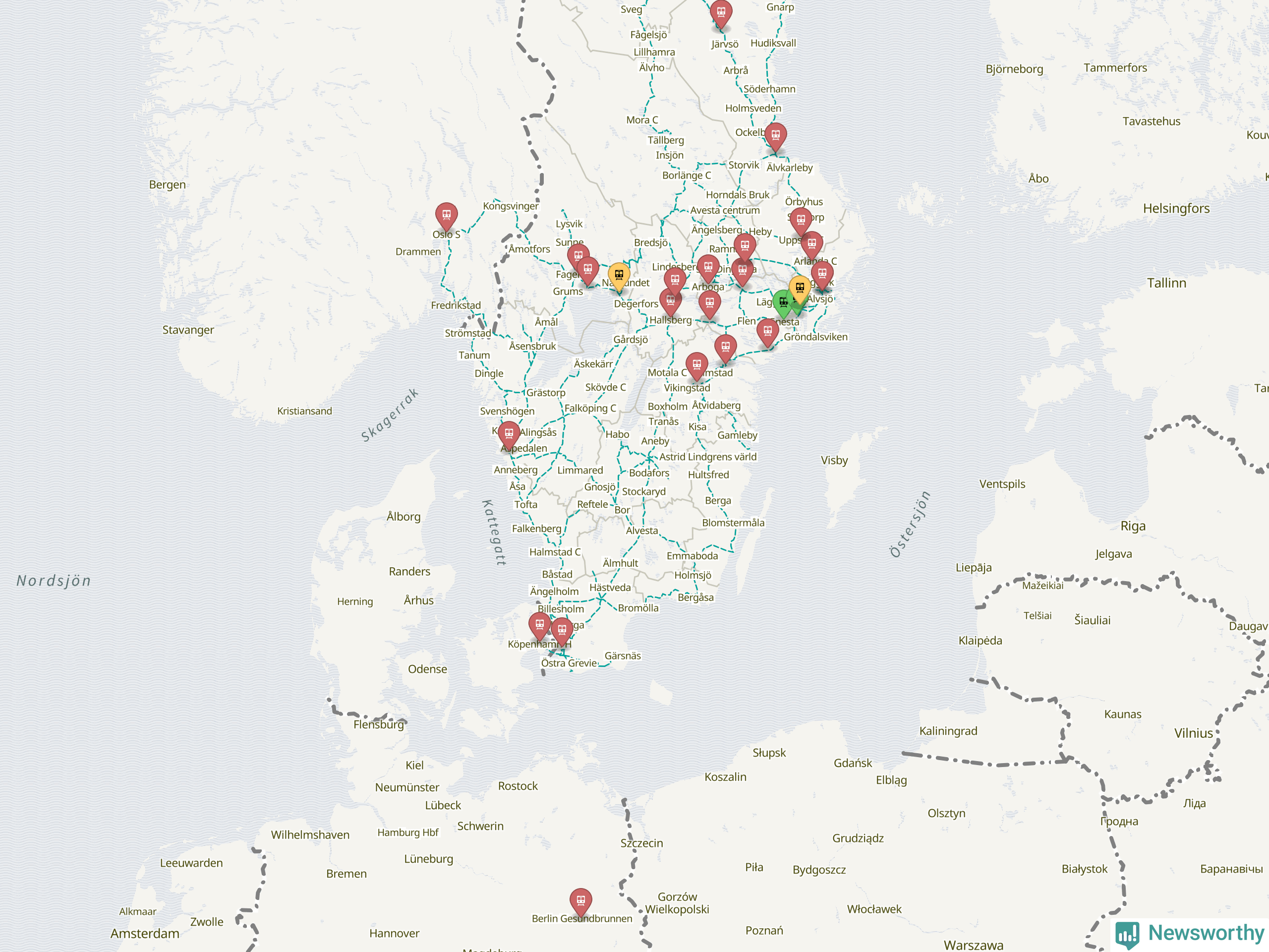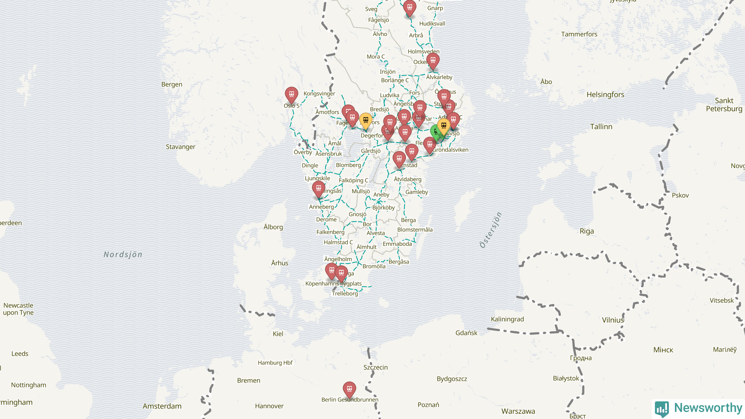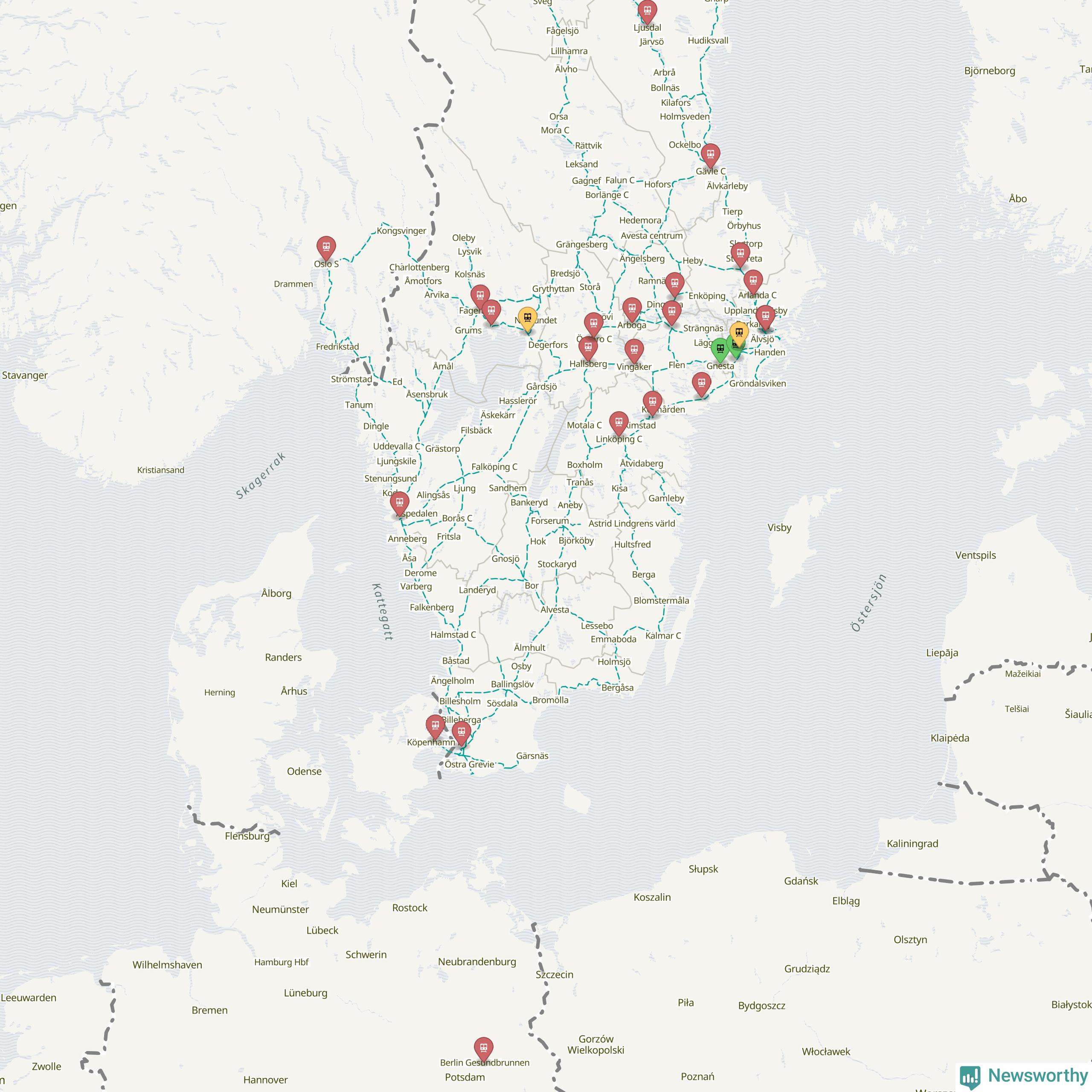 Kartdata från Mapbox, Newsworthy, OpenStreetMap och Trafikverket. Uppgifter om sträckor med passagerartrafik från jarnvag.net.