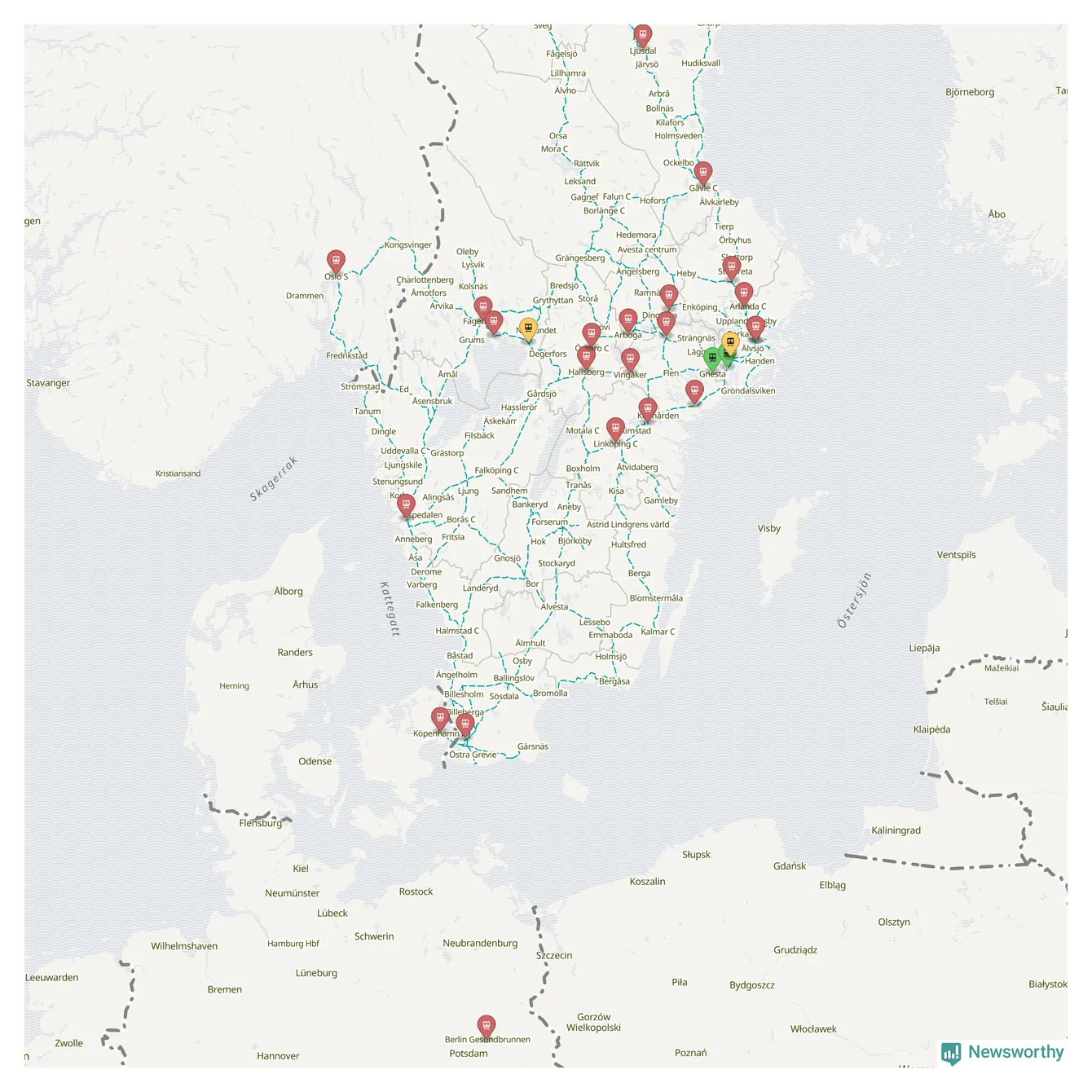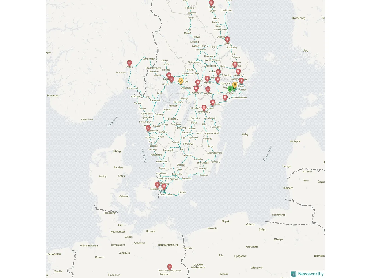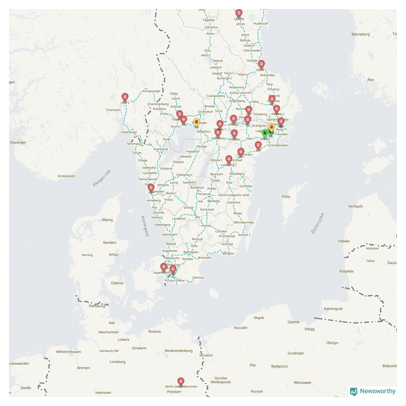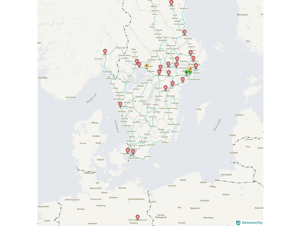 Kartdata från Mapbox, Newsworthy, OpenStreetMap och Trafikverket. Uppgifter om sträckor med passagerartrafik från jarnvag.net.