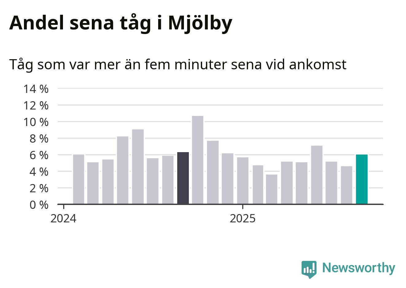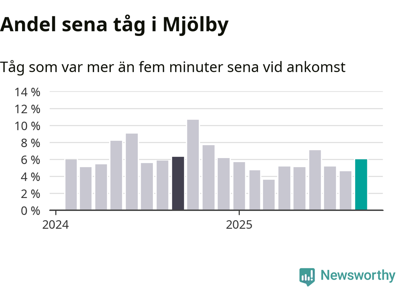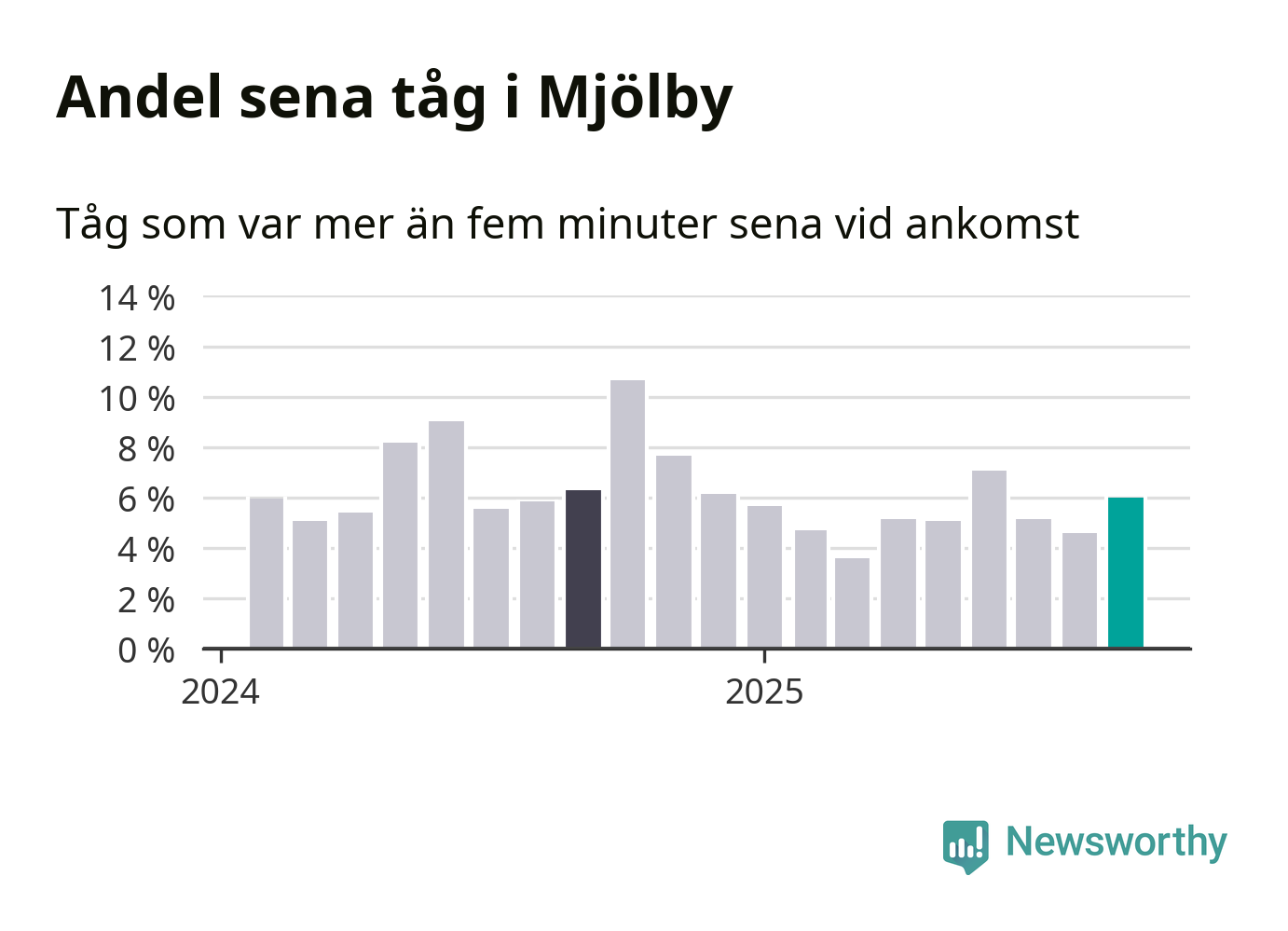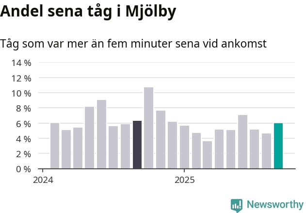 Sex procent kan jämföras med fem procent månaden innan, och sex procent i september 2024. Siffrorna bygger på realtidsinformation om tågavgångar och ankomster från Trafikverket, som Newsworthy löpande samlar in.