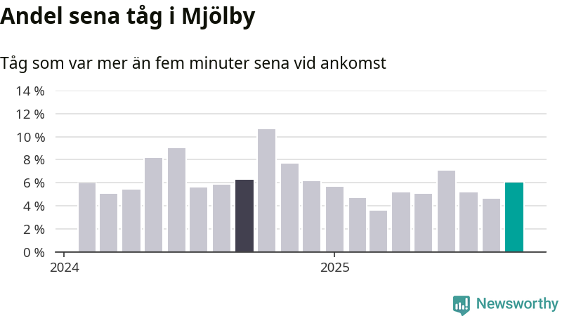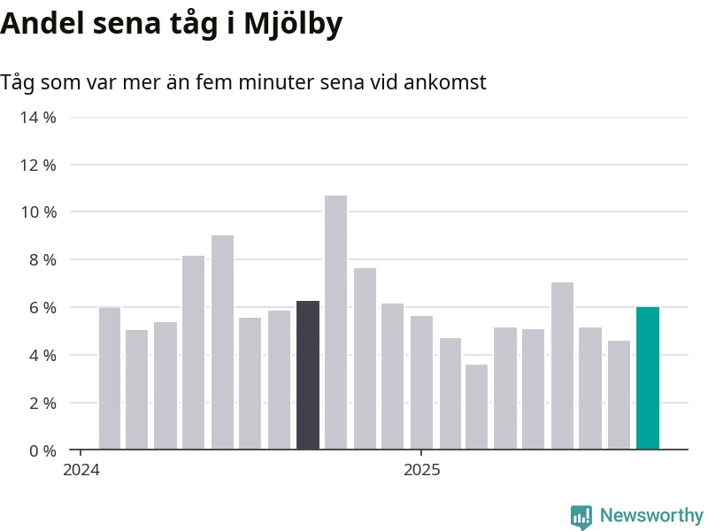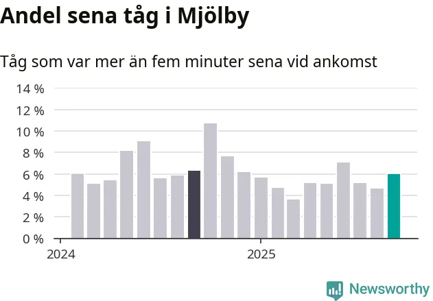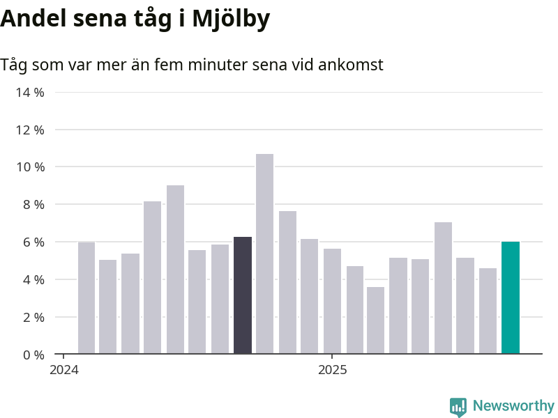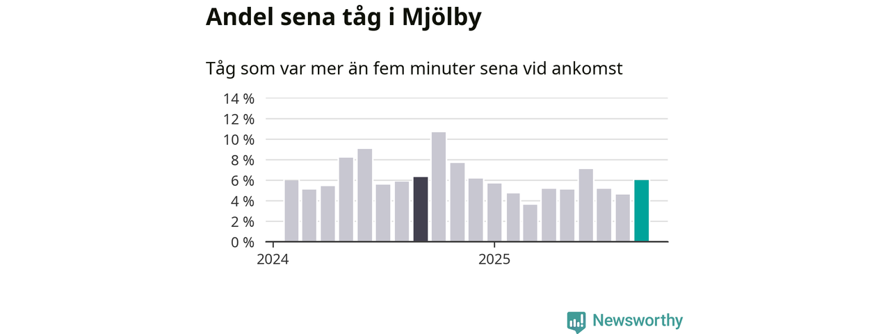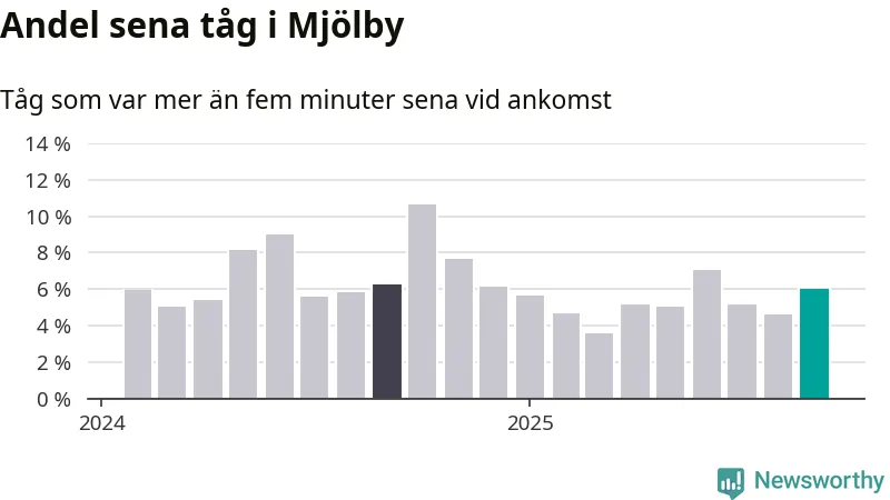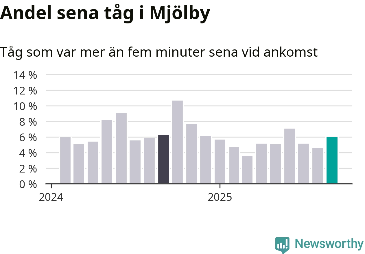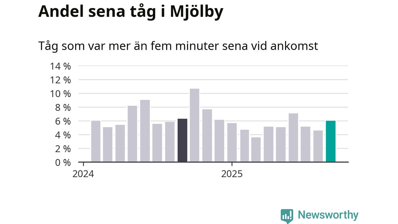 Sex procent kan jämföras med fem procent månaden innan, och sex procent i september 2024. Siffrorna bygger på realtidsinformation om tågavgångar och ankomster från Trafikverket, som Newsworthy löpande samlar in.