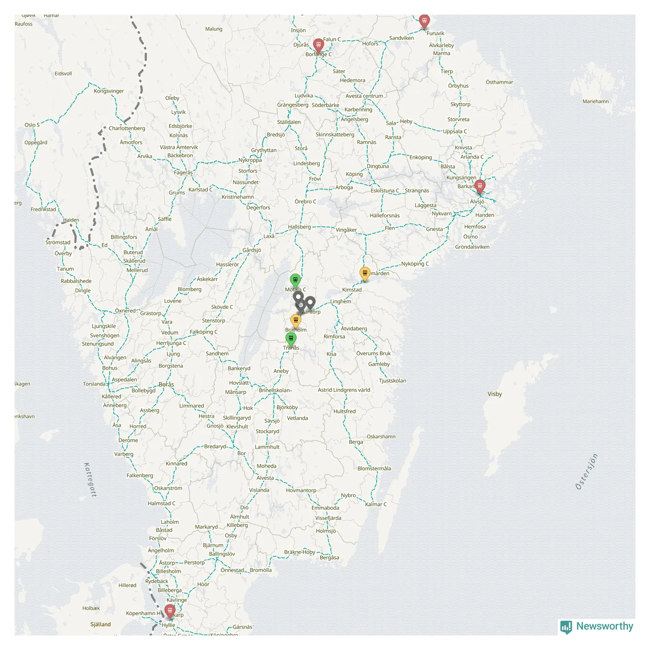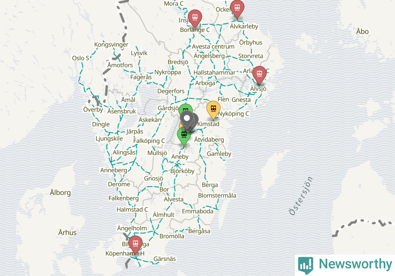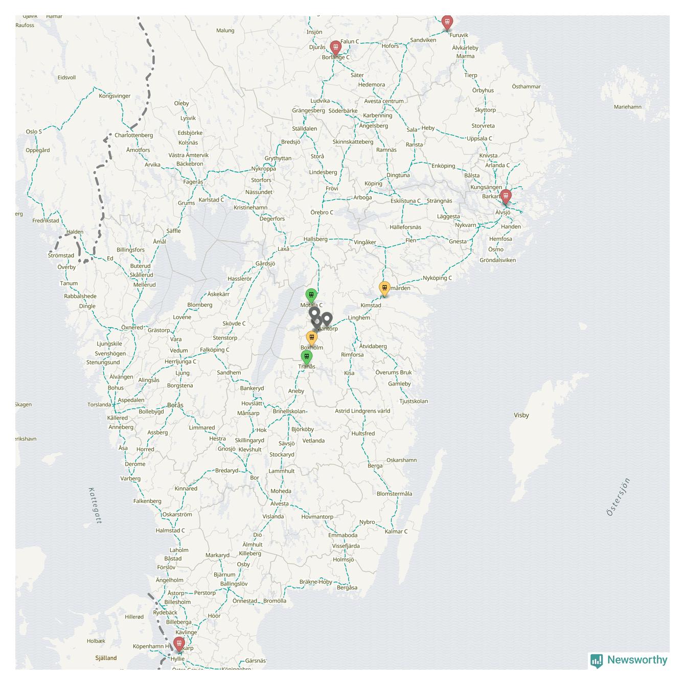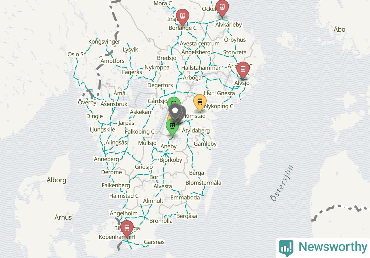 Kartdata från Mapbox, Newsworthy, OpenStreetMap och Trafikverket. Uppgifter om sträckor med passagerartrafik från jarnvag.net.