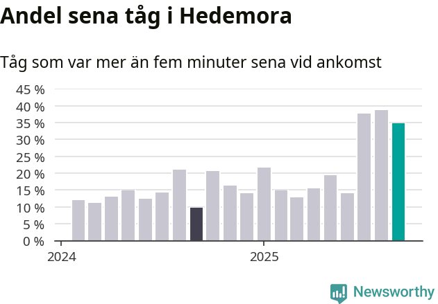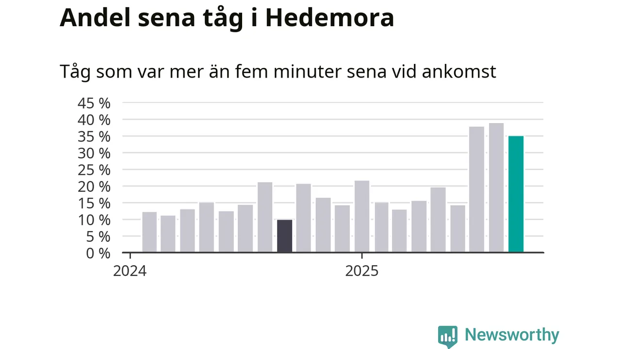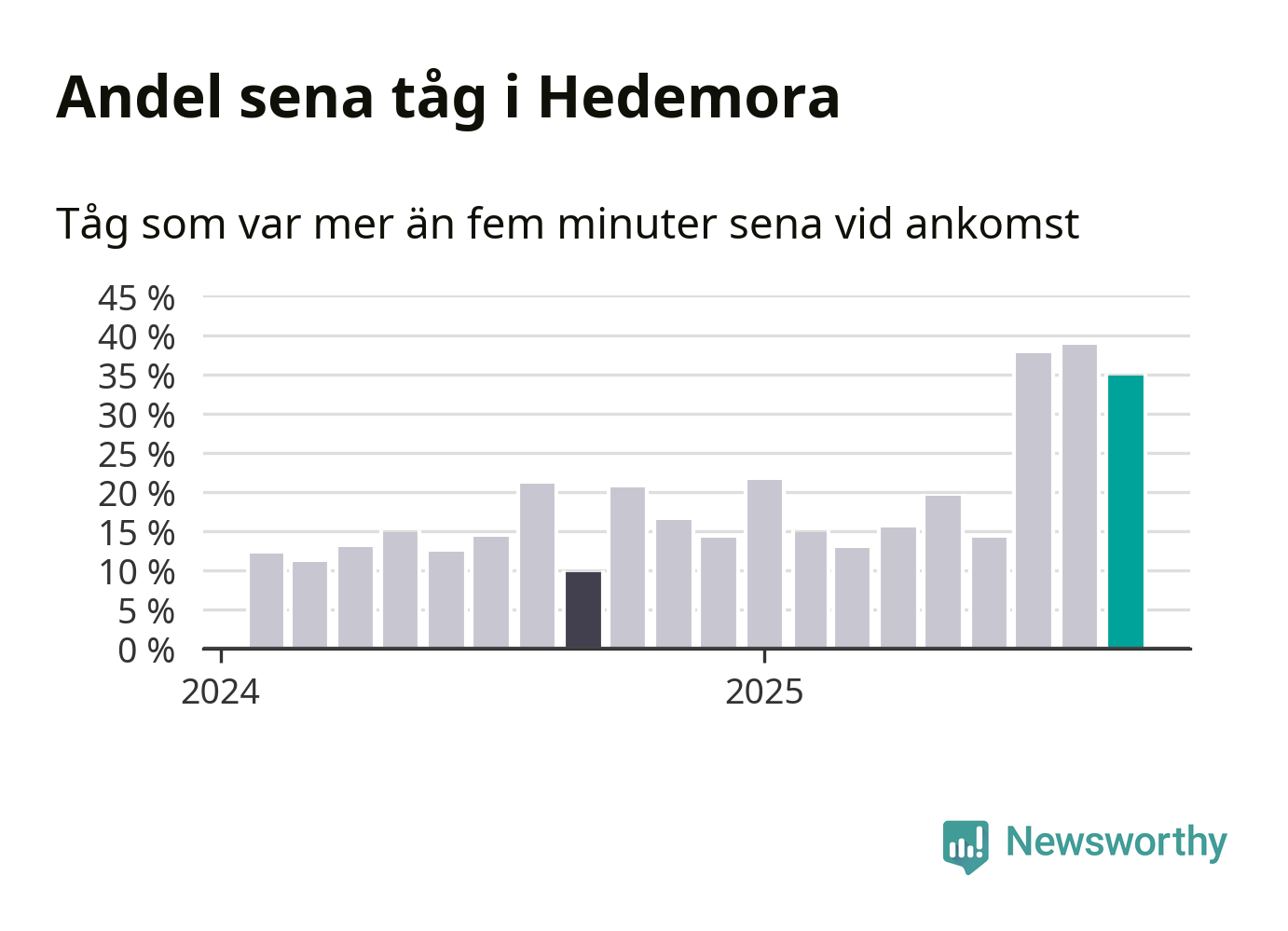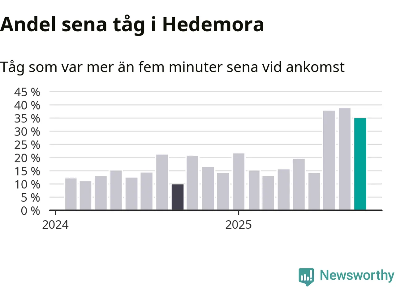 35 procent kan jämföras med 39 procent månaden innan, och tio procent i september 2024. Siffrorna bygger på realtidsinformation om tågavgångar och ankomster från Trafikverket, som Newsworthy löpande samlar in.