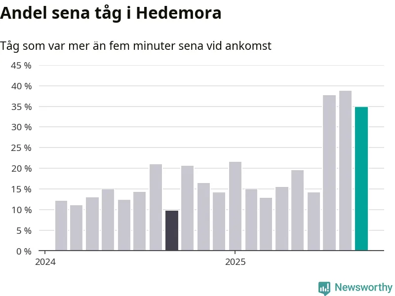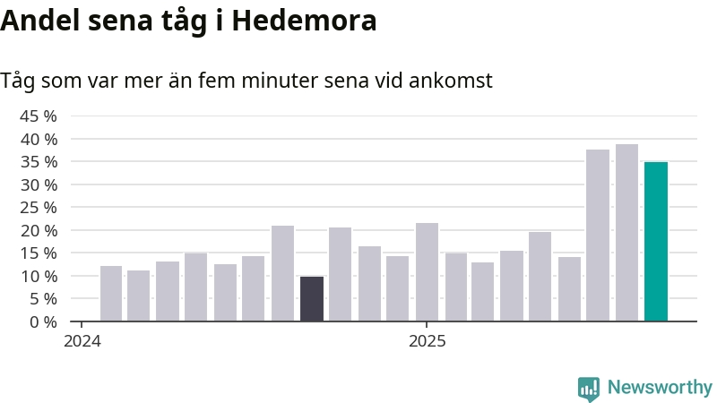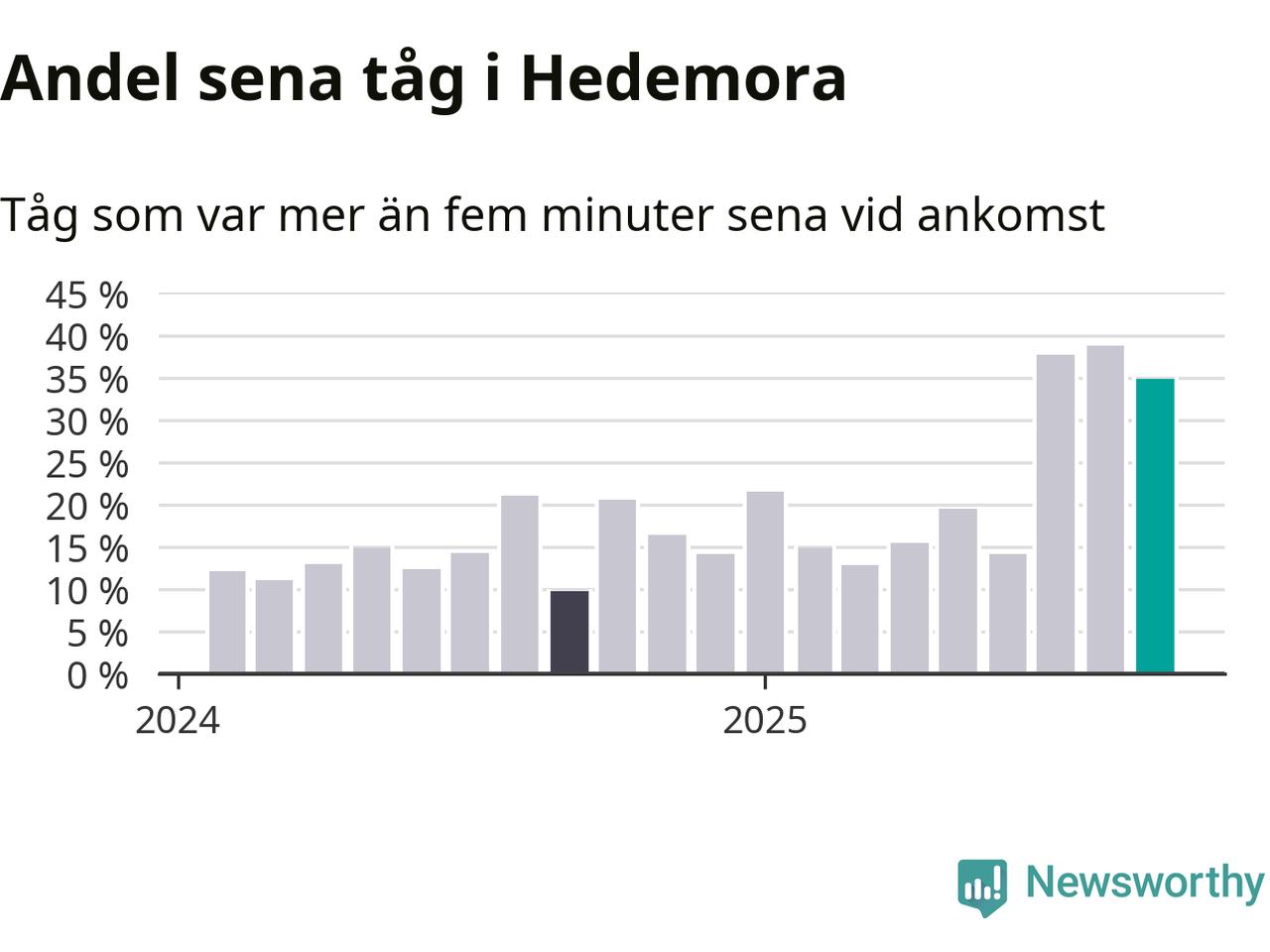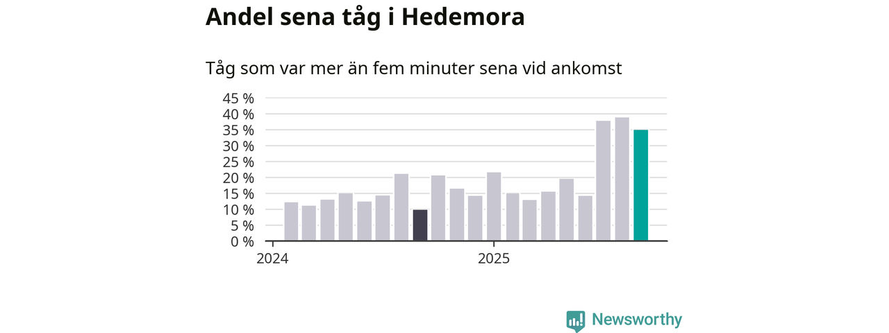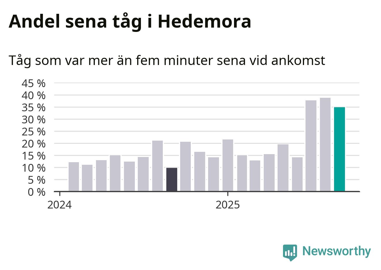 35 procent kan jämföras med 39 procent månaden innan, och tio procent i september 2024. Siffrorna bygger på realtidsinformation om tågavgångar och ankomster från Trafikverket, som Newsworthy löpande samlar in.