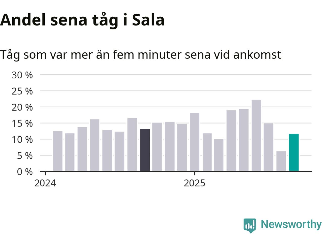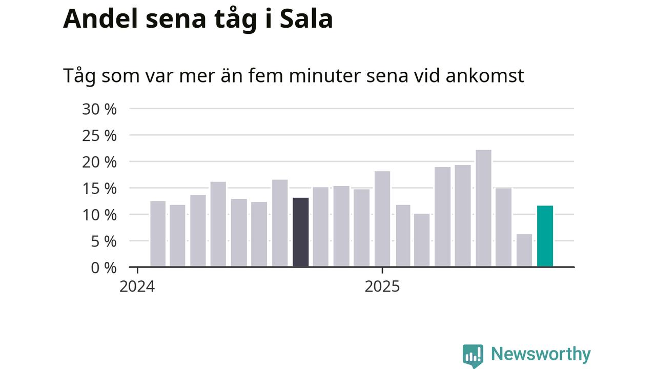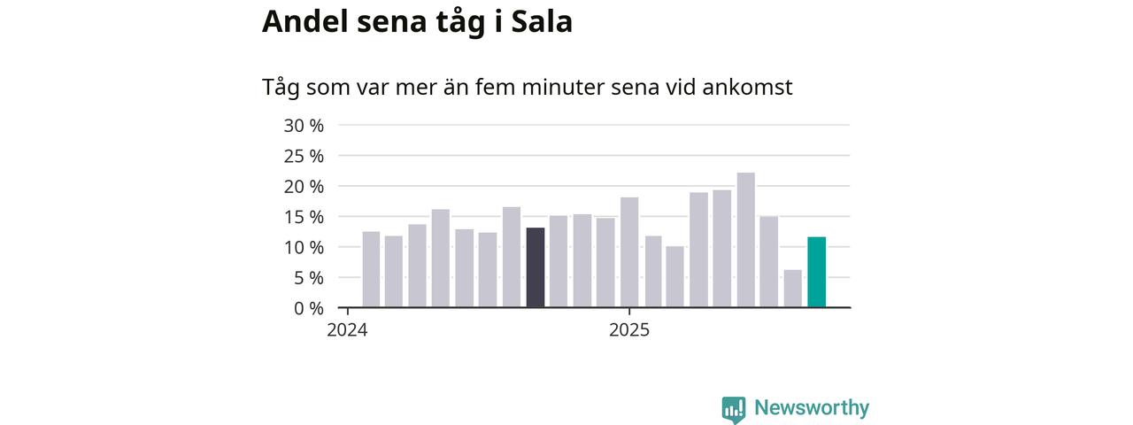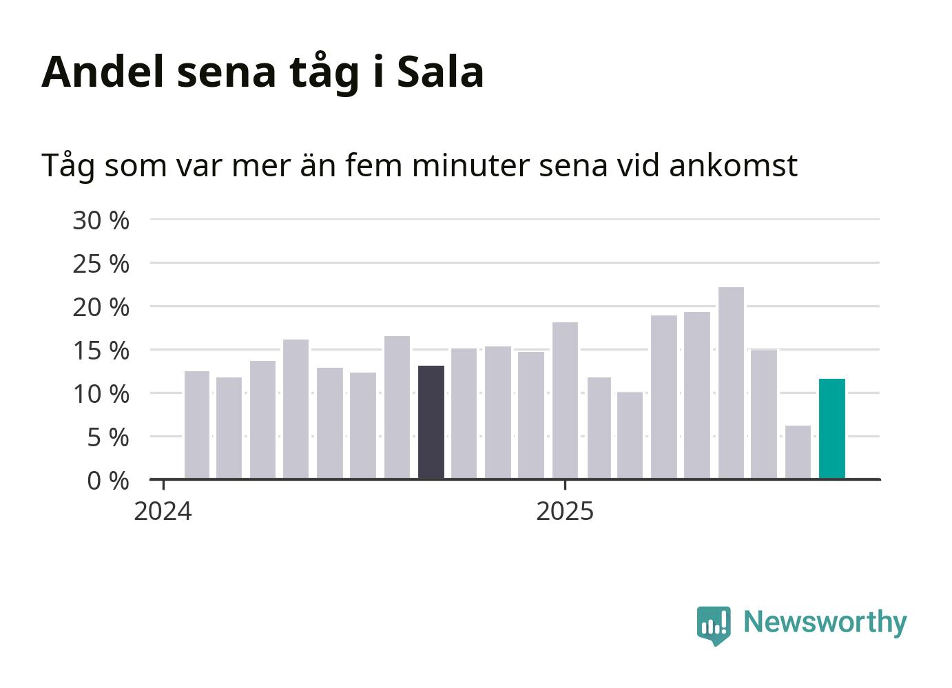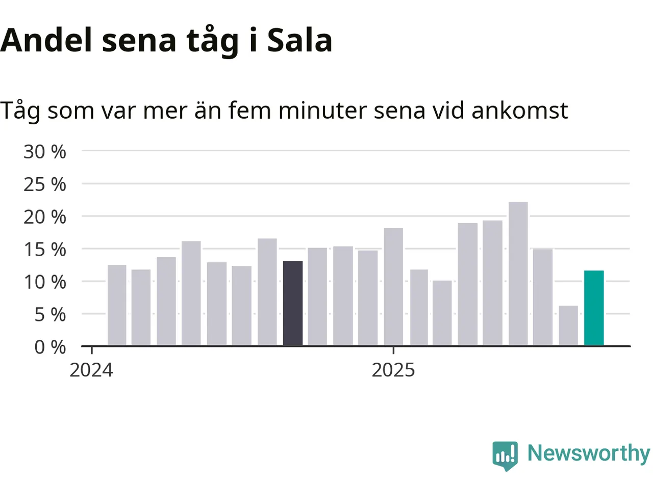 Av knappt 1 000 tåg som passerade någon av stationerna i Sala kommun i september var 114 mer än fem minuter sena. Det motsvarar 12 procent, en bit över den nationella målsättningen som säger att inte mer än fem procent av tågen ska vara sena.