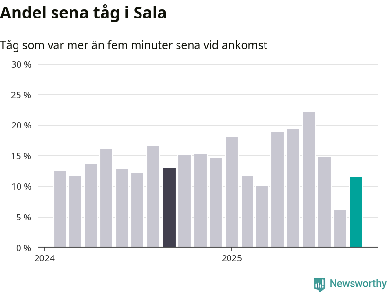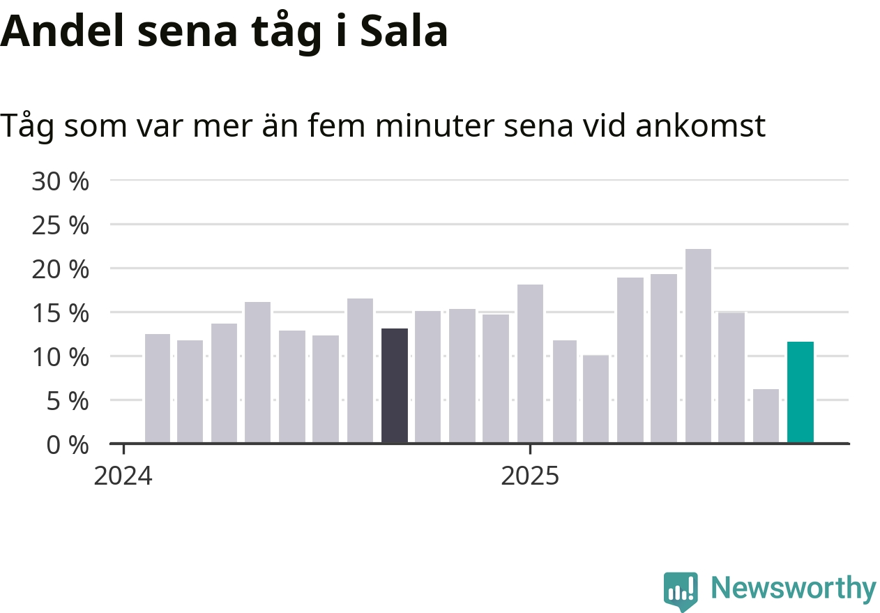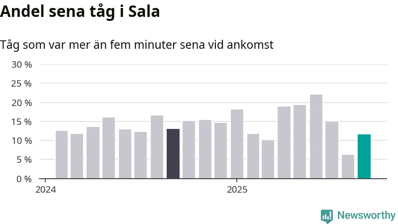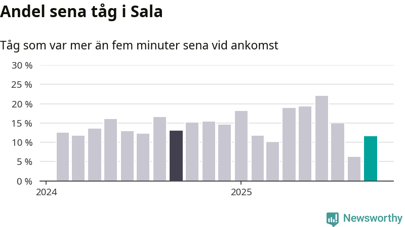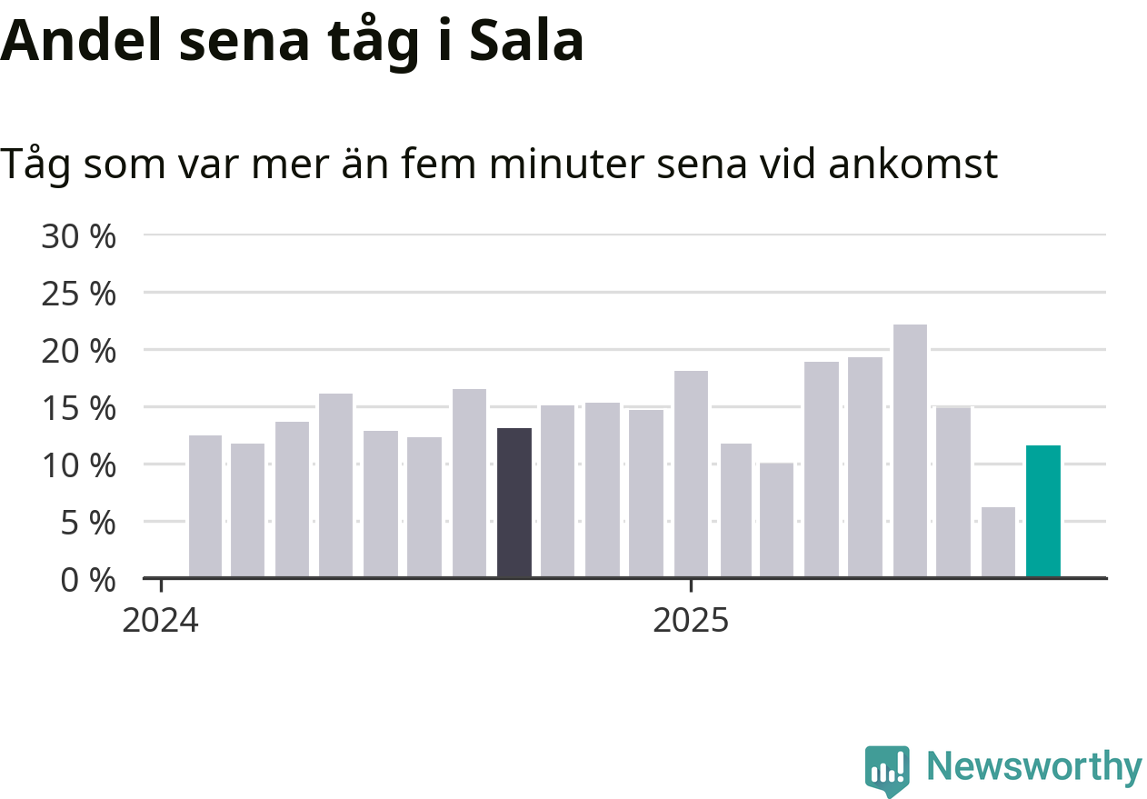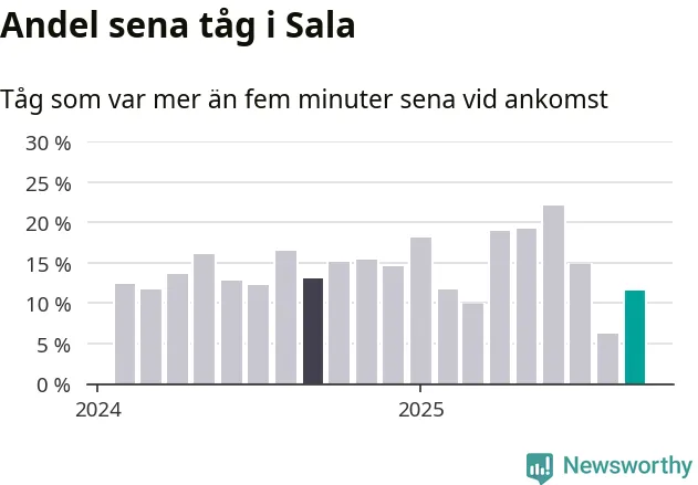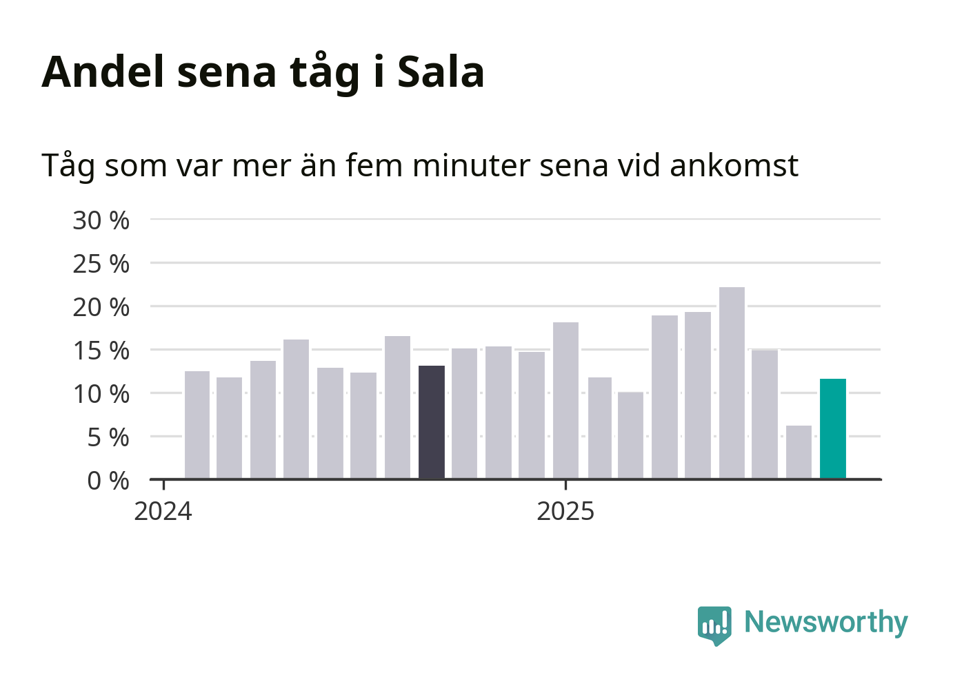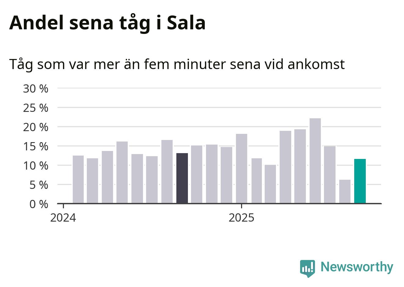 Av knappt 1 000 tåg som passerade någon av stationerna i Sala kommun i september var 114 mer än fem minuter sena. Det motsvarar 12 procent, en bit över den nationella målsättningen som säger att inte mer än fem procent av tågen ska vara sena.