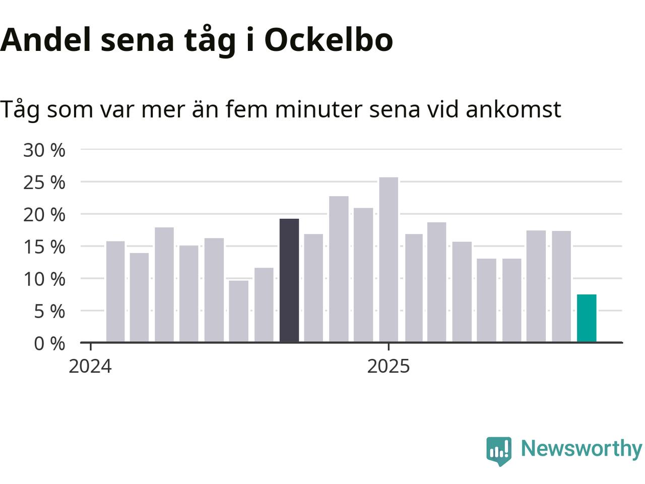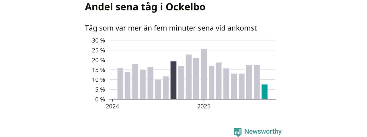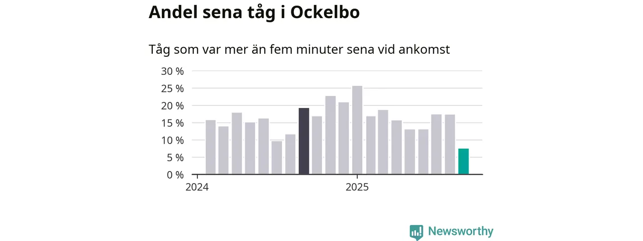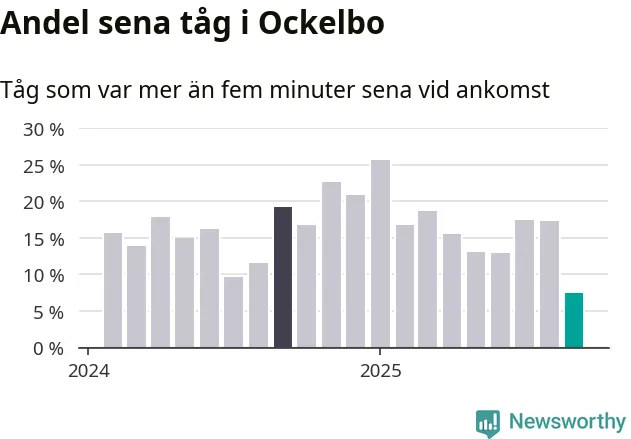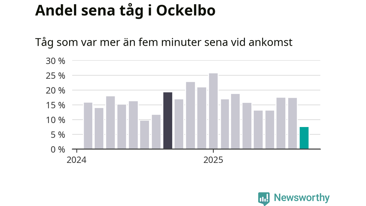 Sju procent är den lägsta andelen sena tåg sedan Newsworthy började mäta lokala förseningar i början av 2024. Siffrorna bygger på realtidsinformation om tågavgångar och ankomster från Trafikverket, som Newsworthy löpande samlar in.