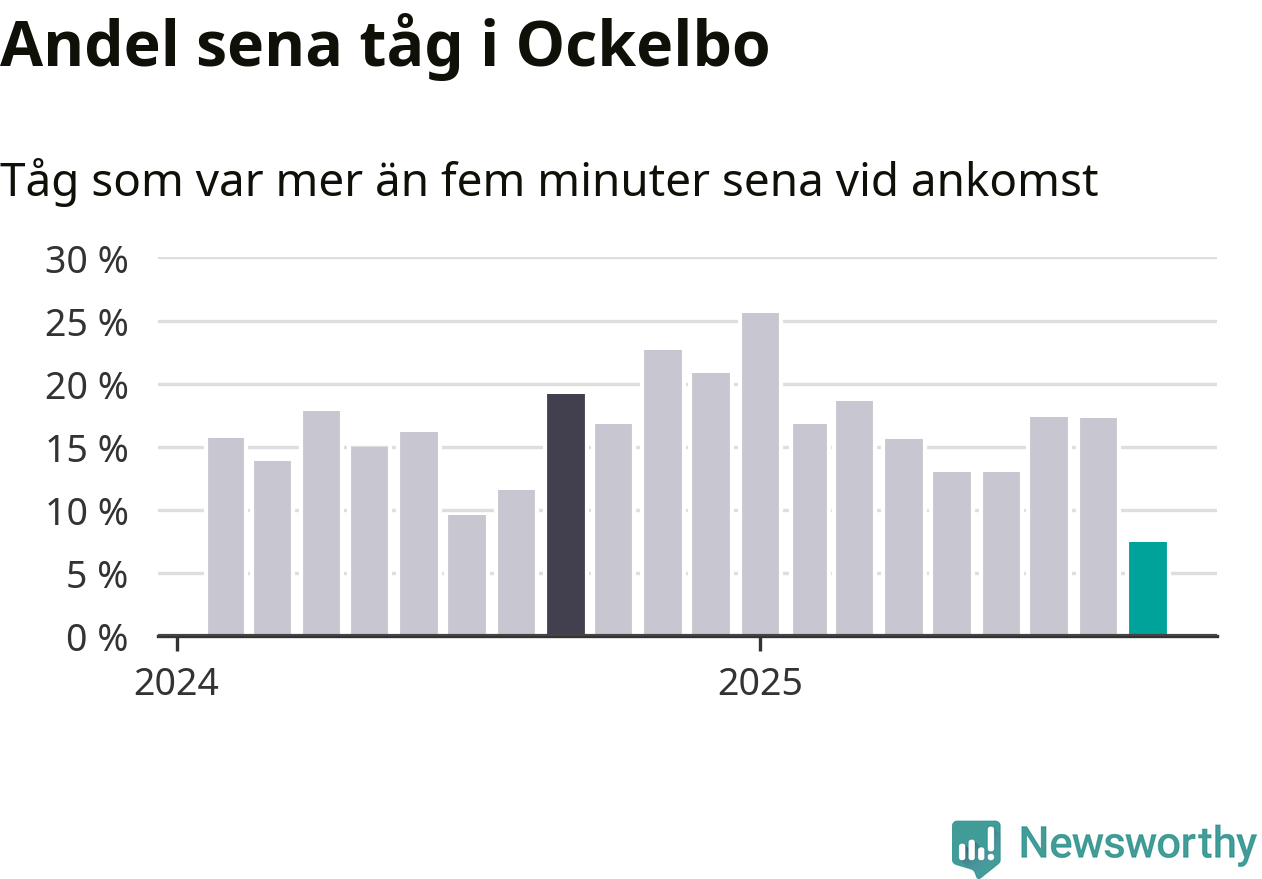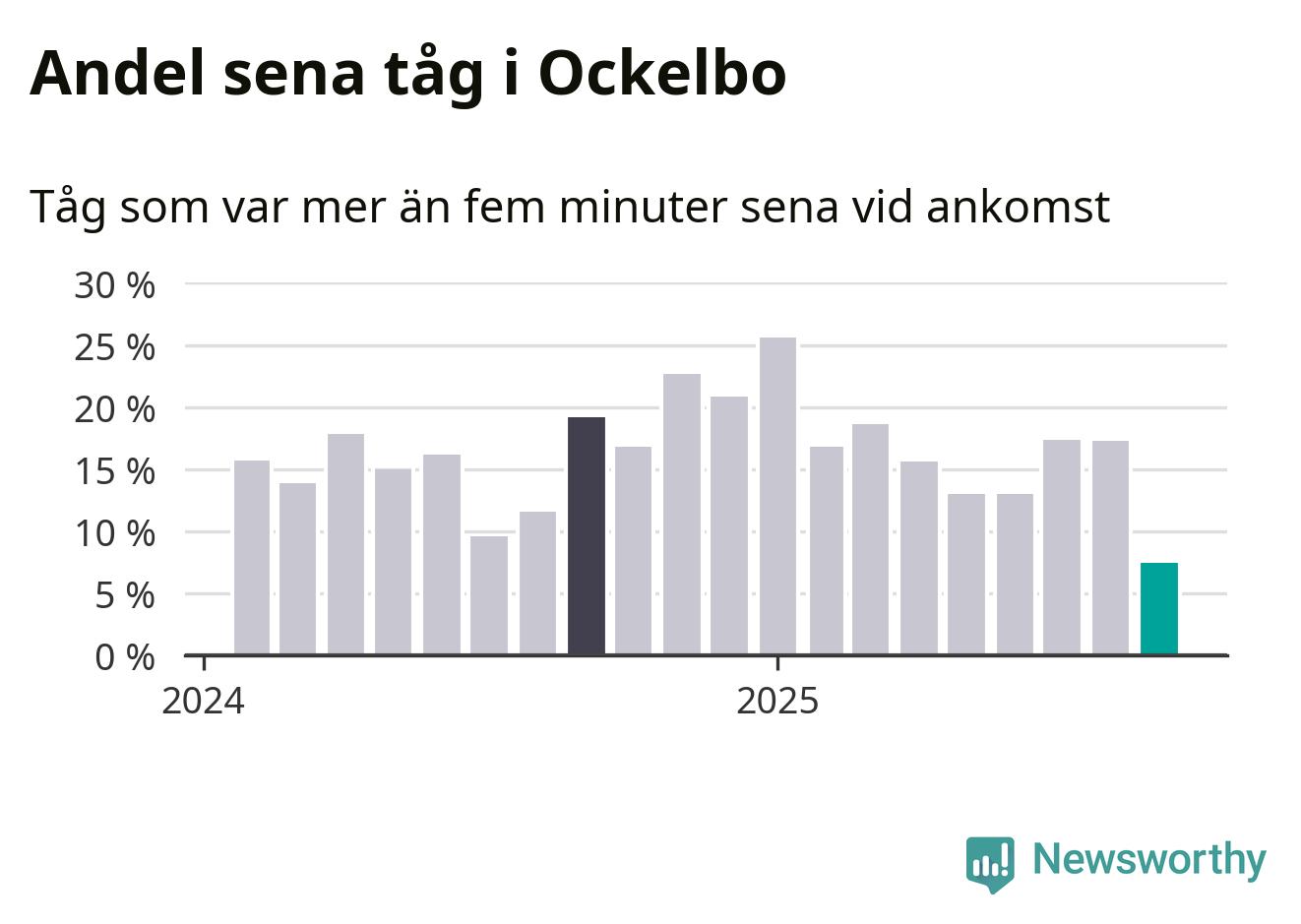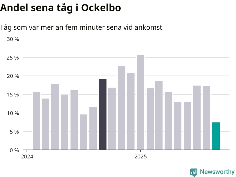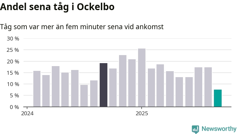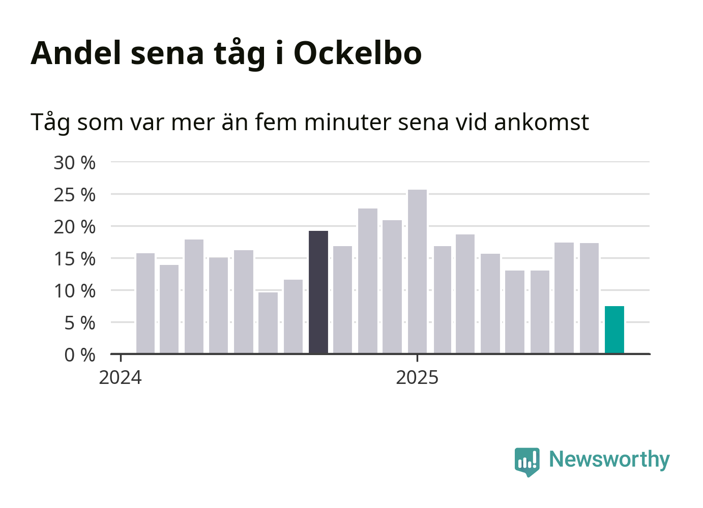 Sju procent är den lägsta andelen sena tåg sedan Newsworthy började mäta lokala förseningar i början av 2024. Siffrorna bygger på realtidsinformation om tågavgångar och ankomster från Trafikverket, som Newsworthy löpande samlar in.