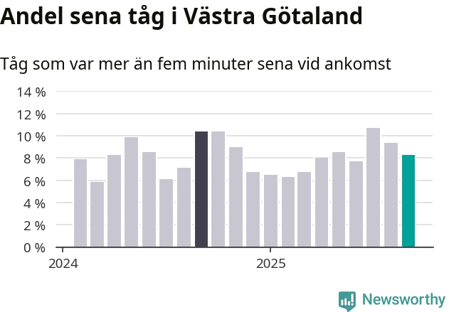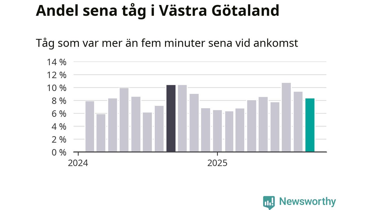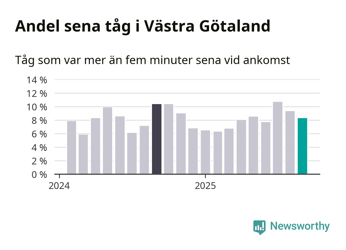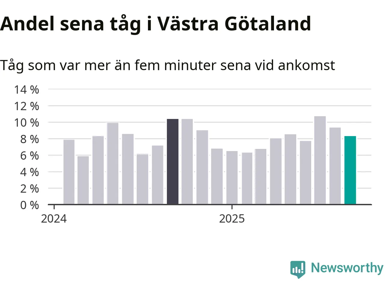 Åtta procent kan jämföras med nio procent månaden innan, och tio procent i september 2024. Siffrorna bygger på realtidsinformation om tågavgångar och ankomster från Trafikverket, som Newsworthy löpande samlar in.