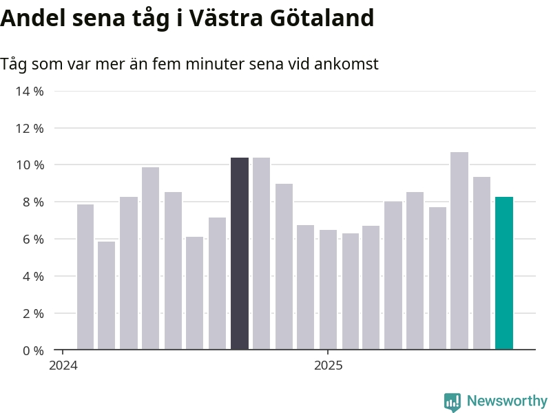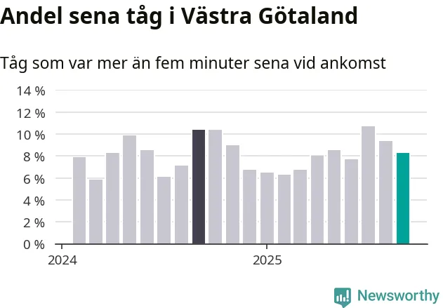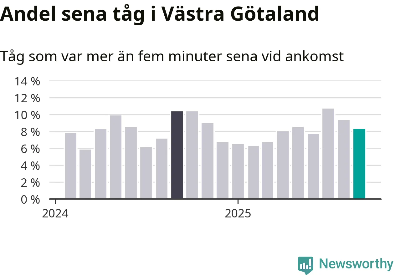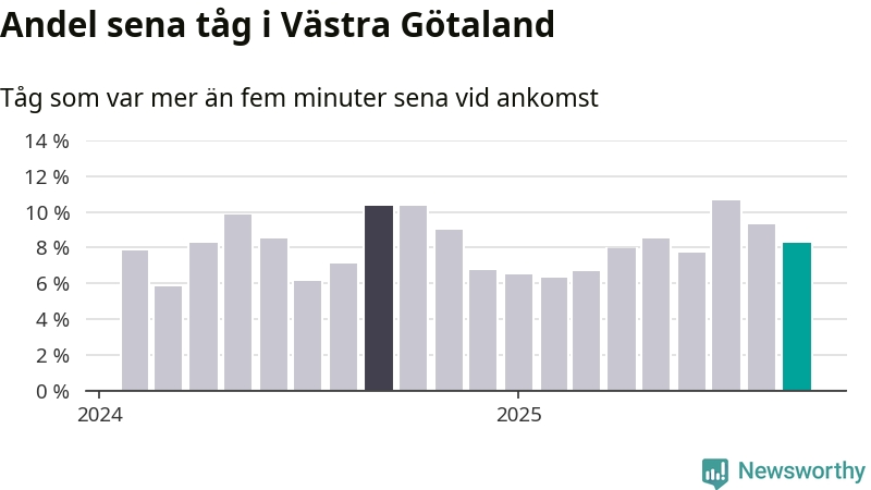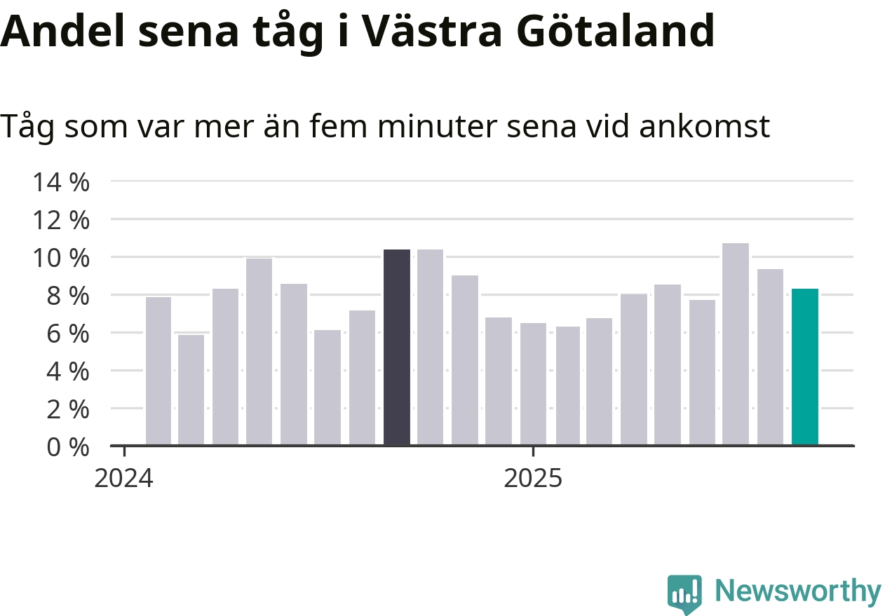 Åtta procent kan jämföras med nio procent månaden innan, och tio procent i september 2024. Siffrorna bygger på realtidsinformation om tågavgångar och ankomster från Trafikverket, som Newsworthy löpande samlar in.