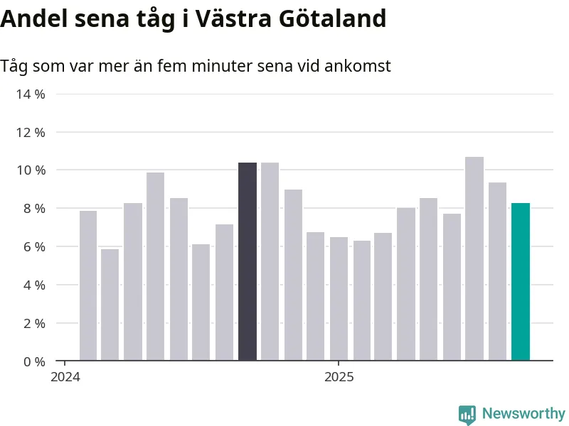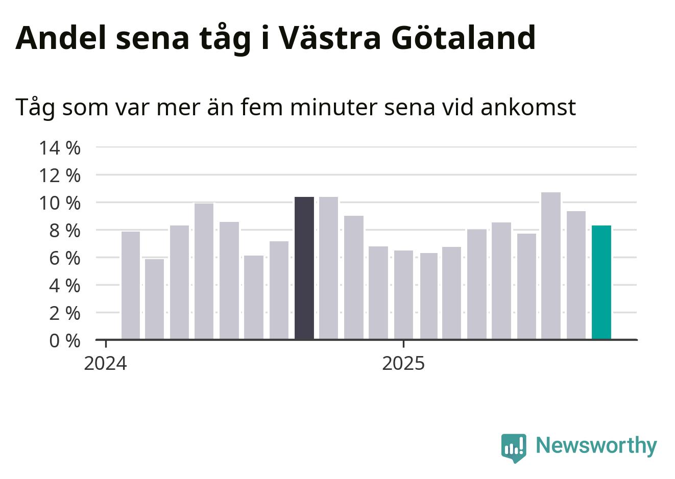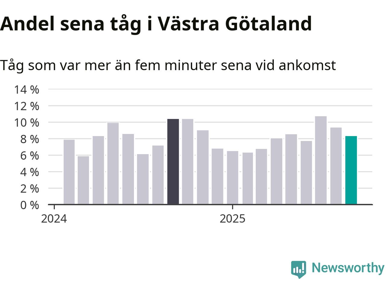 Av omkring 20 400 tåg som passerade någon av stationerna i Västra Götalands län i september var 1 690 mer än fem minuter sena. Det motsvarar 8 procent, en bit över den nationella målsättningen som säger att inte mer än fem procent av tågen ska vara sena.
