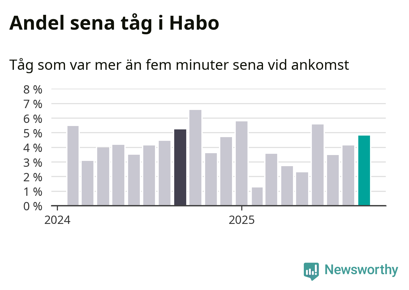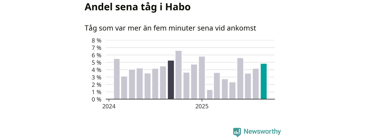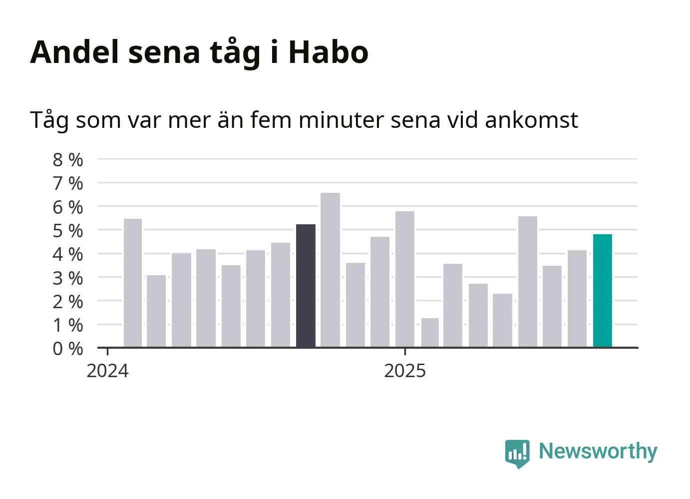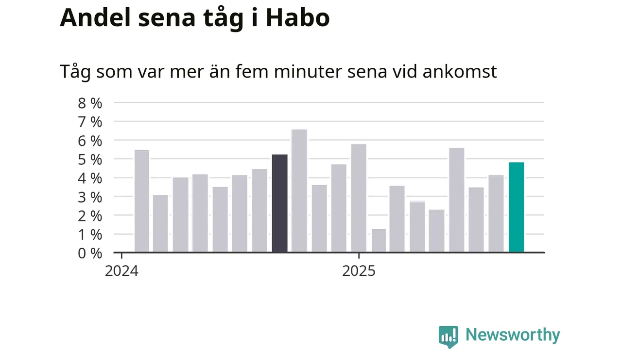 Fem procent kan jämföras med fyra procent månaden innan, och fem procent i september 2024. Siffrorna bygger på realtidsinformation om tågavgångar och ankomster från Trafikverket, som Newsworthy löpande samlar in.