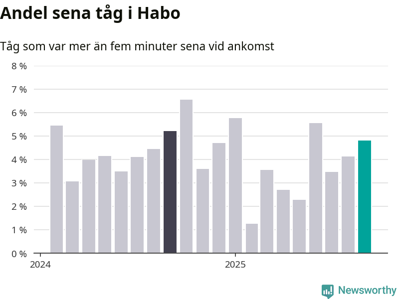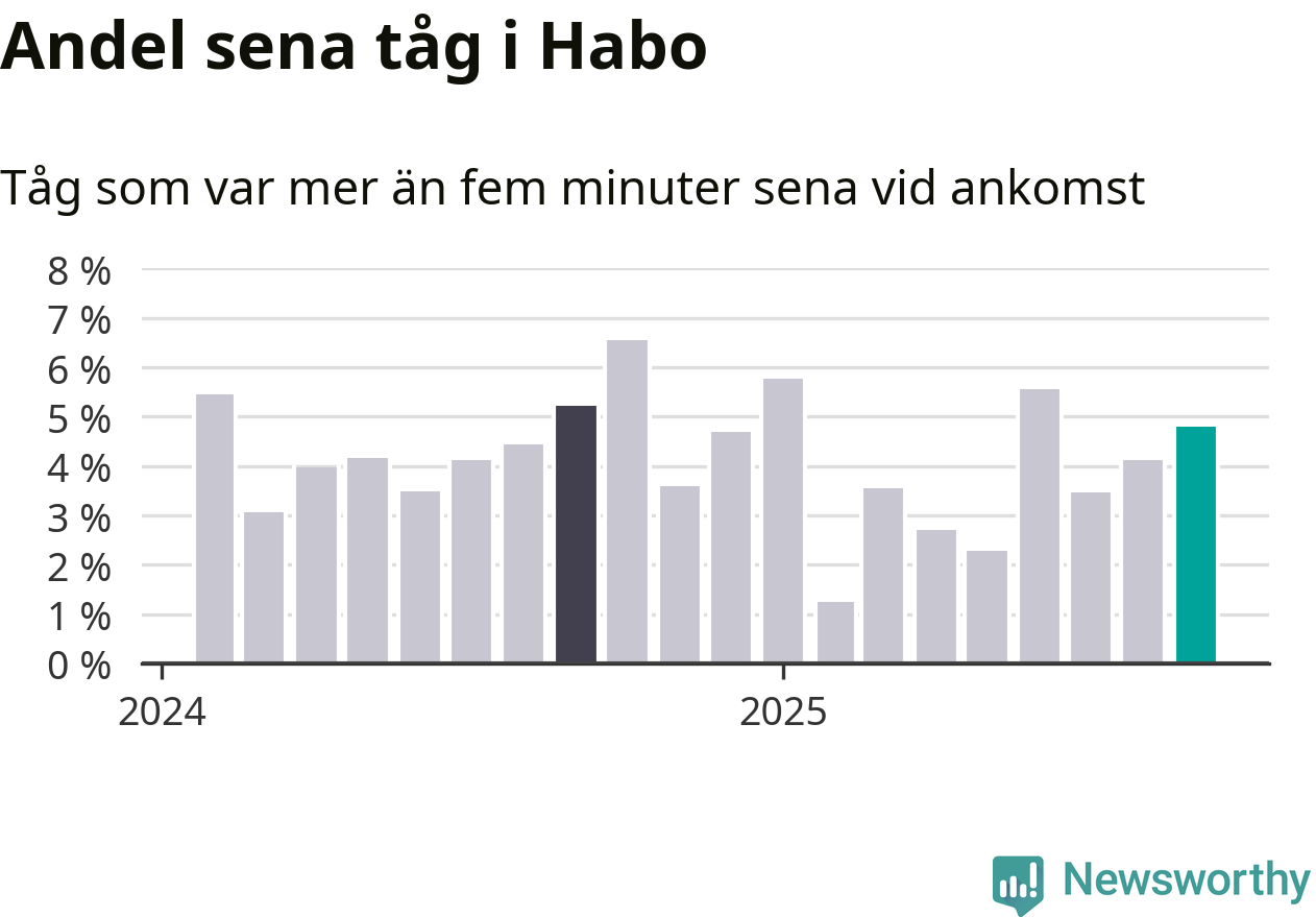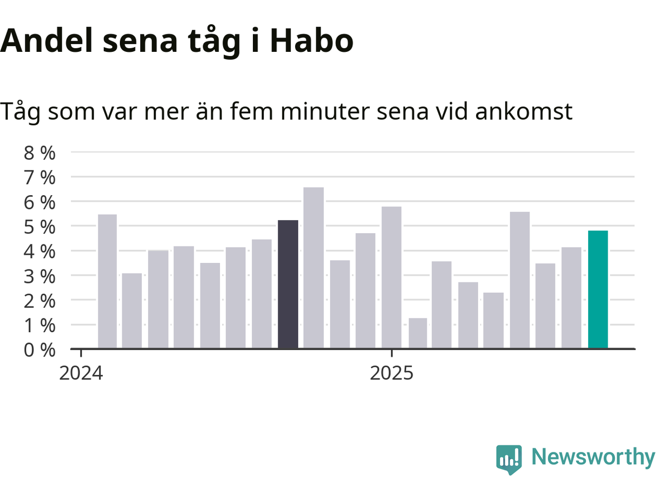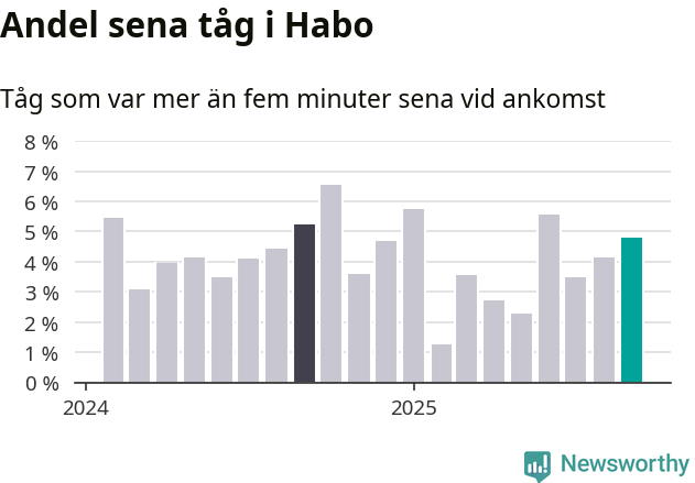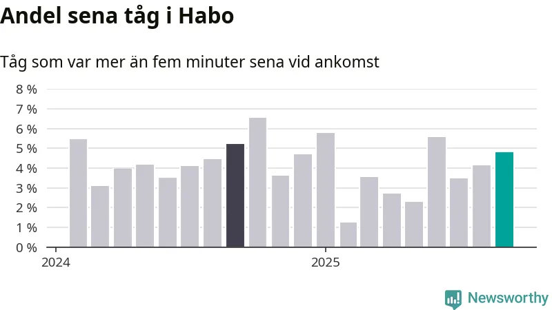 Fem procent kan jämföras med fyra procent månaden innan, och fem procent i september 2024. Siffrorna bygger på realtidsinformation om tågavgångar och ankomster från Trafikverket, som Newsworthy löpande samlar in.
