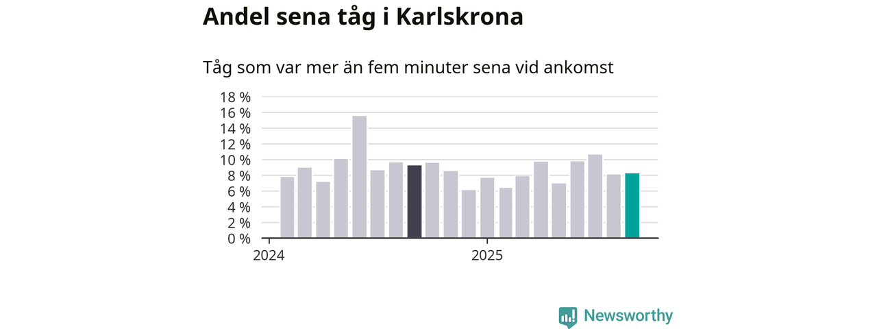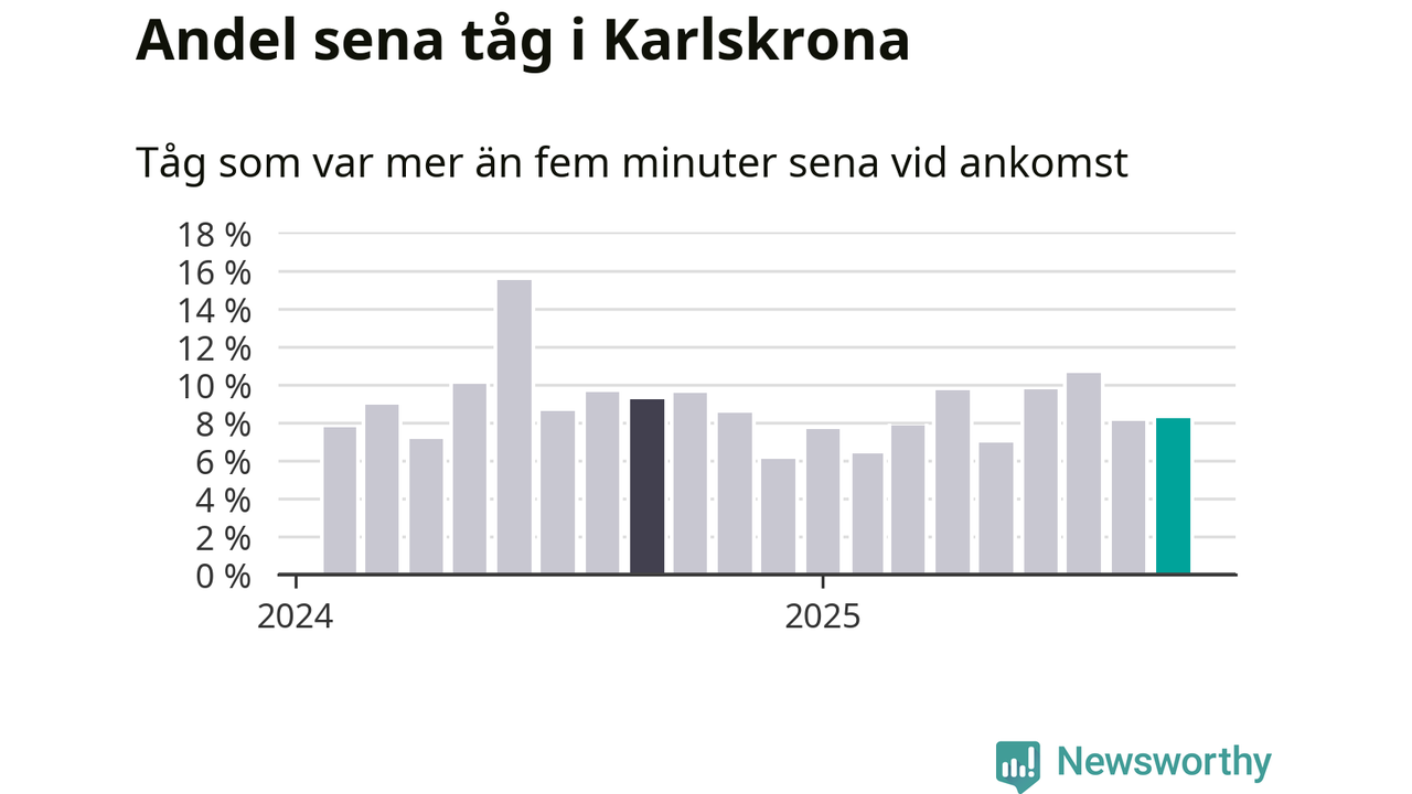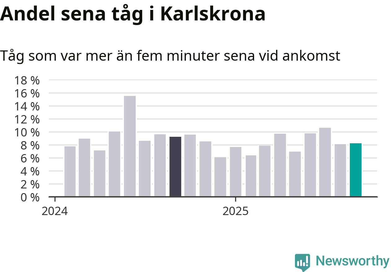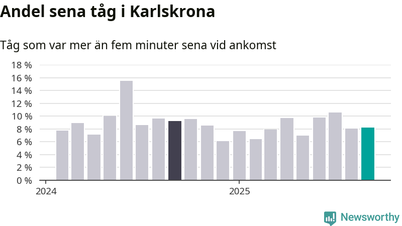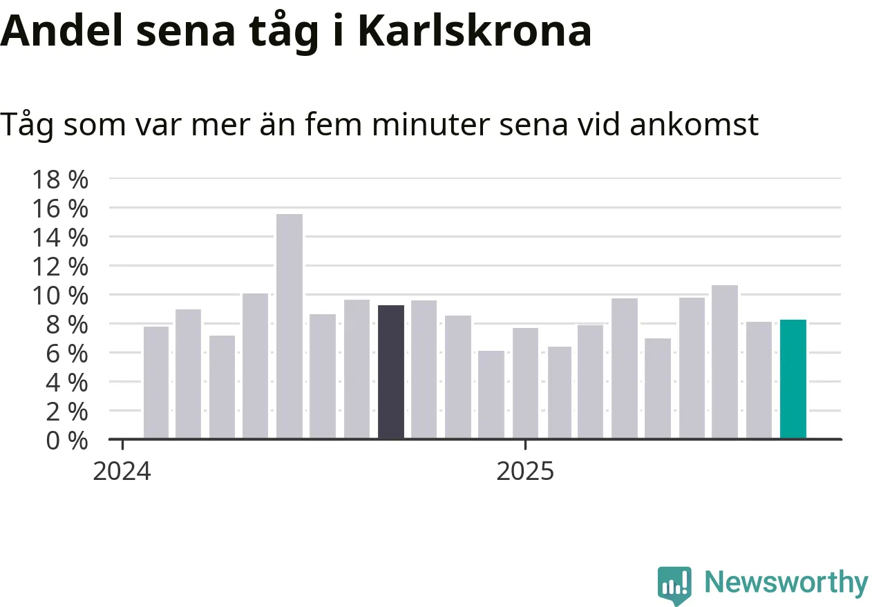 Åtta procent är marginellt mer än månaden innan, och kan jämföras med nio procent i september 2024. Siffrorna bygger på realtidsinformation om tågavgångar och ankomster från Trafikverket, som Newsworthy löpande samlar in.