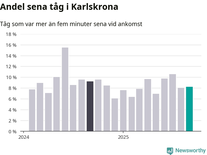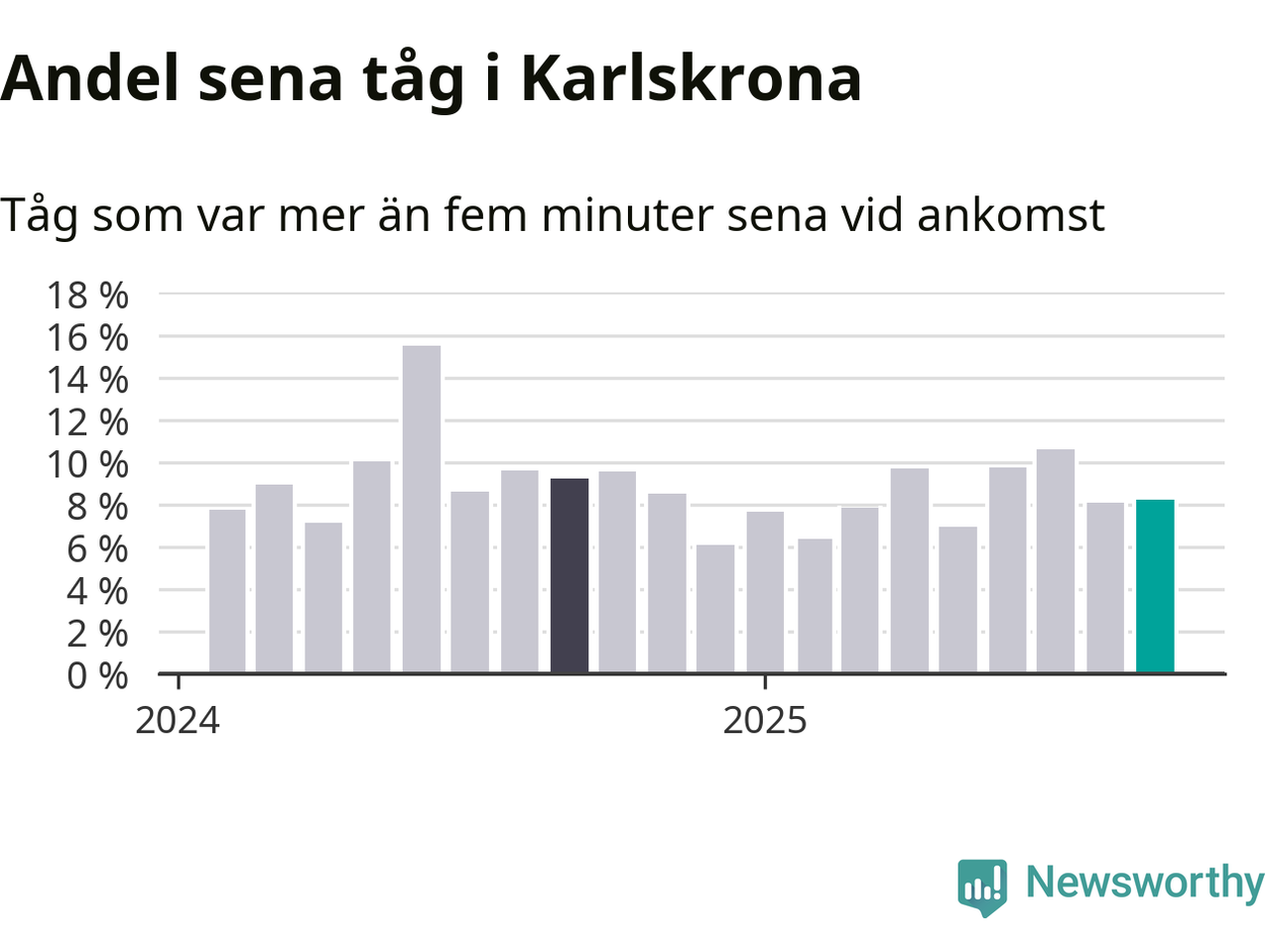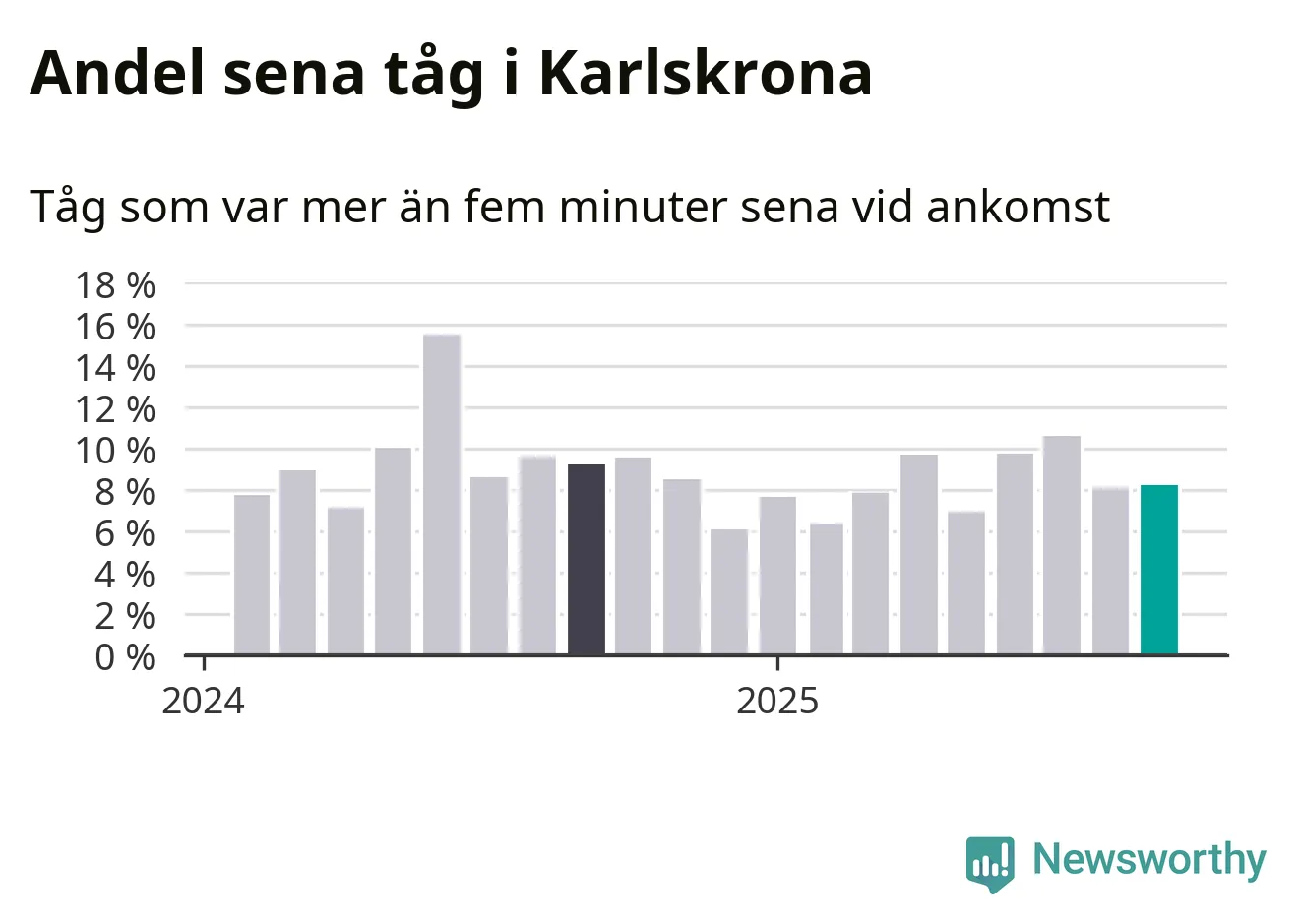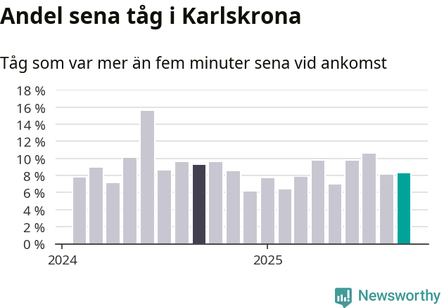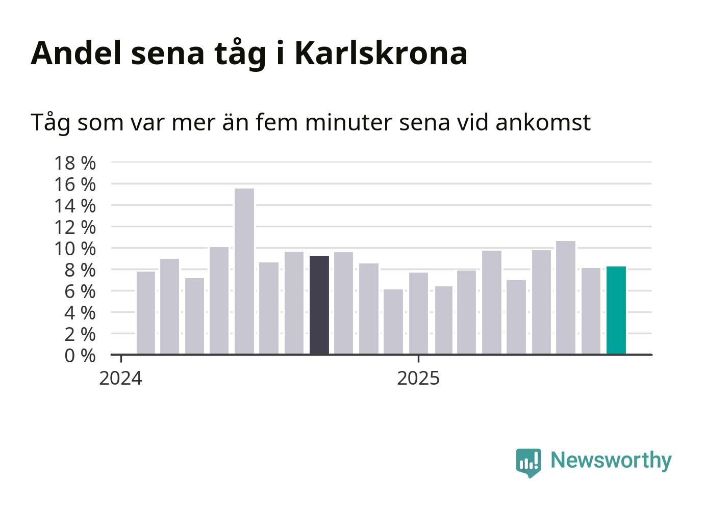 Åtta procent är marginellt mer än månaden innan, och kan jämföras med nio procent i september 2024. Siffrorna bygger på realtidsinformation om tågavgångar och ankomster från Trafikverket, som Newsworthy löpande samlar in.