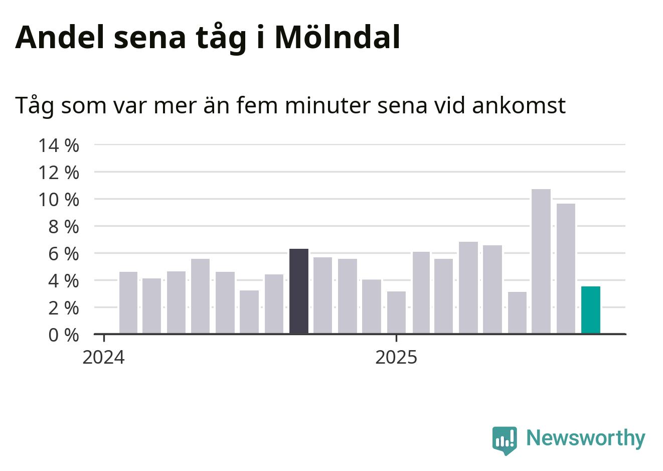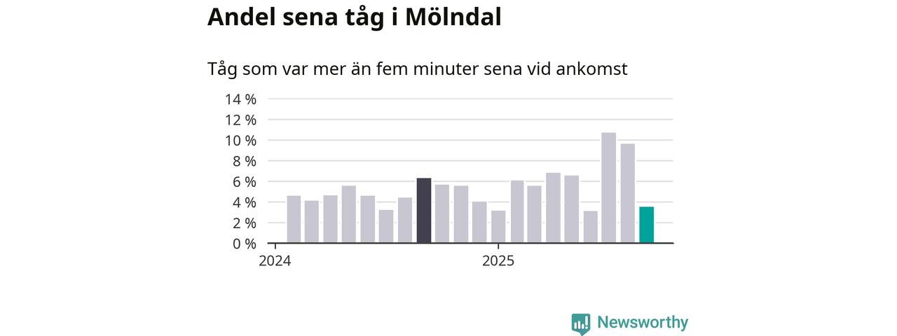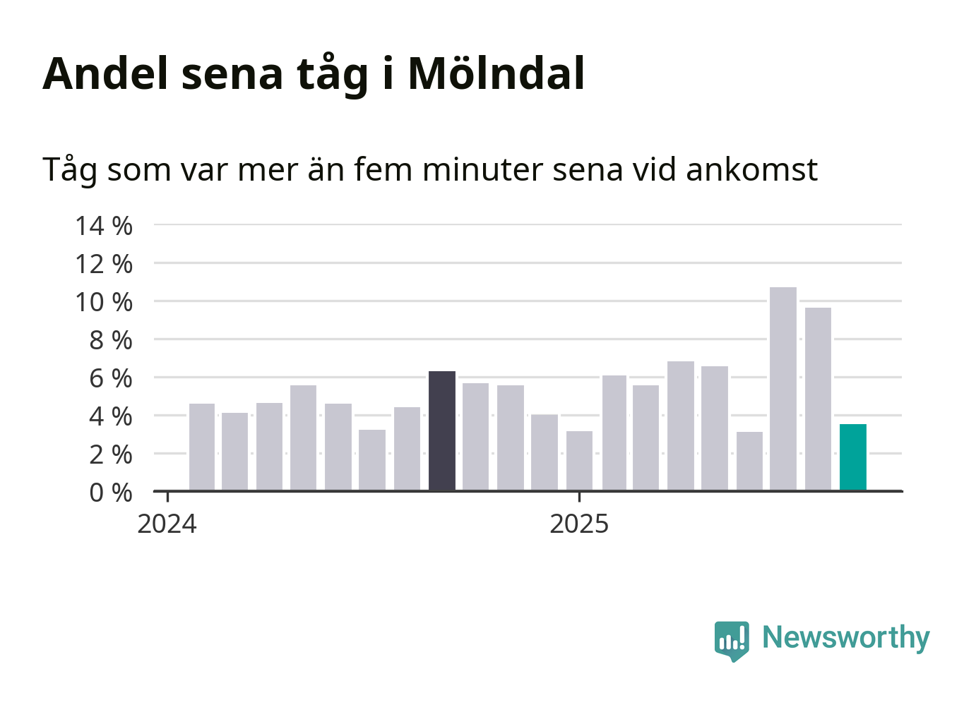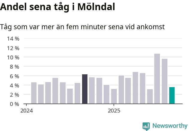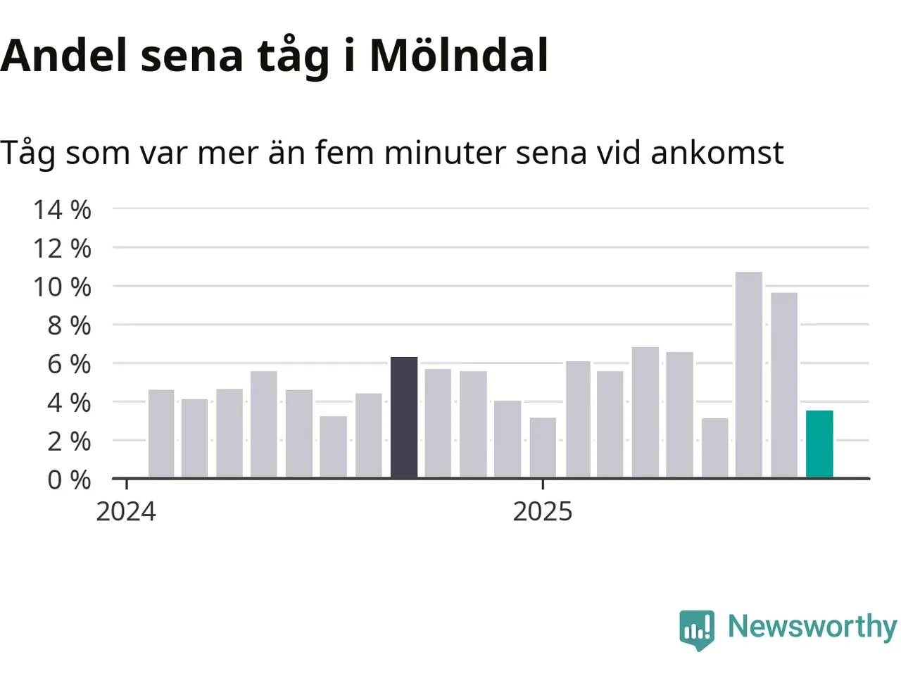 Fyra procent kan jämföras med tio procent månaden innan, och sex procent i september 2024. Siffrorna bygger på realtidsinformation om tågavgångar och ankomster från Trafikverket, som Newsworthy löpande samlar in.
