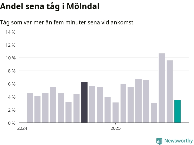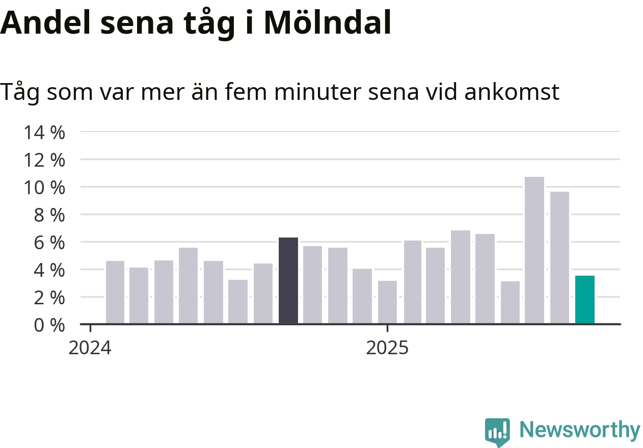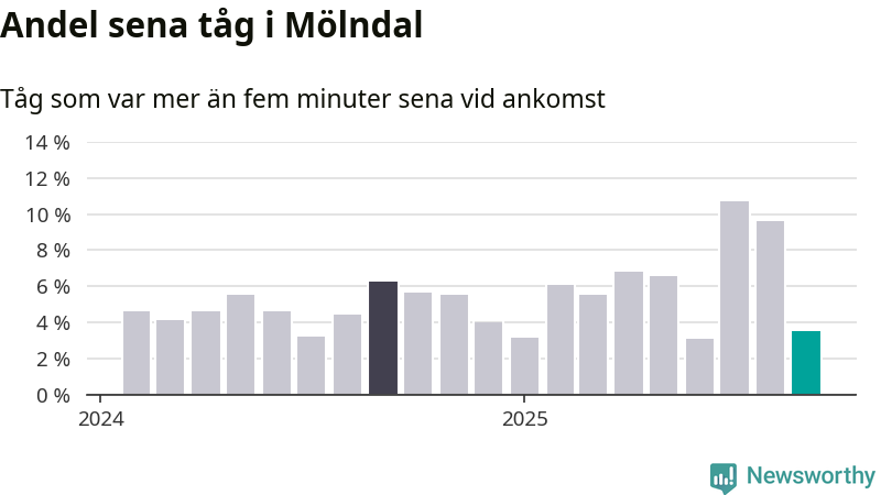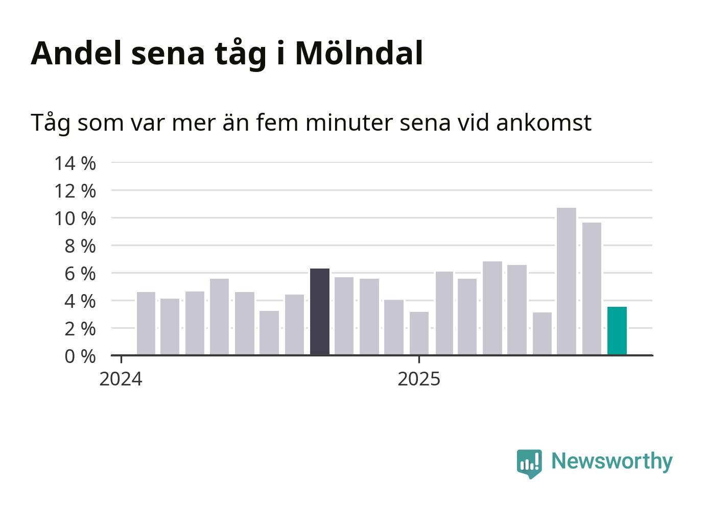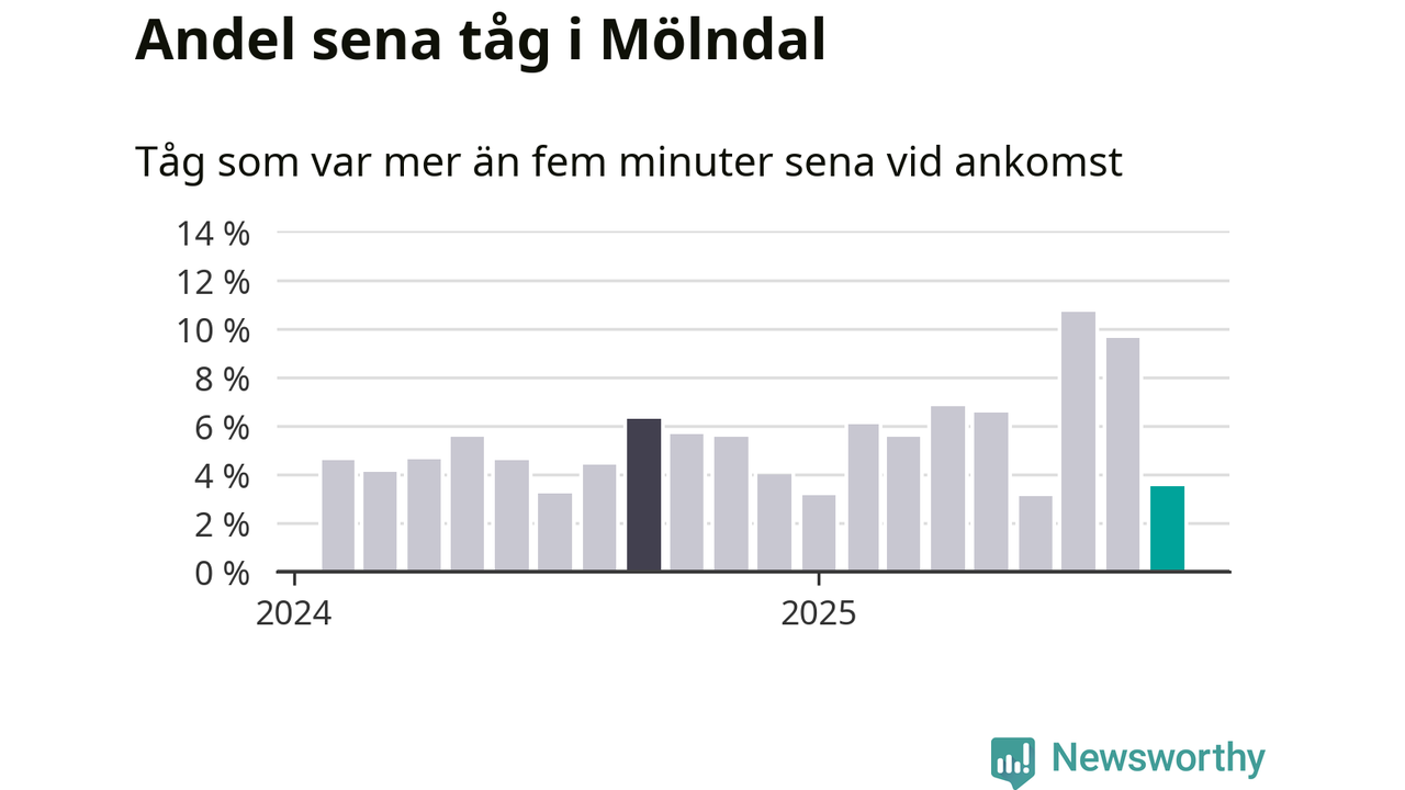 Fyra procent kan jämföras med tio procent månaden innan, och sex procent i september 2024. Siffrorna bygger på realtidsinformation om tågavgångar och ankomster från Trafikverket, som Newsworthy löpande samlar in.