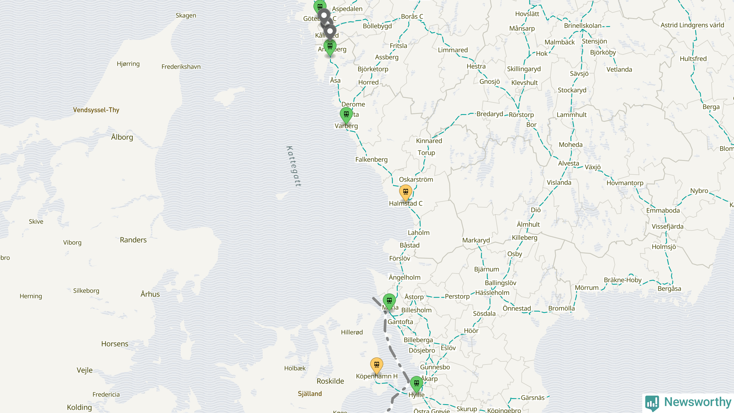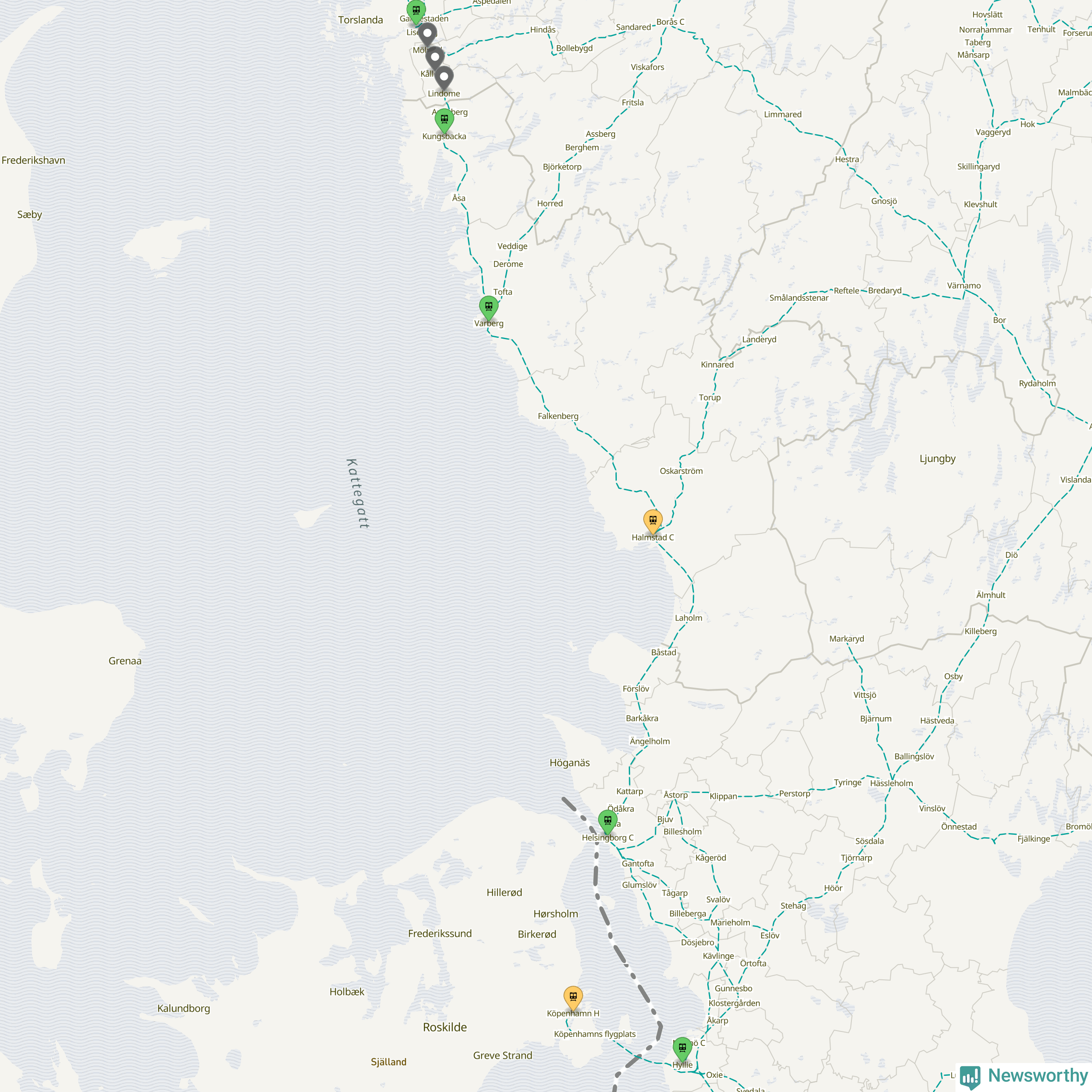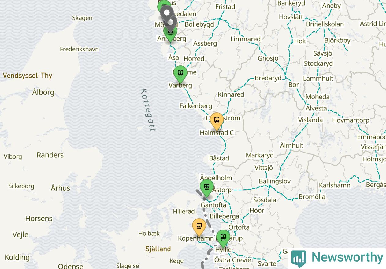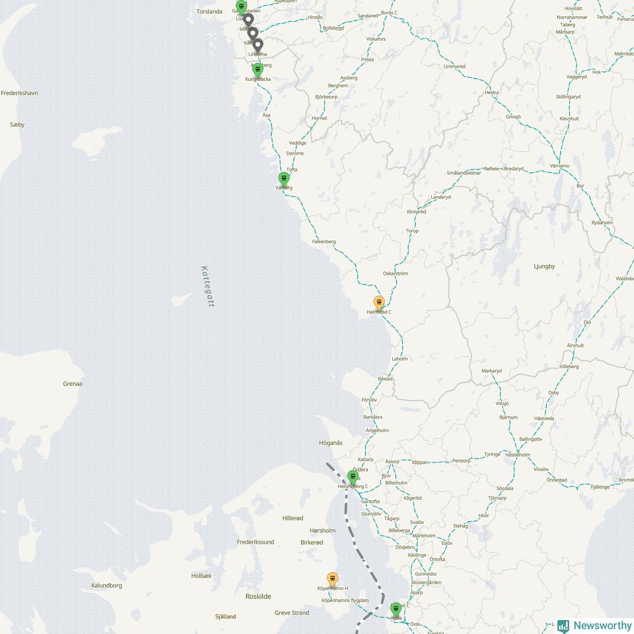 Kartdata från Mapbox, Newsworthy, OpenStreetMap och Trafikverket. Uppgifter om sträckor med passagerartrafik från jarnvag.net.
