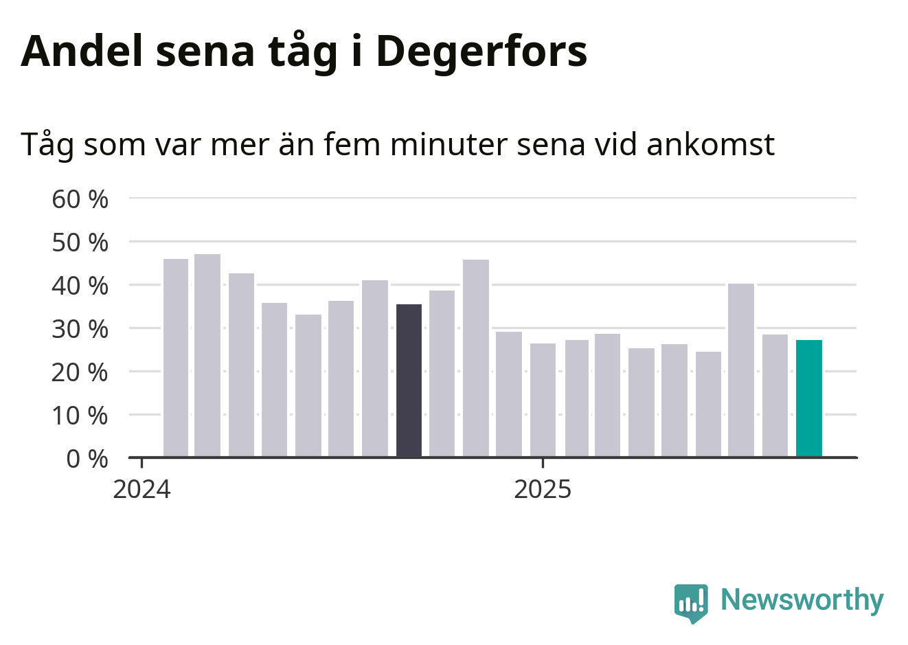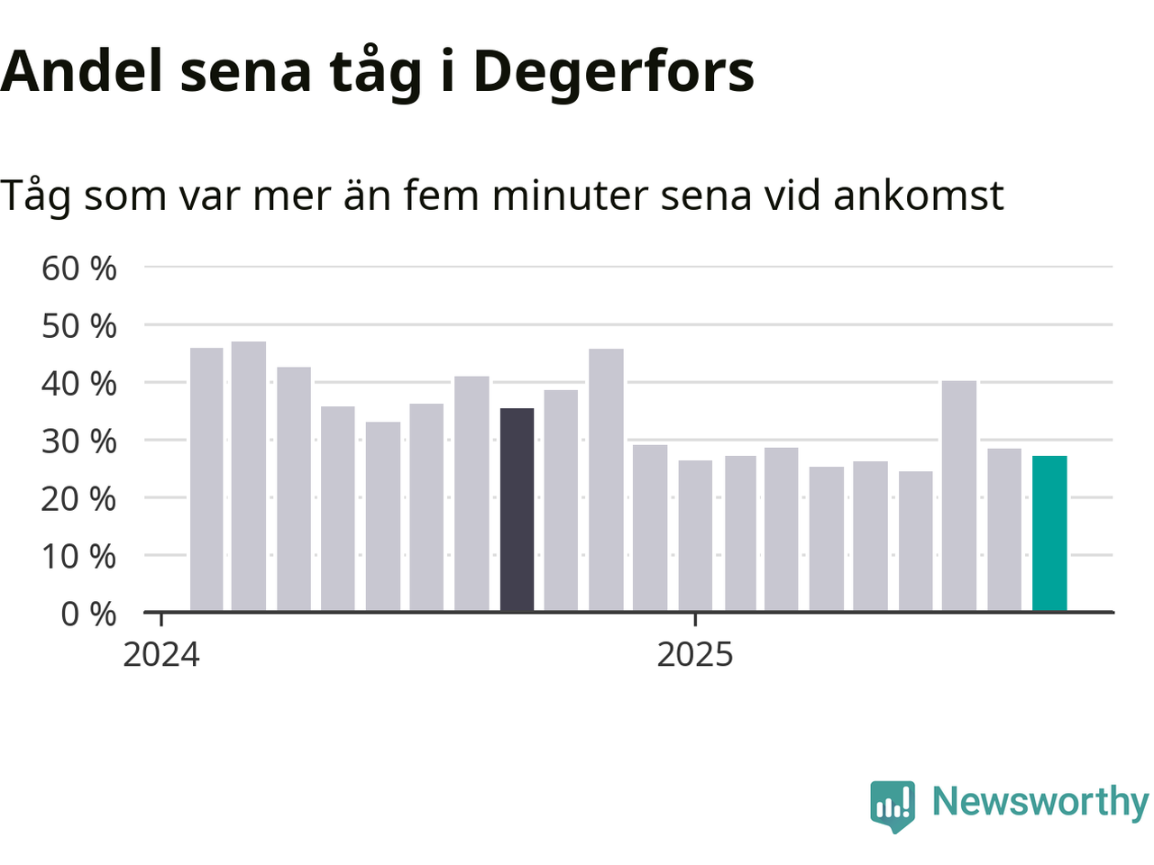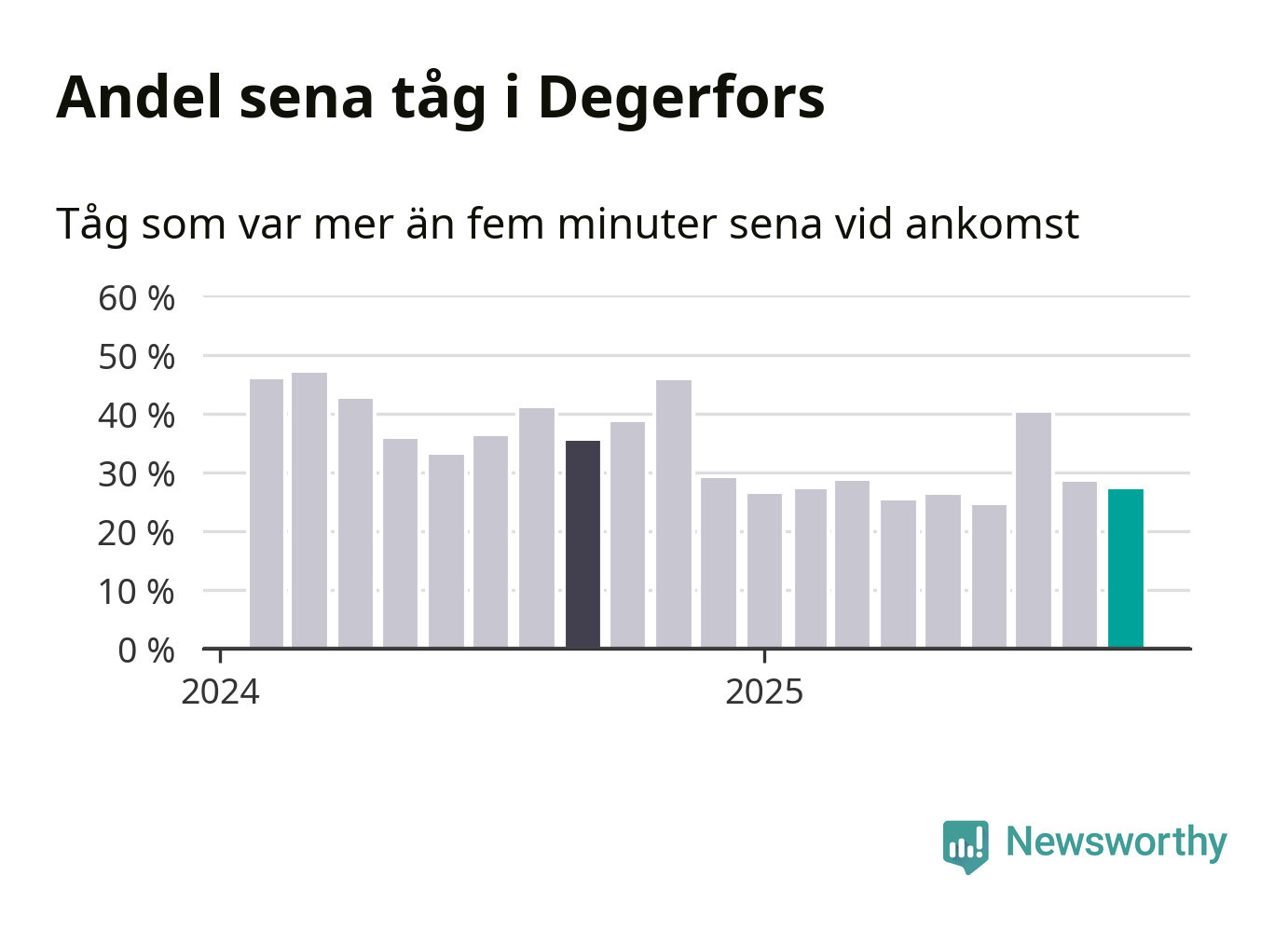 27 procent kan jämföras med 28 procent månaden innan, och 35 procent i september 2024. Siffrorna bygger på realtidsinformation om tågavgångar och ankomster från Trafikverket, som Newsworthy löpande samlar in.