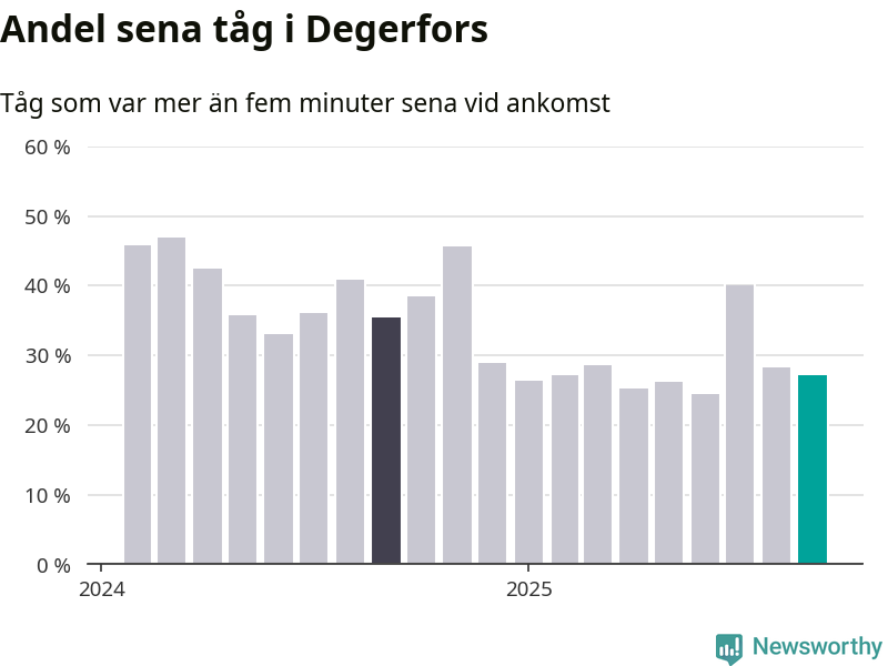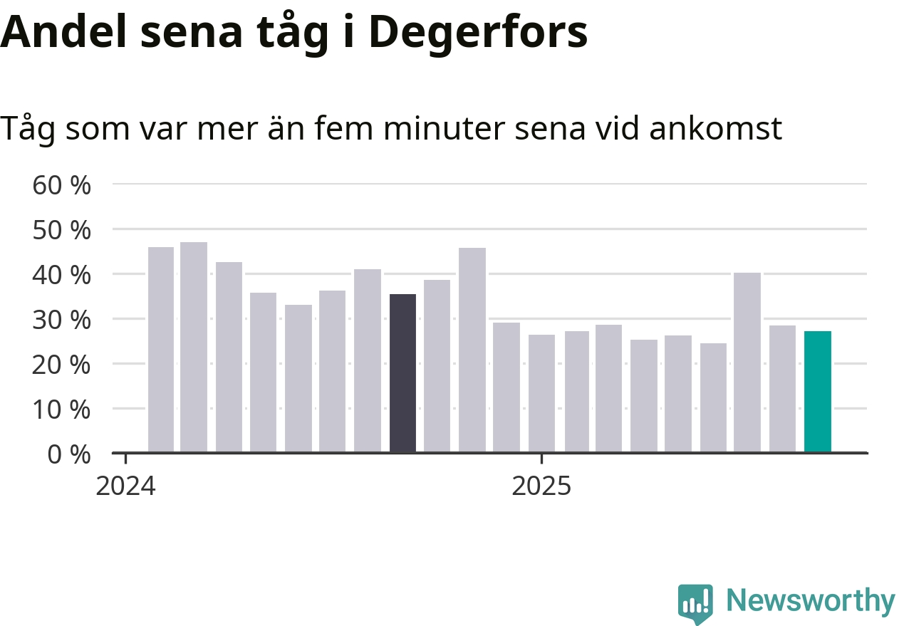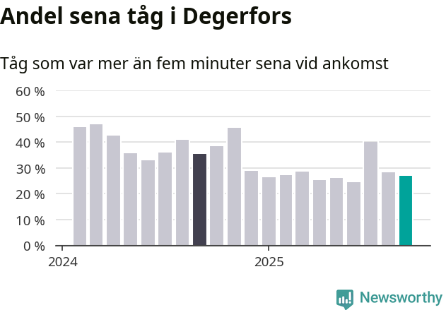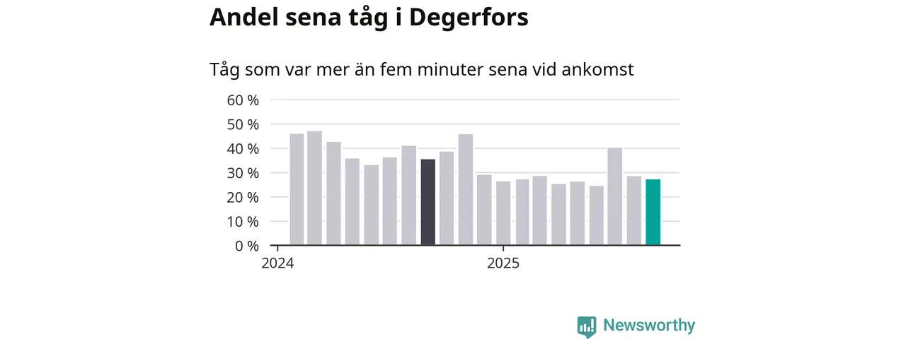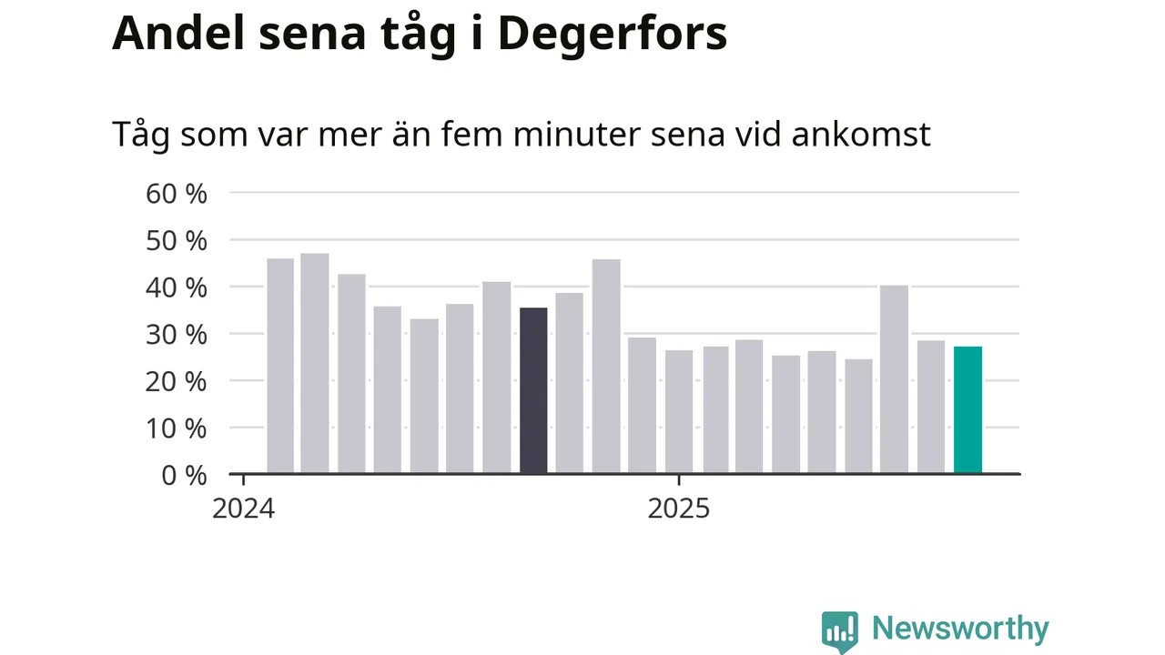 27 procent kan jämföras med 28 procent månaden innan, och 35 procent i september 2024. Siffrorna bygger på realtidsinformation om tågavgångar och ankomster från Trafikverket, som Newsworthy löpande samlar in.