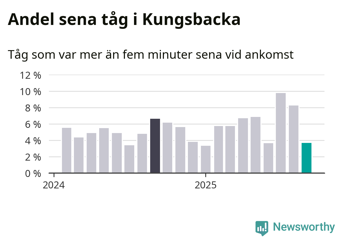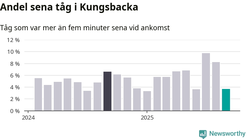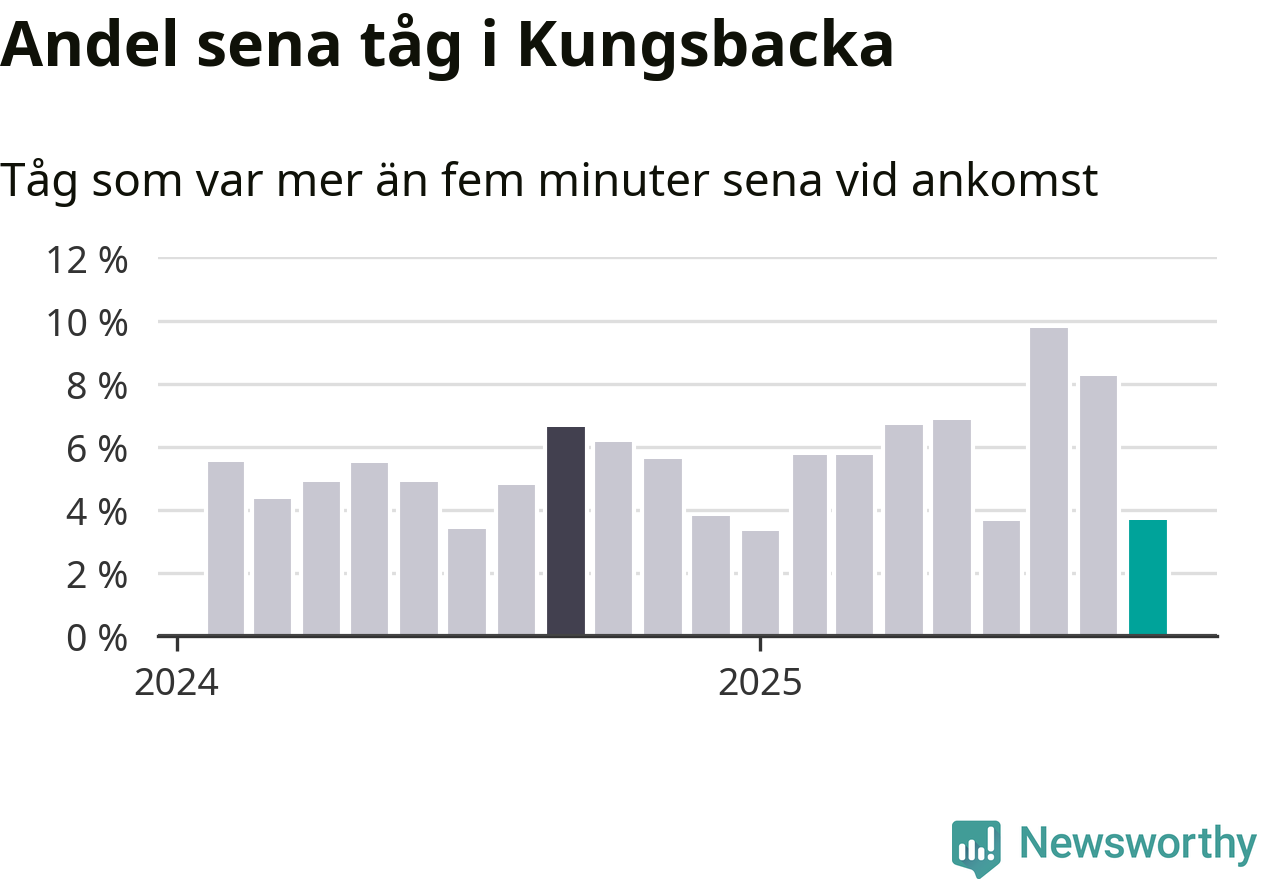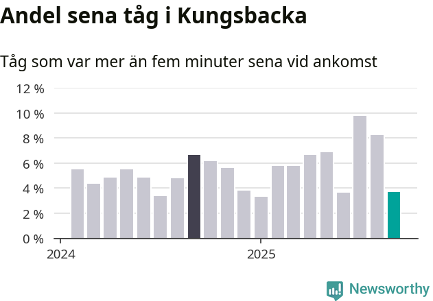 Fyra procent kan jämföras med åtta procent månaden innan, och sju procent i september 2024. Siffrorna bygger på realtidsinformation om tågavgångar och ankomster från Trafikverket, som Newsworthy löpande samlar in.