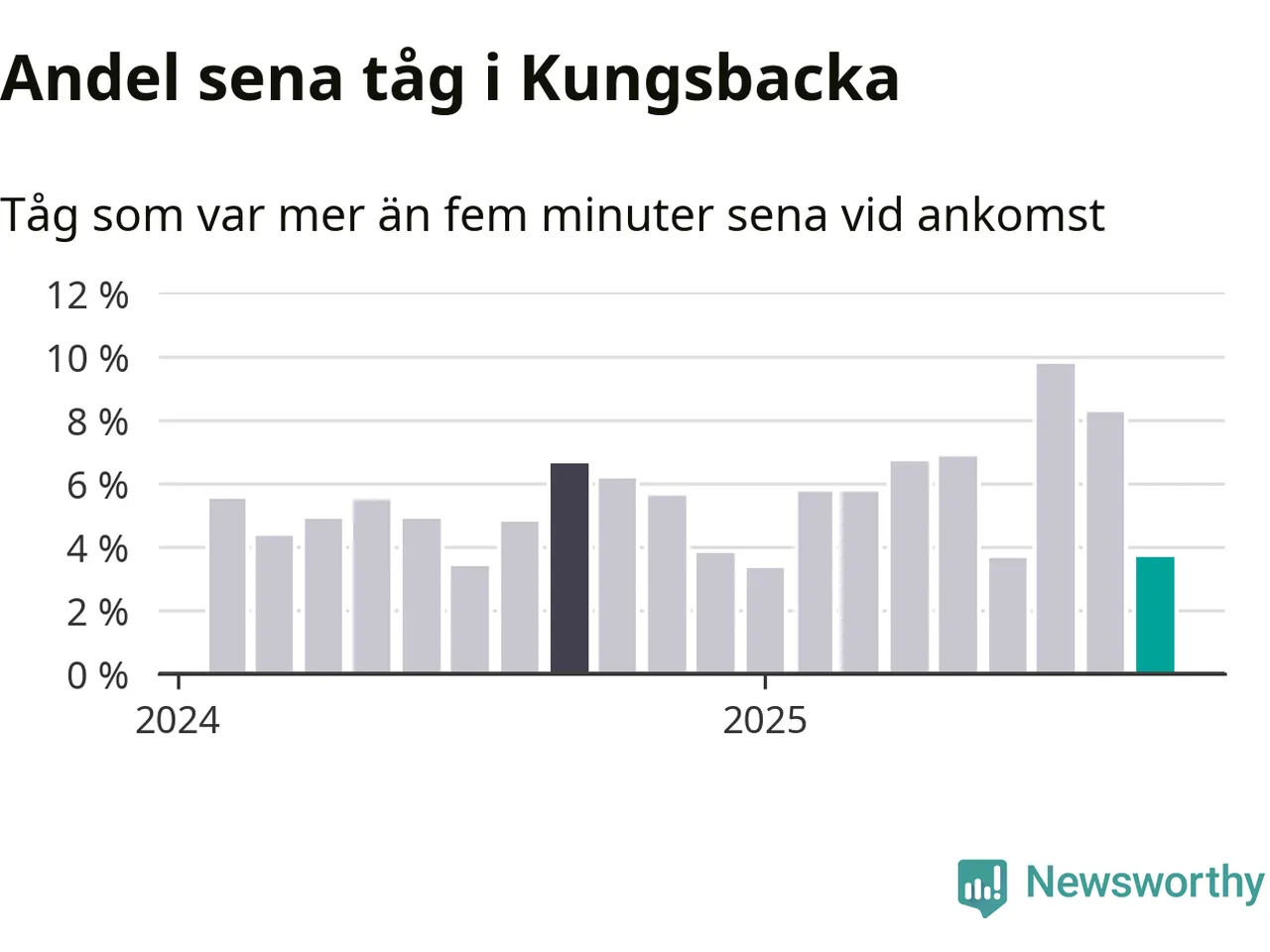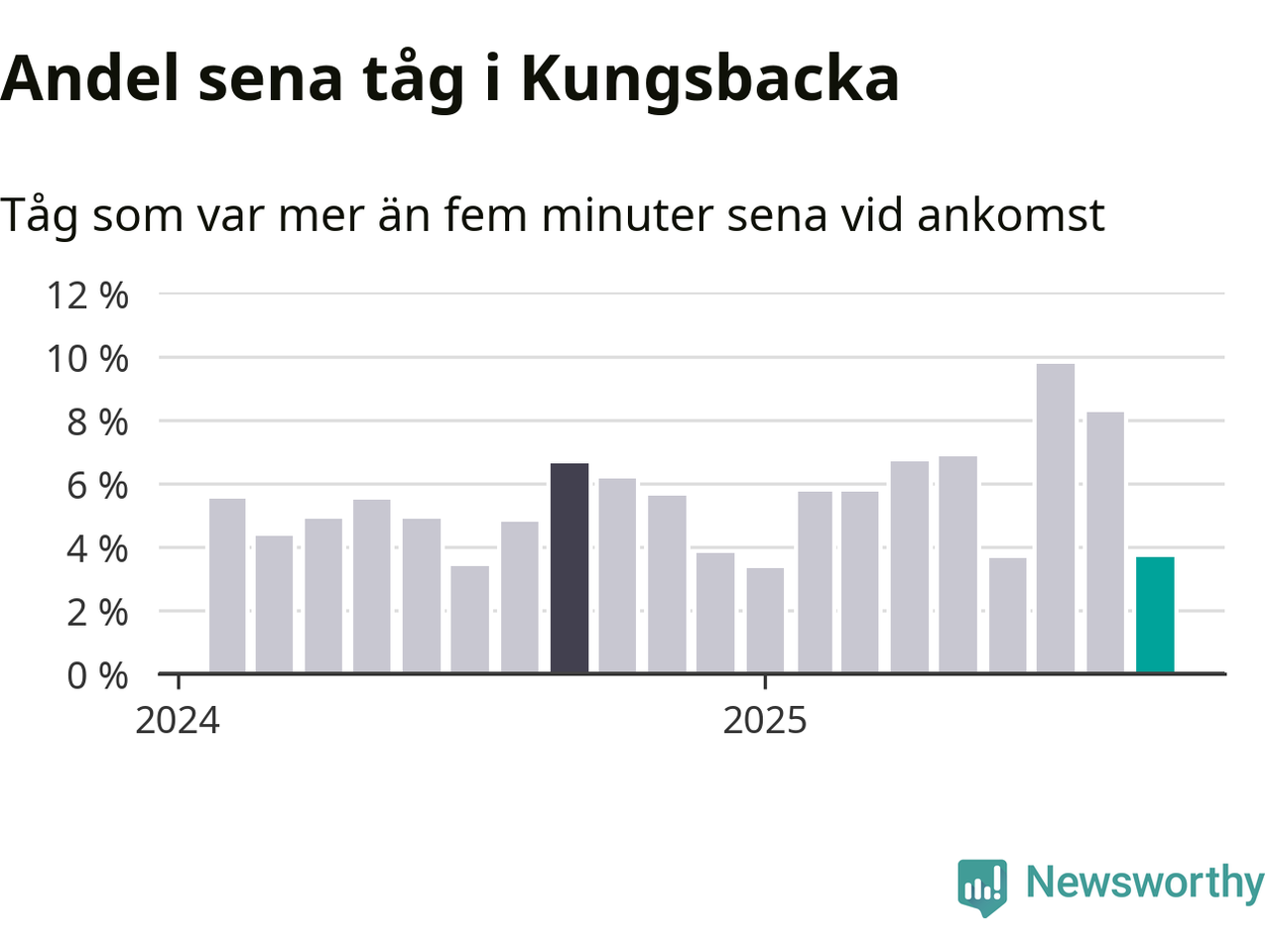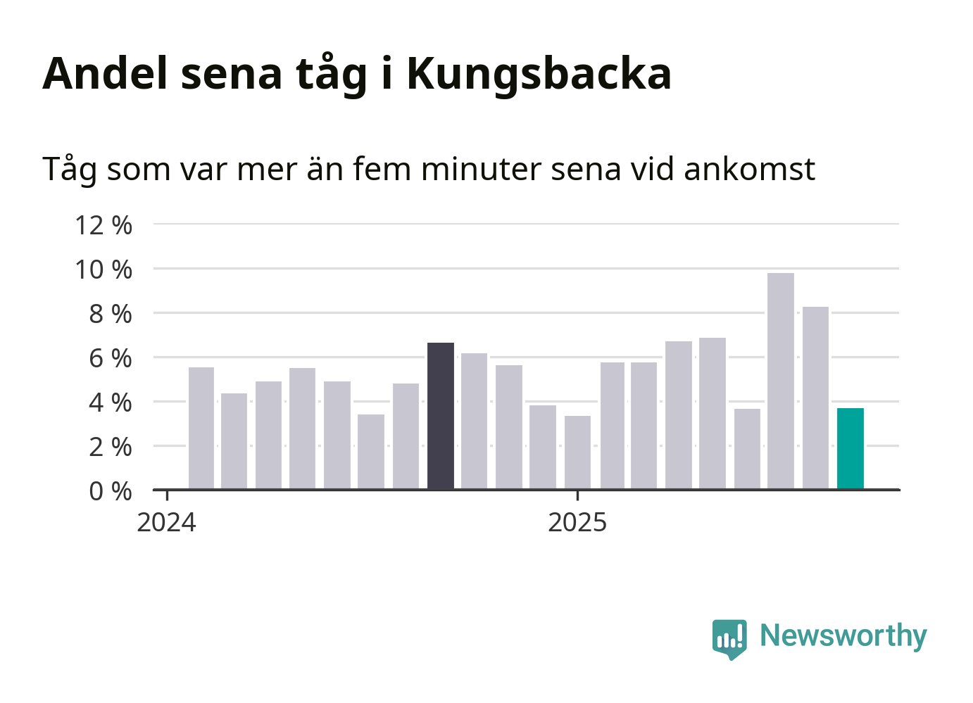 Fyra procent kan jämföras med åtta procent månaden innan, och sju procent i september 2024. Siffrorna bygger på realtidsinformation om tågavgångar och ankomster från Trafikverket, som Newsworthy löpande samlar in.