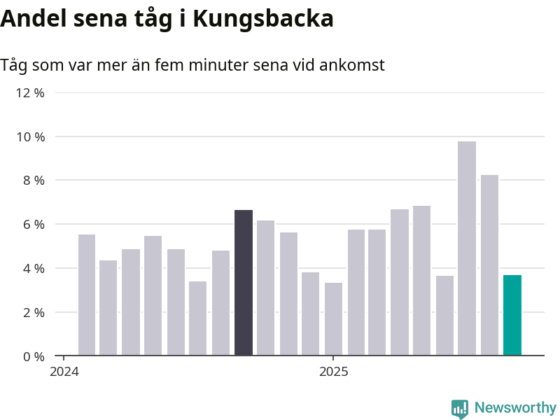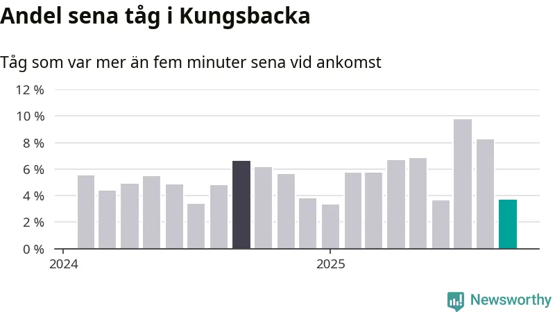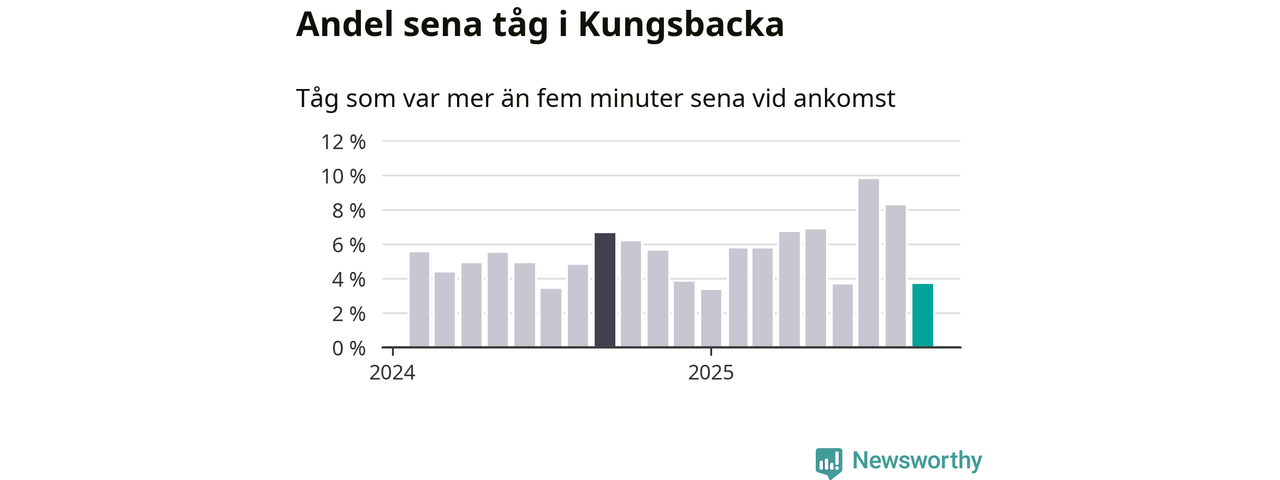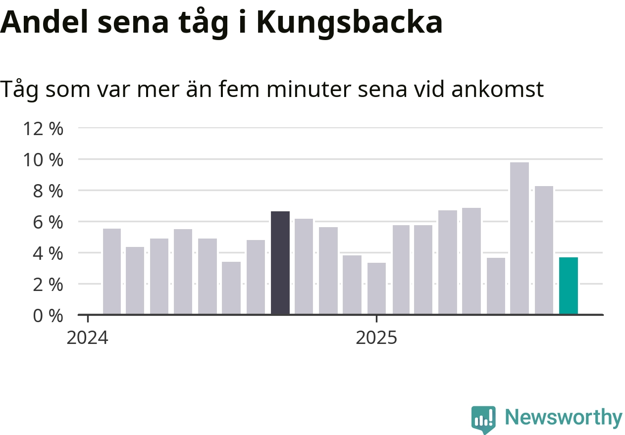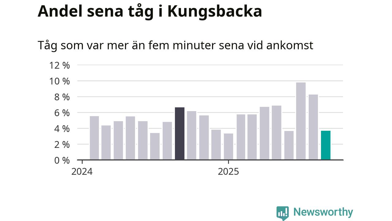 Av omkring 5 100 tåg som passerade någon av stationerna i Kungsbacka kommun i september var 187 mer än fem minuter sena. Det motsvarar 4 procent, vilket är bättre än den nationella målsättningen som säger att inte mer än fem procent av tågen ska vara sena.