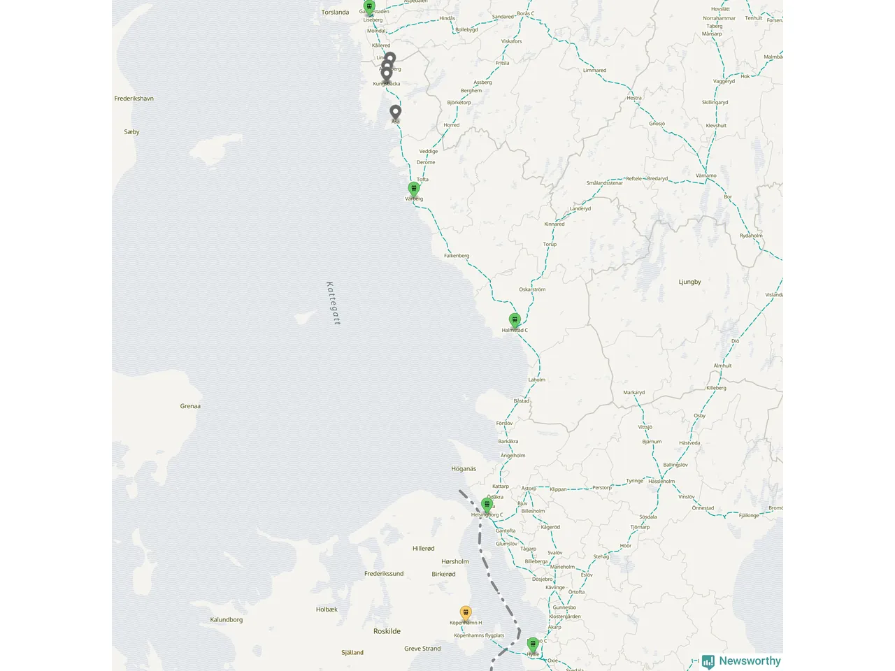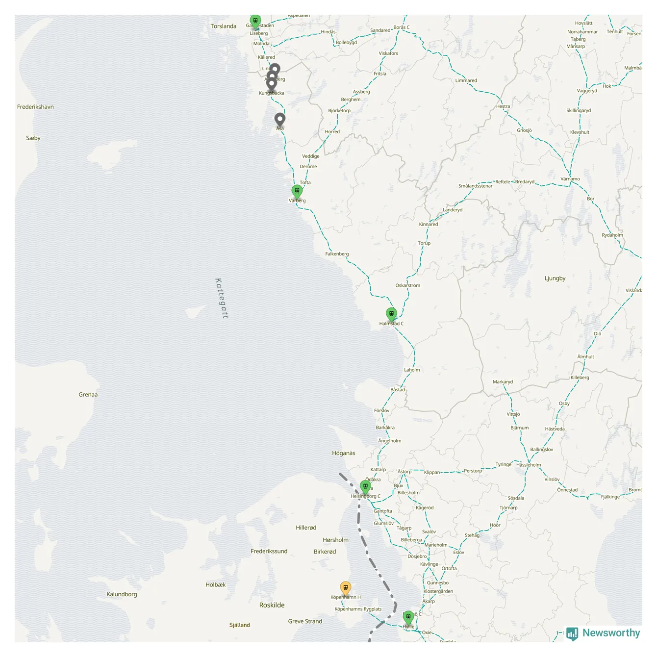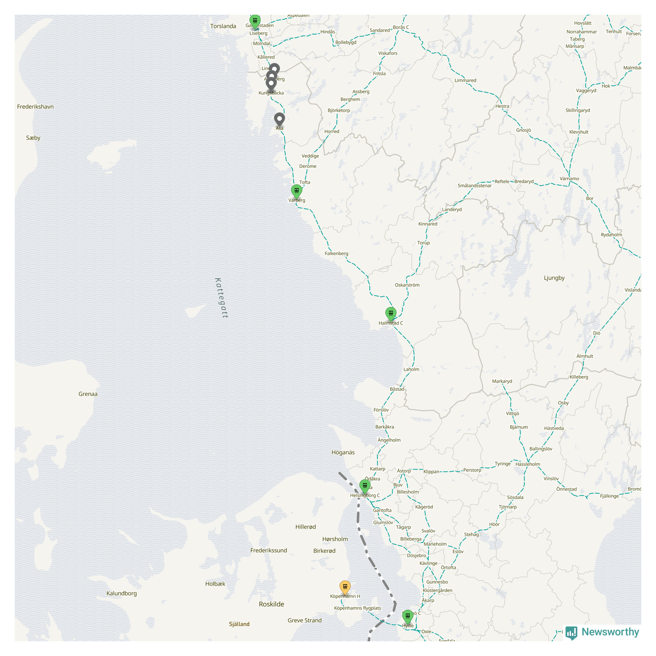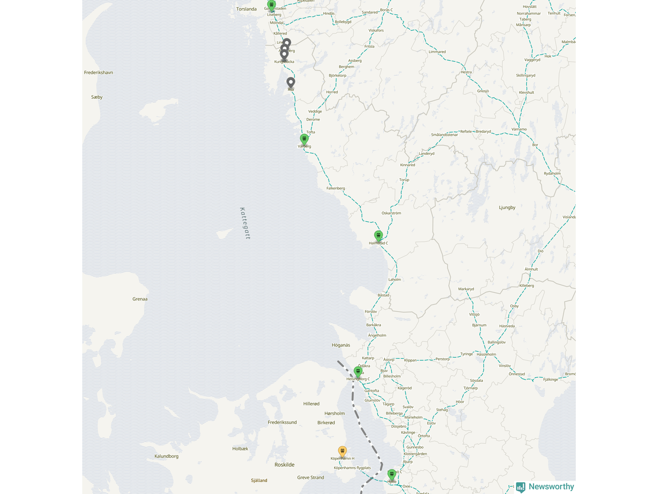 Kartdata från Mapbox, Newsworthy, OpenStreetMap och Trafikverket. Uppgifter om sträckor med passagerartrafik från jarnvag.net.